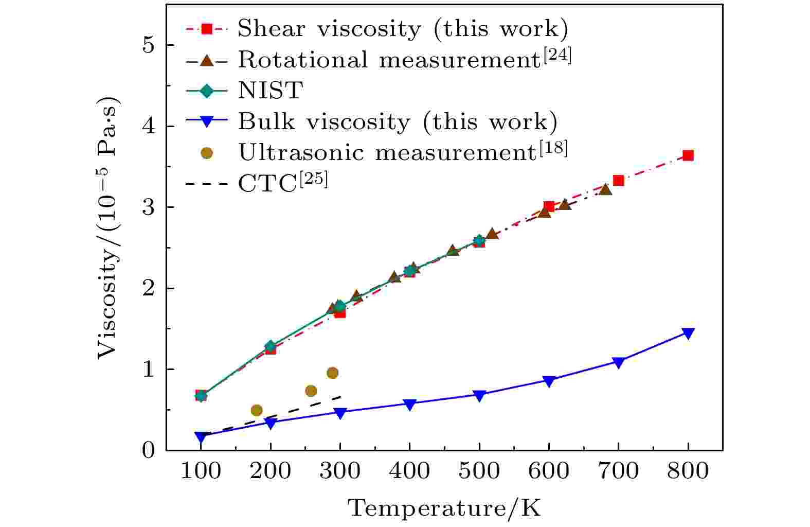本文结合密度泛函理论与平衡分子动力学模拟, 构建了从量子力学到连续介质力学的跨尺度耦合模型, 基于所建立的高精度势函数与Green-Kubo线性响应理论, 研究了极性分子CO气体在100—800 K温度范围内的剪切黏度与体积黏度. 分子动力学模拟基于C语言编程实现, 采用自适应时间步长算法以提高计算效率. 研究结果表明, CO的体积黏度结果对势函数敏感性明显高于剪切黏度, 不同传统方法因相应原因高估了体积黏度; 所得体积黏度随温度的变化相对于剪切黏度具有显著的非线性规律; 模型采用低体系压力与大体系规模可有效减小统计涨落幅度, 提高体积黏度计算的收敛性与可靠性. 本研究阐释了CO气体黏度的微观动力学机制, 同时可为高温非平衡流动(如高超声速边界层、等离子体输运等)黏度机理研究提供理论参考.