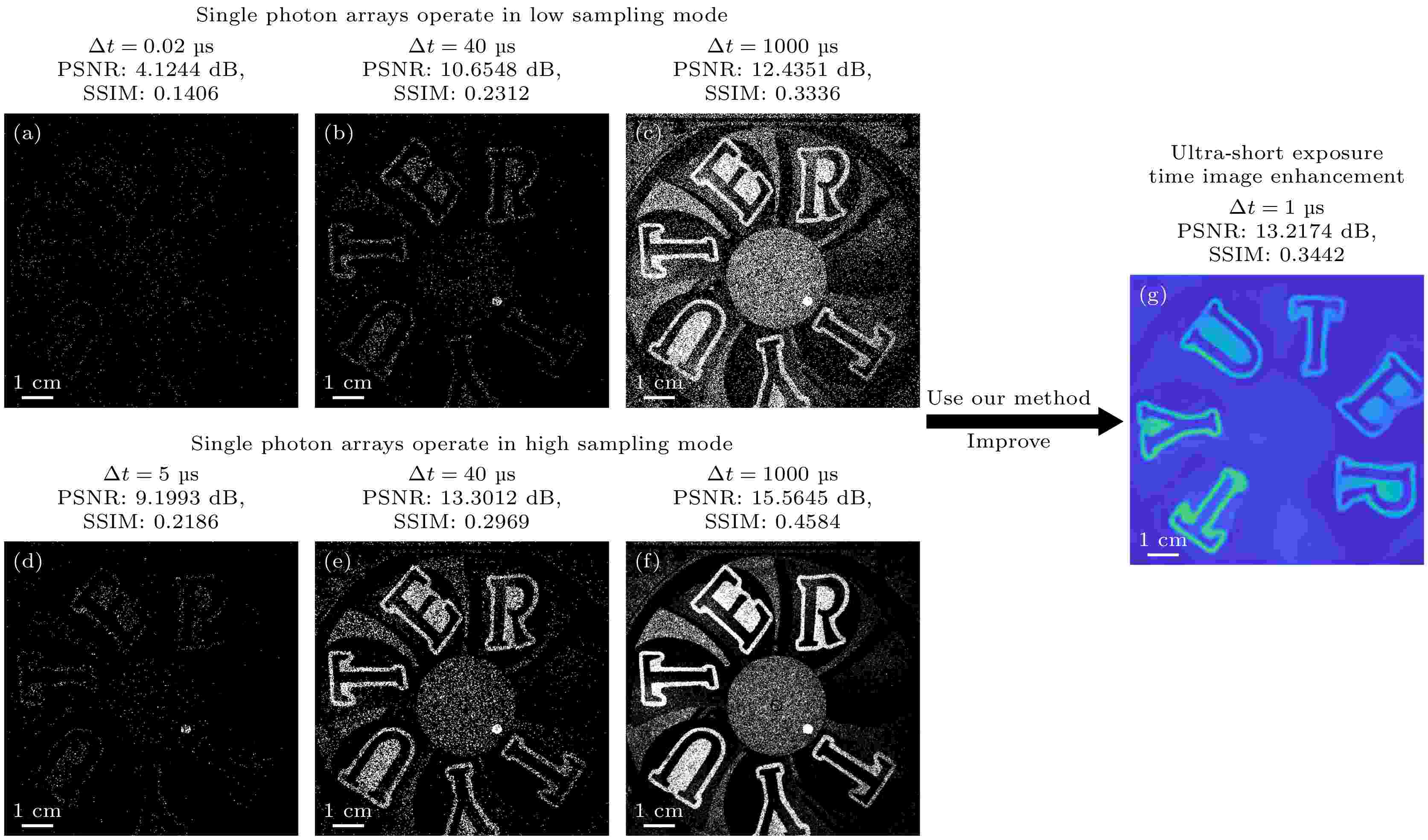 为突破单光子成像在极短曝光条件下成像质量与速率受限的问题, 本文提出一种融合超分辨深度学习的单光子成像增强神经网络, 实验上对单光子阵列在超快曝光时间下所获取的低信噪比图像进行增强重构, 实现了在低于0.5个光子通量条件下的高保真成像. 实验上实现了对微秒至毫秒曝光时间范围内512×512像素的单光子阵列高分辨成像, 并对μs量级短曝光时间下的目标图像进行重构. 通过构建的单光子增强深度神经网络可显著提升图像的峰值信噪比(PSNR+7.21 dB)和结构相似性指数(SSIM+0.34), 远高于传统超分辨方法(Bicubic)对低曝光图像超分辨增强重构(PSNR+0.49 dB/SSIM+0.05), 并有效补偿了超快曝光下的成像细节丢失. 并在成像曝光时间5 μs时, 成功实现了对5.19 km处无人机512×512像素的高分辨率弱光成像, 表明该方法在远距离目标成像良好的应用潜力.