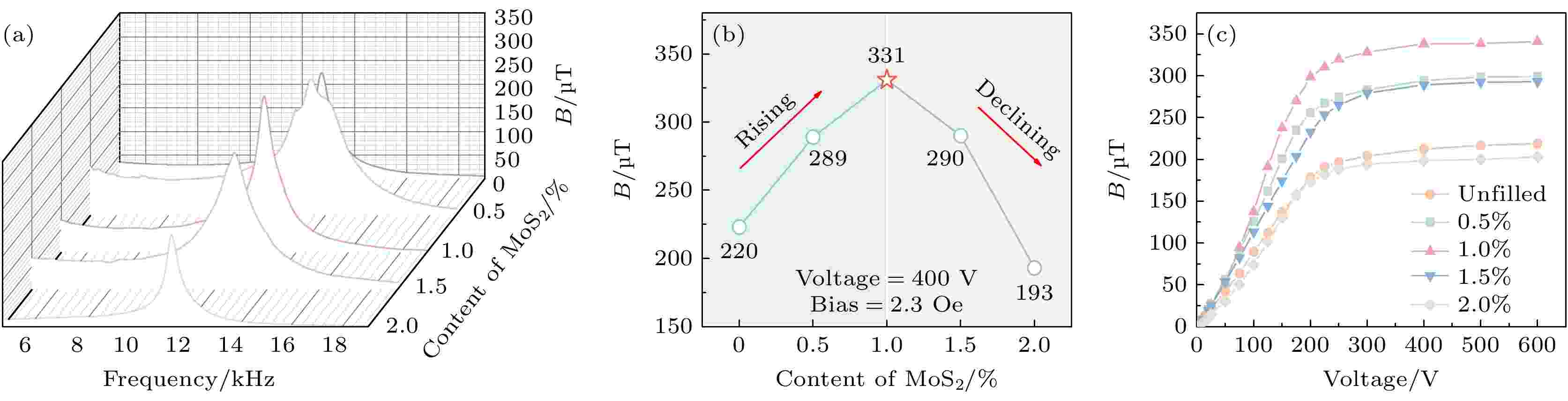 针对传统低频电天线存在的体积庞大与高功耗问题, 基于压电谐振原理的磁电天线展现出显著的优势. 然而, 磁电复合材料中的黏接层与压电相、铁磁相之间的声学阻抗失配现象, 严重阻碍了磁-机-电耦合过程中的应力传递效率, 进而限制了磁电复合材料的磁辐射强度. 为提升磁发射性能, 本文设计了一种高界面应力传递特性的磁电复合材料, 其具有类三明治的结构, 由Pb(Zr, Ti)O3压电纤维复合材料(macro fiber composite, MFC)压电层、均匀填充MoS2的环氧树脂黏接层, 以及FeBSi(Metglas)磁致伸缩层组成. 通过向黏接层引入二维填料MoS2, 有效改善了黏接层与铁电相、铁磁相之间的声阻抗匹配特性. 系统研究了MoS2填充量对PZT MFC/Metglas磁电复合材料磁发射强度的影响规律. 实验结果表明, 当MoS2填充质量分数为1%时, 该复合材料在最佳偏置磁场条件下的磁发射强度达到了331 μT, 相较于未填充MoS2的磁电复合材料提升了1.5倍; 在距离发射源1 m处, 磁发射强度可达2.7 nT. 结合声阻抗匹配理论, 深入探讨了电-机-磁耦合过程中的应力传递机制. 此外, 通过采用幅移键控调制技术, 验证了基于MoS2改性的PZT MFC/Metglas磁电复合材料在信号无损传输方面的有效性. 本研究提出的黏接层优化方法, 为通过增强应力传递效率提升磁电响应性能提供了一种简便高效的技术途径, 同时为低频水下通信、地下传感以及分布式无线网络等小型通信系统的发展提供了新的技术方案与理论支撑.