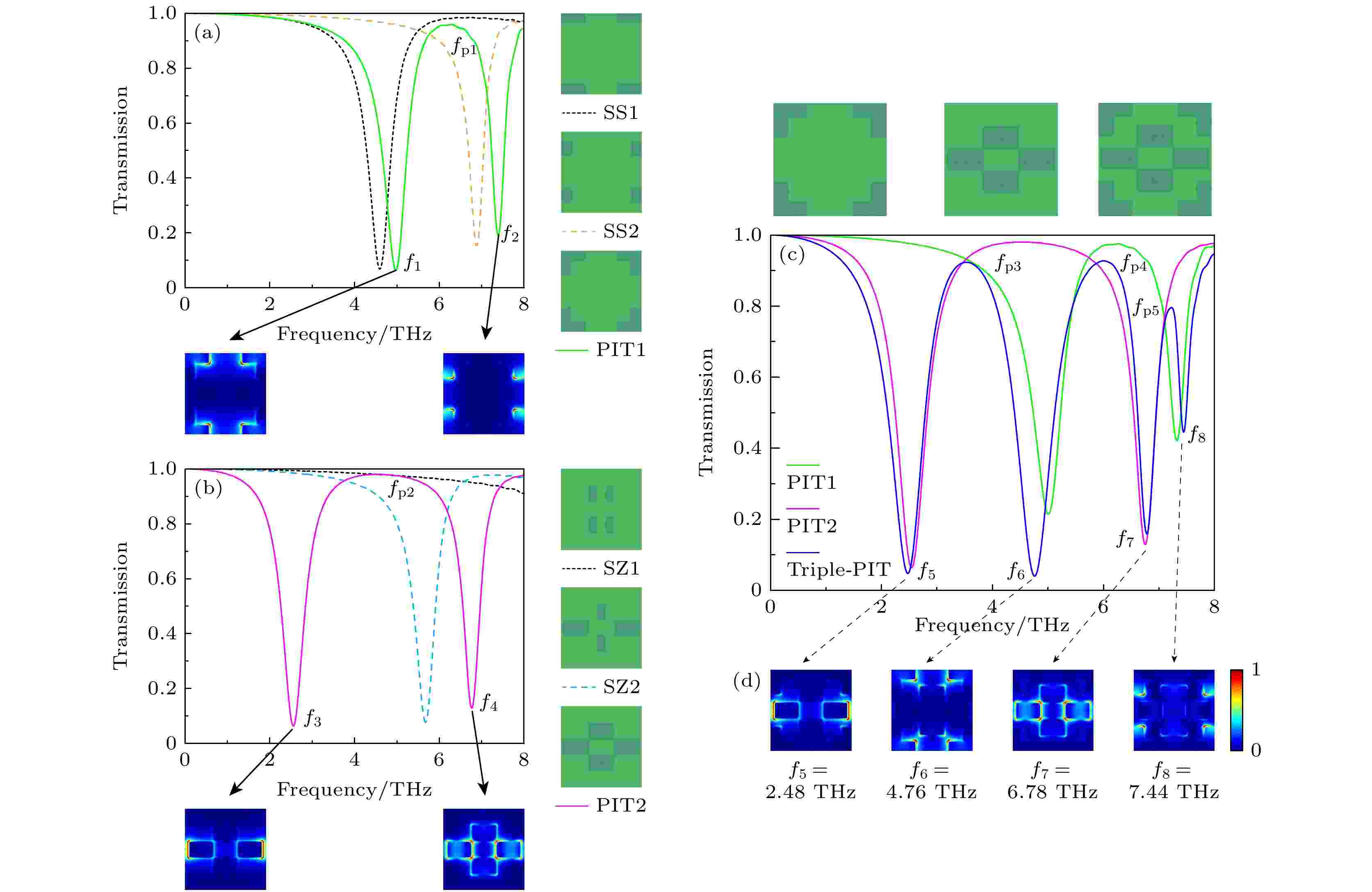 传统等离子体诱导透明(plasmon induced transparency, PIT)受限于多种明暗模式间的耦合机制. 为了突破该机制的局限性, 本研究提出了一种双偏振石墨烯超表面结构, 该结构由4组对称L型石墨烯环绕十字形中空石墨烯组成, 通过两个单PIT之间的协同效应形成了三重PIT. 研究发现, 通过费米能级和载流子迁移率的调制, 该结构作为慢光器件展现出高达500的群折射率, 具备优异的慢光调控能力. 作为偏振器件, 该结构具有双偏振特性, 在x和y偏振光入射下均能产生三重PIT窗口. 特别的是, 共振频率f6不受入射光偏振方向的影响. 这种在不同偏振光下均具有良好的稳定性和抗干扰能力对偏振器件的设计尤为重要. 因此, 本研究设计了一种慢光调控和偏振选择于一体的多功能集成器件, 为基于偏振不敏感的协同效应提供了新的理论指导和研究方向.