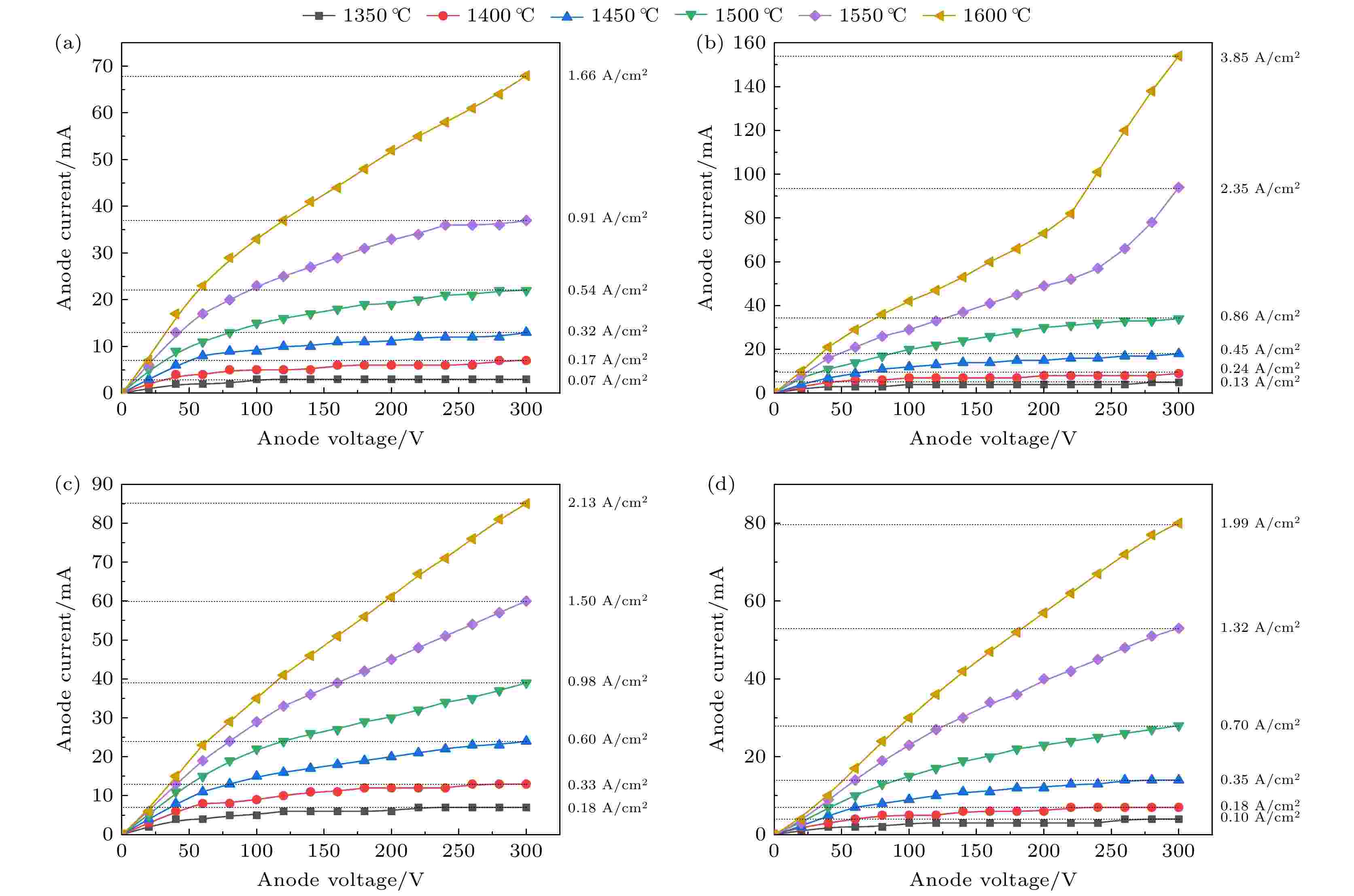 为了提高磁控管用稀土难熔钇盐阴极的热发射能力, 探索Sc2O3掺杂对稀土难熔钇盐阴极热发射性能的影响机理, 采用Sc2O3掺杂稀土难熔钇盐来制备阴极, 并测试该阴极的热发射性能. 热发射测试结果表明, Sc2O3掺杂能够有效地提高稀土难熔钇盐阴极的热发射能力. 其中, 3% Sc2O3 (3%为质量分数, 后同)掺杂能够最大程度地提高阴极的热发射能力, 当阳压为300 V, 温度为1600 ℃时, 3% Sc2O3掺杂阴极可以支取3.85 A/cm2的热发射电流. 而在相同条件下, 未掺杂Sc2O3阴极, 即稀土难熔钇盐阴极仅可以支取1.66 A/cm2的热发射电流, 3% Sc2O3掺杂能够将该阴极的热发射能力提升132%. 寿命试验结果表明, 当负载电流为0.5 A/cm2, 温度为1500 ℃时, 3% Sc2O3掺杂阴极的试验寿命已经超过4200 h, 且没有明显的衰减迹象. 最后, 利用扫描电子显微镜、能谱仪、X射线衍射仪、扫描俄歇纳米探针等对阴极进行详细分析. 结果表明, 热发射测试过程中, 一方面, 掺杂的Sc2O3和Y2Hf2O7发生了置换固溶反应, 生成了ScxY(2–x)Hf2O[7+(3/2)x]固溶体, 造成Y2Hf2O7晶格畸变, 导致晶格处于高能状态, 降低了阴极表面的逸出功, 与此同时, Sc2O3中的Sc置换掉了Y2Hf2O7晶胞中Y, 被置换出来的Y以金属单质形式存在, 改善了阴极表面的导电性. 另一方面, ScxY(2–x)Hf2O[7+(3/2)x]固溶体中会产生一定数量的Vo2+氧空位和自由电子, 也使得阴极表面的导电性能得到改善. 最终, 在这两方面的共同作用下, 阴极的热发射能力得到显著的提高.