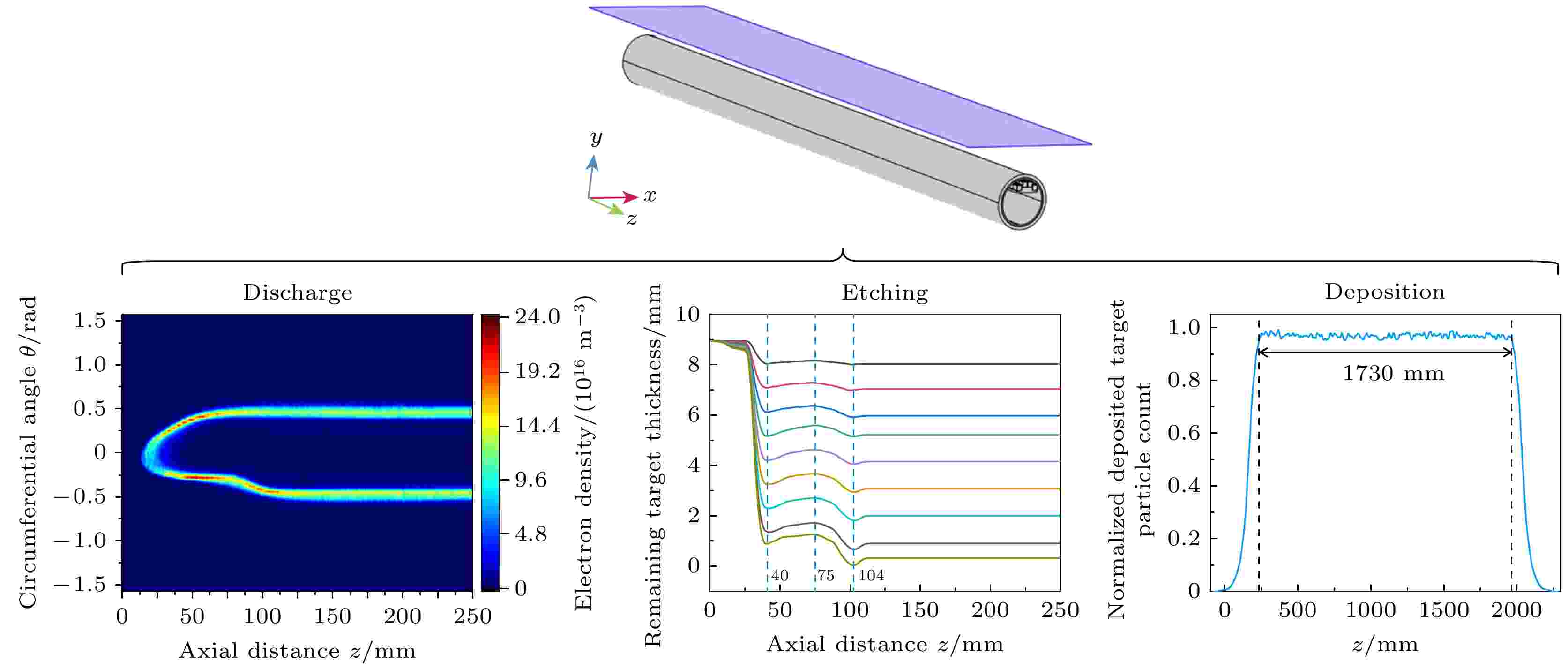 旋转圆柱阴极具有较高的理论靶材利用率, 已经普遍应用于各行各业的薄膜制备中. 在其等离子体研究方面, 相对于平面阴极, 旋转圆柱阴极的等离子体放电输运过程涉及三维体系, 对此传统模型的计算量大且收敛性差, 导致仿真困难. 鉴于此, 本文利用二维粒子网格/蒙特卡罗模型计算得到的等离子体密度和电势分布作为自洽背景场, 再通过三维检验电子蒙特卡罗方法跟踪电子运动实现三维等离子体放电仿真. 在此基础上, 以等离子体密度投影作为刻蚀通量, 耦合元胞自动机方法和检验粒子蒙特卡罗方法分别实现三维靶材刻蚀和粒子沉积仿真, 从而构建了阴极磁场-等离子体放电-靶材刻蚀-薄膜沉积的全链条三维仿真体系. 结果表明, 该三维仿真体系能够精准预测圆柱阴极的工作状态, 其中靶材利用率为85.81%, 与实际误差低于2%; 沉积In/Sn摩尔比为11.76, 与实际相差6.6%; 载板上粒子分布与实际薄膜厚度分布吻合, 沉积均匀区长度为1730 mm, 与实际误差仅为1.1%.