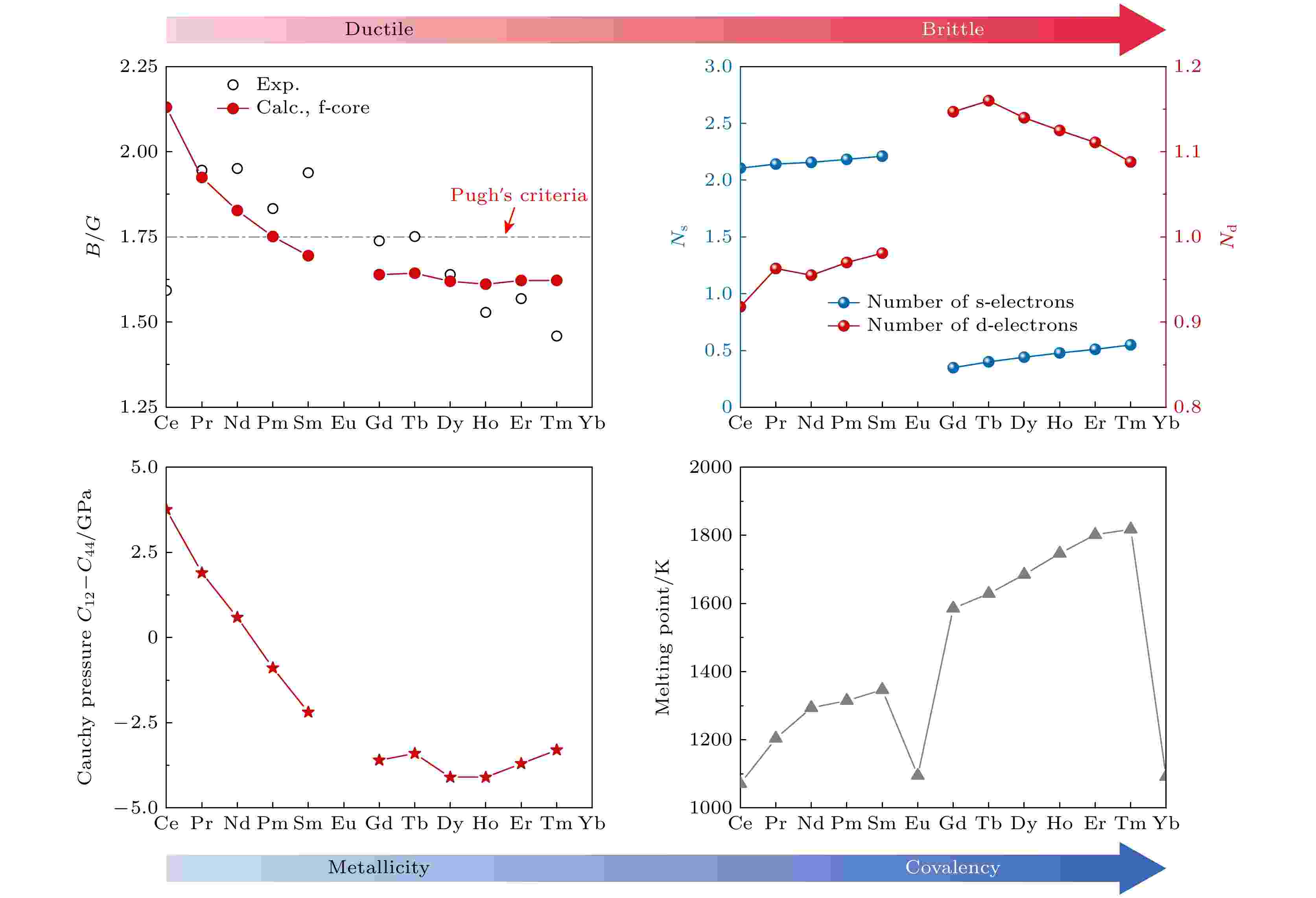 稀土金属在工程技术领域具有重要应用, 同时因其与f电子相关的独特行为受到凝聚态物理的广泛关注. 本文结合第一性原理计算与数据汇编, 对稀土金属的弹性性质随原子序数变化开展分析, 并以Ce和Yb为例, 对高压0—15 GPa范围内的弹性演化进行研究讨论, 对比了不同f电子处理方法的模拟表现. 结果表明, 稀土金属随原子序数变化存在明显的延展性差异, 在压力作用下的相变处弹性性质会发生显著改变. 特别是, 在Ce的fcc同构相变和Yb的fcc-bcc相变中出现脆、延性转变. 这些与随原子序数或压力条件改变发生的成键特性变化密切相关. 此外, 研究发现, 将f电子作为芯层电子处理的模拟方法能够较好地描述稀土金属在常压下的弹性性质, 但在描述高压下的结构相变及弹性性质演化趋势时, 将f电子作为价电子并考虑电子关联效应修正的处理方法则更为有效. 本文数据集可在https://doi.org/10.57760/sciencedb.j00213.00150 中访问获取.