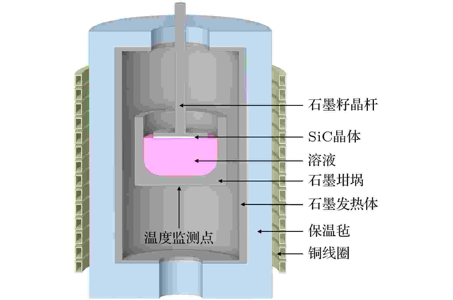 溶液法是生长低缺陷高品质碳化硅(SiC)单晶的重要方法, 针对6英寸溶液法生长SiC单晶系统, 建立了感应加热和热质传递全局数值分析模型, 考虑了洛伦兹力、离心力、热浮力以及表面张力对溶液流动的耦合作用, 研究了晶体旋转对溶液中速度场、温度场、碳浓度场、晶体生长速率以及坩埚壁面碳溶解析出的影响规律. 结果表明, 溶液中洛伦兹力的存在使得低晶体转速下的流场十分复杂, 晶体转速需要控制在合适的范围内, 使得生长界面下方由输运决定的碳浓度分布与生长界面处由温度决定的碳浓度分布相协调, 才能获得均匀且高的SiC单晶生长速率. 晶体转速过小使得SiC单晶生长速率很低, 过大导致生长速率径向均匀性下降, 转速为25 r/min时SiC单晶的平均生长速率较高且沿径向分布均匀性较好. 进一步分析了溶液-坩埚交界面碳组分的溶解和析出, 定位了坩埚壁面溶解较快区域和SiC多晶颗粒生成区域, 并结合速度场预测了多晶颗粒的去向. 研究结果为溶液法生长6英寸SiC单晶提供了科学依据.