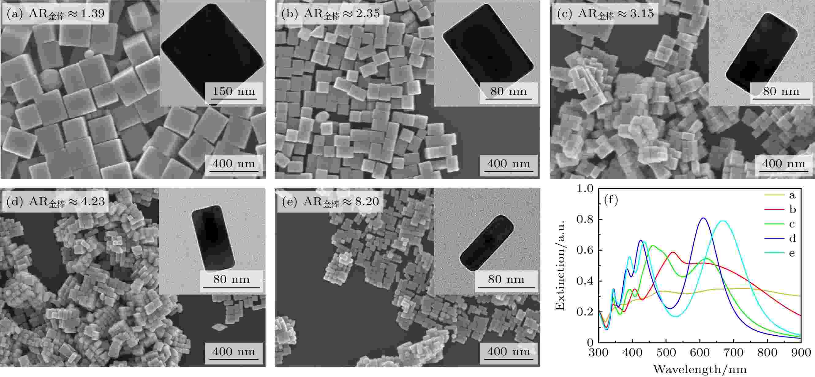 金核银壳(Au@Ag)纳米颗粒兼具金的稳定性、生物相容性及银的优异电磁响应特性, 在纳米医学、环境保护、传感和光学等领域具有重要应用价值. Au@Ag纳米长方体因其结构的各向异性, 特别是表面等离激元共振(SPR)效应, 在基础科学研究中扮演着重要角色. 本研究通过晶种法, 即在水相中调控Au纳米棒种子的尺寸、长径比(AR)及Ag前驱体用量, 制备了形貌、尺寸与光学性质均可控的Au@Ag纳米长方体. 实验表明, 当Au纳米棒直径大于100 nm时, Au@Ag纳米长方体的顶角出现截断; 当Au纳米棒直径小于100 nm时, Au@Ag纳米长方体的顶角随Au纳米棒AR的减小而变得更尖(~90°). 值得注意的是, 当Au纳米棒的AR在一定范围内(~1.39—3.15)时, 均可生长形貌良好(顶角尖锐)的Au@Ag纳米长方体, 这一发现为研究纳米长方体顶角的变化提供了一定参考. 另外, 纳米长方体的长度(~110 nm—141 nm)与宽度(~60 nm—104 nm)可通过调节硝酸银的量实现精准调控. 同时, 模拟计算结果表明, 相对于纳米棒而言, Au@Ag纳米长方体不仅具有丰富的多级SPR模式, 其尖角可产生巨大的电场增强. 本研究进一步拓展了其在多个高科技产业中的应用前景.
