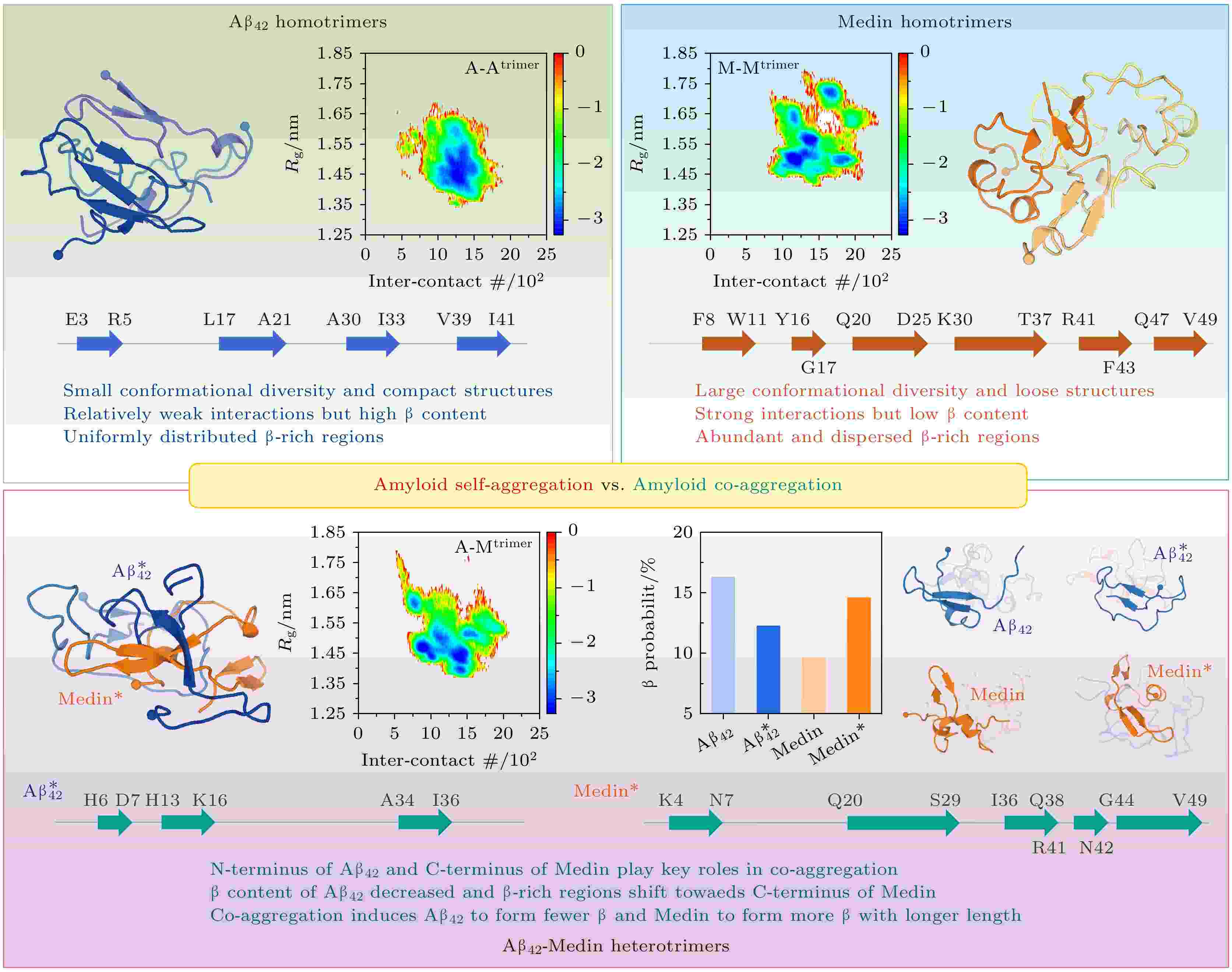 Medin淀粉样蛋白的聚集导致动脉壁退化和脑血管功能障碍, 参与多种血管疾病的发生与发展. 在血管性痴呆或阿尔茨海默病患者的脑小动脉中发现Medin聚集体增加, 且Medin与血管β-淀粉样蛋白(Aβ)沉积物共定位. 实验证实Medin能够与Aβ共同形成异源纤维, 并通过交叉接种机制调控Aβ的聚集. 然而, Medin与Aβ共聚集的微观机制仍不清楚. 本文利用大规模的全原子副本交换分子动力学模拟(累计模拟时间72 μs), 对Aβ42与Medin三聚体在不同多肽环境(即自聚集vs.共聚集)的相互作用及构象分布进行了研究. 结果表明, Aβ42与Medin的亲和力更高, Aβ42与Medin在自身或彼此结合时具有相似的分子识别位点或区域, 为共聚集提供基础. Aβ42的N端与Medin的C端在Aβ42-Medin交叉聚集中起到关键作用. 更重要的是, 共聚集显著地改变了Aβ42与Medin的相互作用强度、方式以及结构特征. Aβ42-Medin三聚体中, Aβ42分子间相互作用减弱, 仅保留疏水核心区域(16KLVFFA21)之间的结合而提高其他区域的自由度; Medin形成更多的β结构与更少的helix结构, 但Aβ42却形成更多的helix与更少的β; 而Medin中高β倾向性区域向肽链中部和C端迁移, 表明Medin可能通过C端形成β结构作为核心从而驱动其与Aβ42的协同聚集. 本工作在原子水平上详尽地阐明了共聚集对Aβ42与Medin相互作用与结构特征的影响, 为理解Aβ42-Medin共聚集分子机制以及不同疾病之间交叉关联的病理机制提供了有益见解.