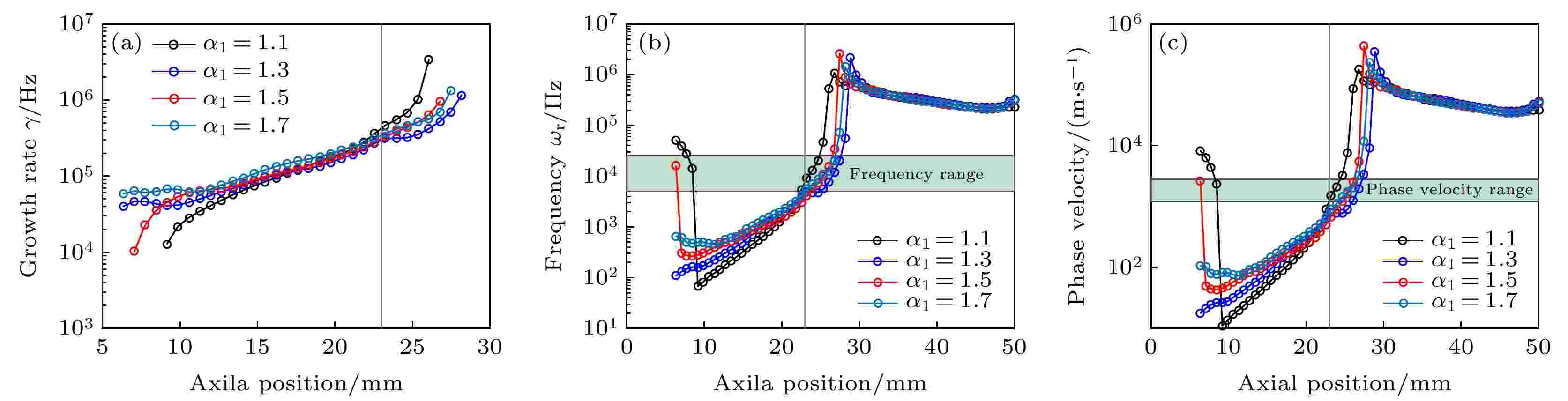 旋转辐条作为一种低频、长波长不稳定性, 广泛存在于磁控管、霍尔推力器等${\boldsymbol{E}} \times {\boldsymbol{B}}$放电装置中. 霍尔推力器中旋转辐条表现为位于放电通道中的明亮发光区域沿着角向旋转. 旋转辐条不稳定性引起的空间电势扭曲, 提高了在${\boldsymbol{E}} \times {\boldsymbol{B}}$作用下沿电势等势线漂移运动的电子到达阳极的概率, 增加了电子的轴向输运. 本文利用轴向-角向的二维粒子-流体混合模型研究了霍尔推力器放电通道中的轴向磁场梯度对旋转辐条不稳定性的影响. 采用包含等离子体密度梯度和磁场梯度效应的色散关系, 结合模拟得到的离子密度分布、电势分布、电场分布对模拟结果进行分析. 模拟结果表明, 随着放电通道内磁场梯度的减小, 模数$m = 1$的旋转辐条不稳定性的频率和传播速度会轻微的增大, 但不会对旋转辐条的传播方向和本质特征产生影响. 结合色散关系的分析结果表明, 密度梯度和磁场梯度共同驱动的角向漂移不稳定性是旋转辐条的诱发因素. 磁场改变引起的离子密度分布的变化对诱发旋转辐条的角向漂移不稳定性出现的轴向位置有轻微的影响, 但始终位于推力器出口下游附近. 结果表明旋转辐条不稳定性不属于电离不稳定性, 且改变放电通道内的磁场分布不会对旋转辐条的传播方向和模数产生影响. 本研究结果为明确旋转辐条的激发机制及其影响因素提供了理论支撑.