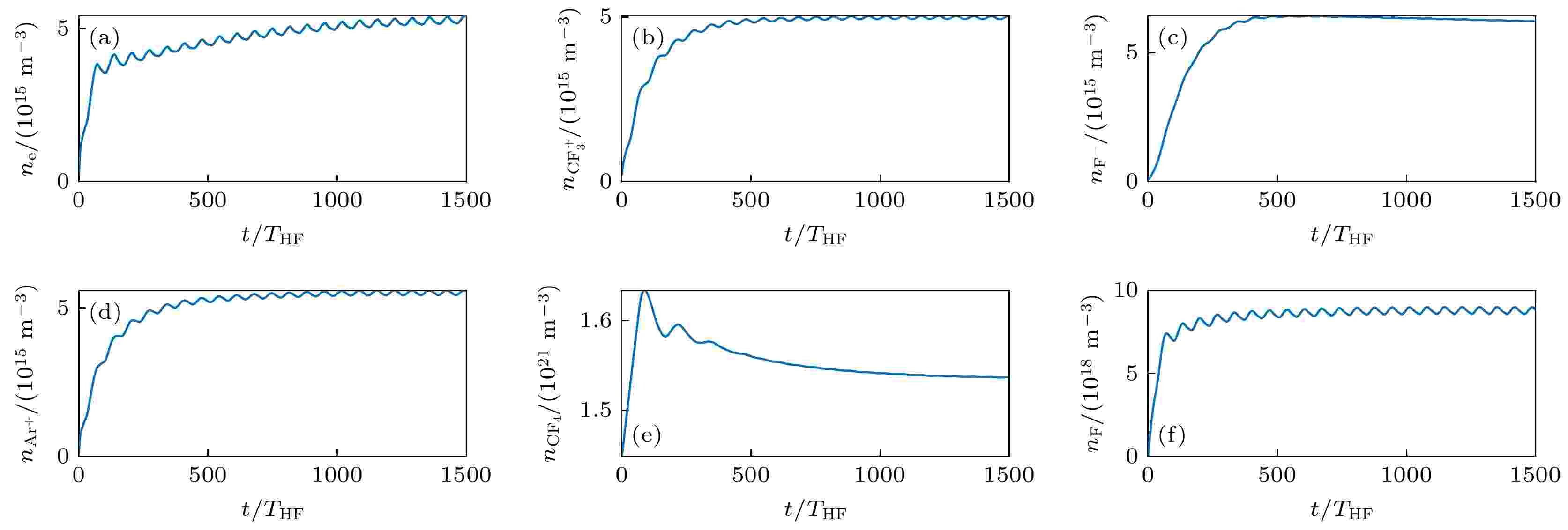 容性耦合等离子体源具备结构、造价低、能产生大面积均匀等离子体的优点, 被广泛应用于半导体芯片制造的刻蚀、沉积等工艺中. 为了满足先进生产工艺的需求, 人们常常需要对等离子体源实施流体模拟, 从而对等离子体的密度、均匀性等重要参数进行优化. 本文采用自主研发的容性耦合等离子体快速模拟程序对双频容性耦合Ar/CF4等离子体源进行了三维流体模拟, 以对程序在该问题中的有效性进行初步验证, 并研究气压、高低频电压、低频频率、气体组分比例等放电参数对等离子体产生的影响. 模拟结果显示, 该程序具有极高的模拟速度; 随着低频电压的增加, 等离子体密度先近似不变, 后显著增大, 而等离子体的均匀性先上升, 后显著下降, 在此过程中低频电源带来的γ模式加热逐渐增加, 直到取代高频电源的α模式加热成为主导; 随着低频频率的增加, 等离子体密度先近似不变, 后略微增大, 而等离子体的均匀性变化不大, 这是因为低频电源的γ模式加热与频率无关, 而α模式加热远远低于高频电源; 随着高频电压的增加, 等离子体密度显著增大, 而等离子体的均匀性先上升, 后显著下降, 在此过程中高频电源的α模式加热显著增强; 随着气压的增加, 等离子体密度明显增大, 同时等离子体的均匀性也明显上升, 原因是粒子与背景气体间碰撞更为充分; 随着背景气体中Ar比例的增加, 等离子体密度变化较小, Ar相关粒子的密度总体呈上升趋势, CF4相关粒子的密度总体呈下降趋势, 但部分粒子的密度变化存在非单调的情况, 这体现了部分组分的电离、解离间具有相互促进的作用.