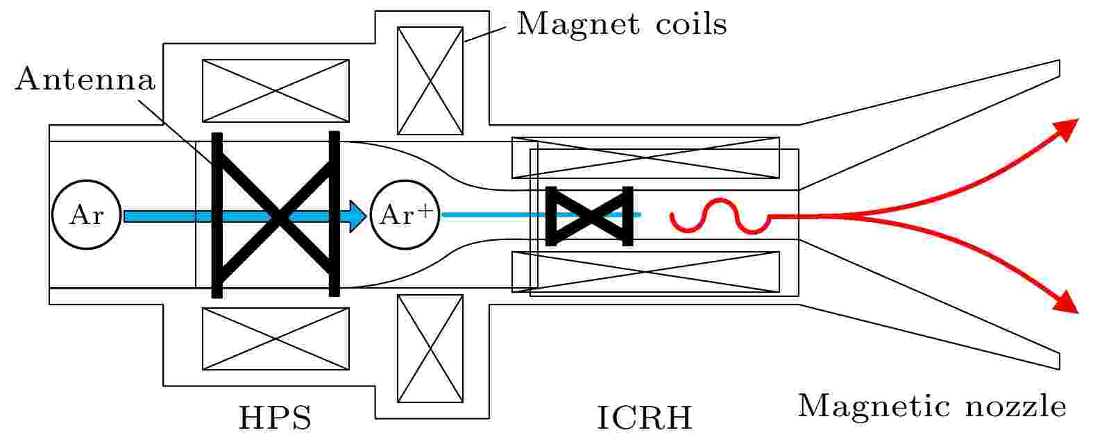 可变比冲磁等离子体发动机具有大推力、高比冲、长寿命、可变比冲、和高效率等技术优势, 是未来深空探测、载人航天所必需的先进动力装置. 可变比冲磁等离子体发动机内螺旋波等离子体源与离子回旋共振单元相互串联, 探究发动机内电离过程对离子加热过程的影响规律对发动机性能测试与优化具有重要意义. 本文建立了串联螺旋波等离子体源与离子回旋共振单元的多组分流体模型, 并在不同螺旋波等离子体源输入电流与气压条件下进行了数值模拟, 探究了螺旋波等离子体源工作状态对离子回旋共振单元离子能量密度的影响规律. 研究结果表明: 螺旋波等离子体源放电模式随输入电流与背景气压增大逐渐转变, 计算区域内等离子体密度与离子回旋共振单元内的离子能量密度出现跳变现象; 在本文模型及输入条件下, 螺旋波等离子体源中的工质电离过程与离子回旋共振单元的离子加热过程是解耦的, 螺旋波等离子体源的工作模式并不影响单个离子通过离子回旋共振单元所获得的能量增益, 发动机进而可以实现多模态工作.