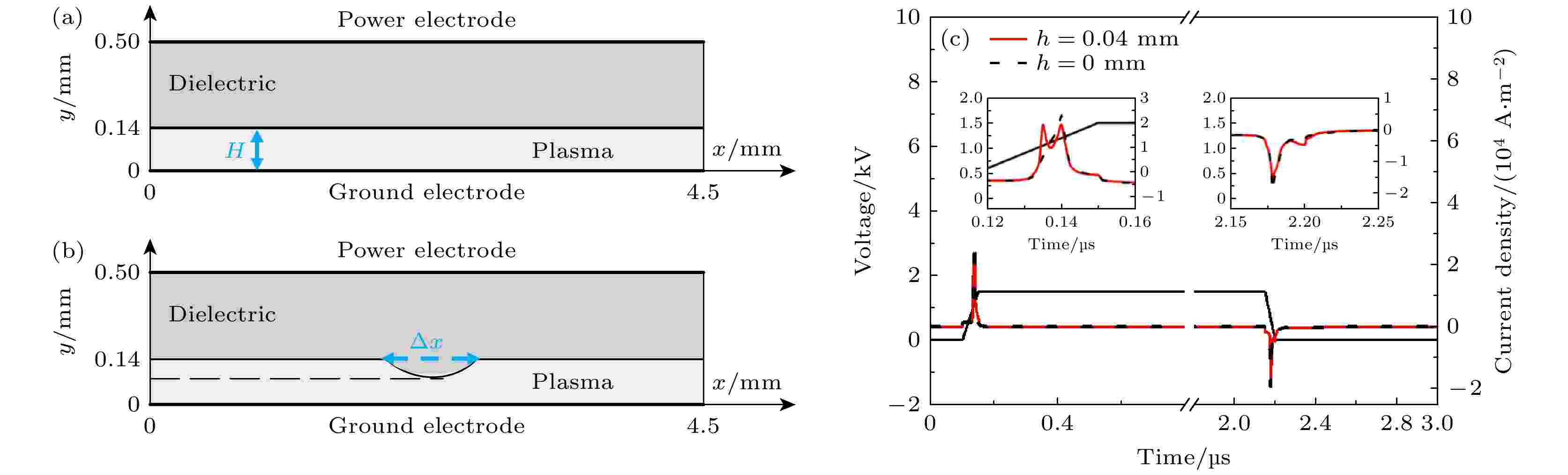 本文基于二维流体模型, 以平行板结构为基础, 对高压电极介质表面具有微结构的大气压氧气脉冲放电进行了研究, 重点分析了微结构诱导的混合放电及其增强机制. 微结构的存在导致放电过程中电场畸变, 电子在横向电场的作用下被局域束缚在微结构下方区域, 放电呈现出电晕模式; 同时由于凸起微结构的存在, 该处放电间隙减小, 纵向电场显著增强, 从而引起微结构下方电晕放电与两侧平板放电产生放电时间上的不一致性. 随着表面凸起微结构几何参数的增大, 可进一步诱发二次放电. 仿真结果表明, 电晕放电的存在有效提高了电子密度、电子温度及高能电子的数量占比, 增强了放电; 高凸起条件电晕放电受到抑制的情况下, 二次放电的产生, 有效提高了高能电子的数量占比及空间内活性氧原子的平均数密度. 这些发现为微结构引发的放电增强微观机制提供了深刻见解, 为设计高效的等离子体装置提供理论基础.