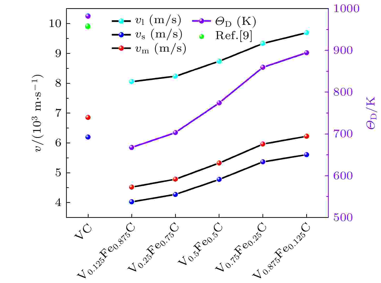 钒碳化物通常作为金属材料的增强相, 其弹性和延展-脆性特性对于力学性能至关重要. 本研究基于特殊准随机结构(SQS)方法和第一性原理计算系统探讨了多组分V1–x FexC系碳化物的稳定性、电子结构、机械性能和热性质随元素Fe含量变化的规律. 研究结果表明, 5种组分(V0.125Fe0.875C, V0.25Fe0.75C, V0.5Fe0.5C, V0.75Fe0.25C和V0.875Fe0.125C)随着元素Fe含量的减小稳定性提高, V1–x FexC系碳化物键合类型以共价键、金属键和离子键的混合特征为主. 相较于V1–x FexC系其他碳化物, V0.875Fe0.125C由于具有高的共价键强度, 因此表现出高的弹性模量和硬度, 元素Fe的掺杂引入显著影响V1–x FexC碳化物的晶格振动模式和电子结构, V0.875Fe0.125C碳化物较高的德拜温度, 同样印证了其高温下优异的机械强度. 此外, 热导率的计算不仅指导V1–x FexC系碳化物的实验选择, 同时为开发高性能耐高温涂层提供重要的理论支持.