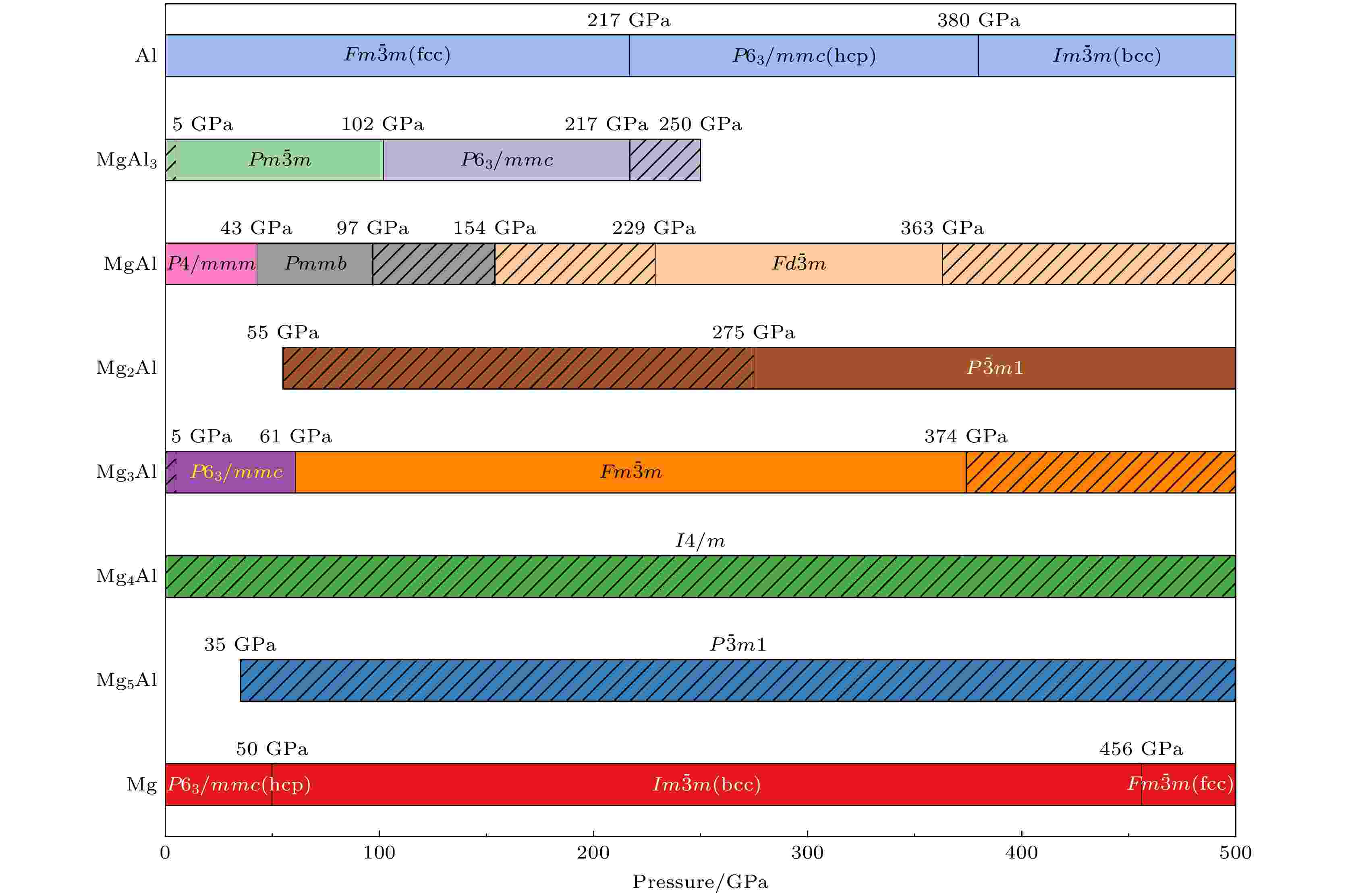 元素镁和铝是地壳中丰度较高且被广泛应用于工业工程中的金属材料, 其在高压下能以单质形式形成电子化合物, 导致丰富多彩的晶体结构和电子性质. 本研究采用第一性原理结构搜索方法系统地对0—500 GPa压力范围内镁铝合金的可能结构进行探索, 获得了8种可在不同压强范围下稳定存在的晶体结构和2种亚稳的富镁合金结构, 其中6种稳定结构具有电子化合物特征. 通过计算分析验证了电子化合物中间隙准原子对晶格振动特性的影响, 同时在富镁合金结构中发现铝原子具有独特的–5e超高氧化价态, 形成满壳层电子结构. 本研究丰富了镁铝合金的高压相图, 并为开发新型高压功能材料提供了理论参考.