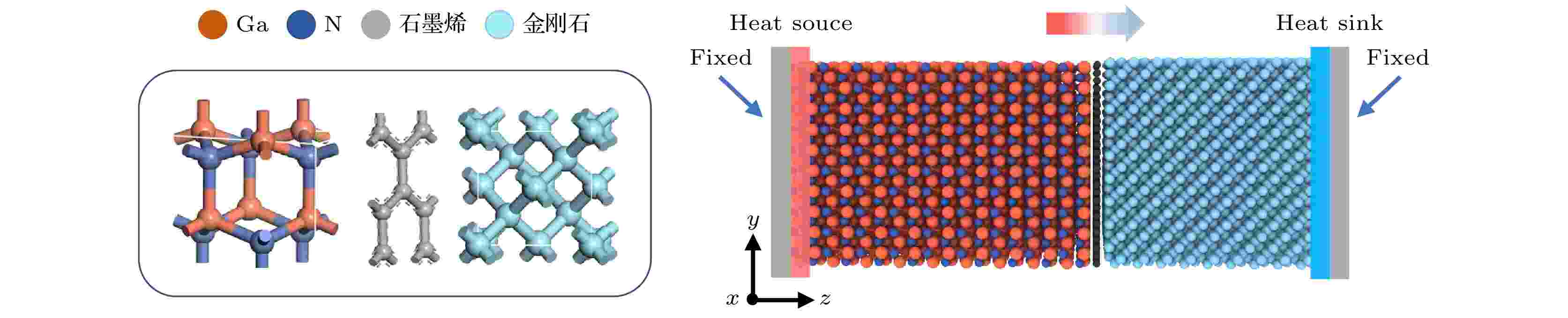 为研究高功率氮化镓器件散热性能, 构建氮化镓/石墨烯/金刚石异质结构, 采用分子动力学方法调控异质界面热输运特性, 并从声子输运角度揭示异质界面传热机理与调控机制. 研究发现Ga-C接触方式的界面热导是N-C结构的3倍, 且氮化镓/石墨烯/金刚石异质结构不具有热整流特性. N和B掺杂下界面热导先增大后减小, 但Si掺杂下界面热导单调增大. 两种Si掺杂势函数对应的界面热导差异不大, 但双势函数下的石墨烯结构更稳定. 线性掺杂和圆形掺杂两种掺杂形貌对界面热导影响不大, 但线性掺杂下石墨烯声子谱变化更具规律性. 氢化会严重阻碍界面传热, 但三种氢化结构下的界面热导均随氢化率增加而增大. 研究结果可为氮化镓器件热管理提供理论支持, 同时对突破大功率电子器件散热瓶颈具有指导价值.