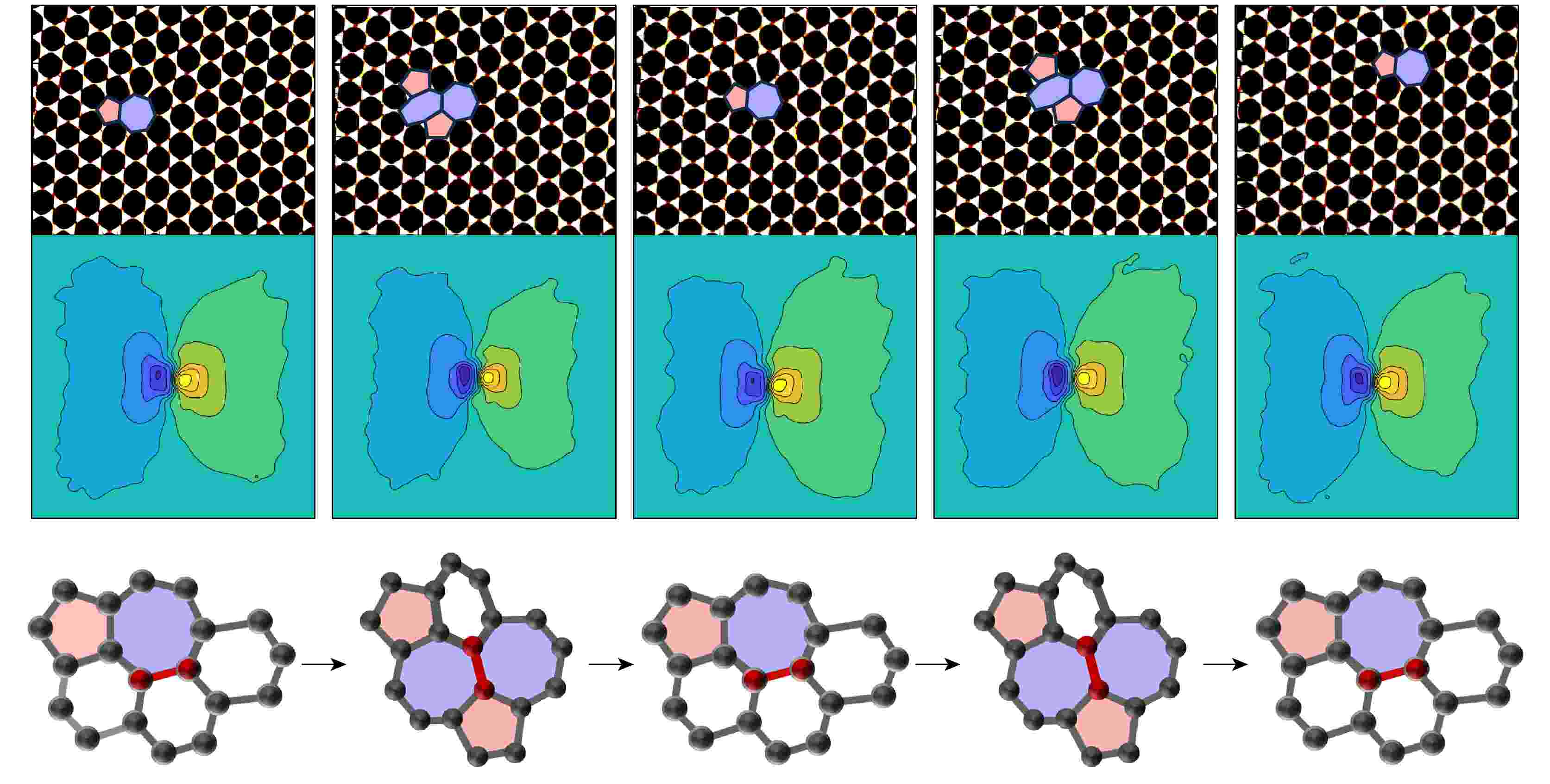 石墨烯晶界结构的演化规律及其位错运动机制的研究对理解石墨烯的塑性变形行为具有重要意义, 目前对于在非机械作用下石墨烯晶界的动力学行为已得到广泛研究, 但由于已有实验条件和模拟方法在时间和空间尺度方面的限制, 关于机械拉伸载荷作用下石墨烯位错动态演化过程及塑性变形问题仍知之甚少. 本文基于晶体相场模型, 研究了在单轴拉伸载荷作用下石墨烯晶界环的动力学演化过程. 模拟研究结果表明, 当外加应变低于临界值时, 石墨烯体系处于弹性响应阶段, 5|7位错核心区域的应变振幅随着外加载荷的增大而减小; 而当应变达到临界值时, 体系发生弹-塑性转变, 晶界环处5|7位错通过C—C键旋转, 转变为5|7|7|5位错, 此时位错核心区域的应变振幅增大, 标志着体系塑性变形的启动; 当应变超过临界值后, 体系进入塑性变形阶段, 晶界环呈现出3种特征性演化行为: 5|7位错与5|7|7|5位错之间发生缺陷结构交替转变; 位错经历“钉扎$\rightleftharpoons $攀移/滑移混合运动”的反复演化过程; 位错保持“钉扎”状态直至位错处裂纹形核并发生韧性断裂. 本工作为深入理解石墨烯塑性变形行为提供了重要理论基础.
