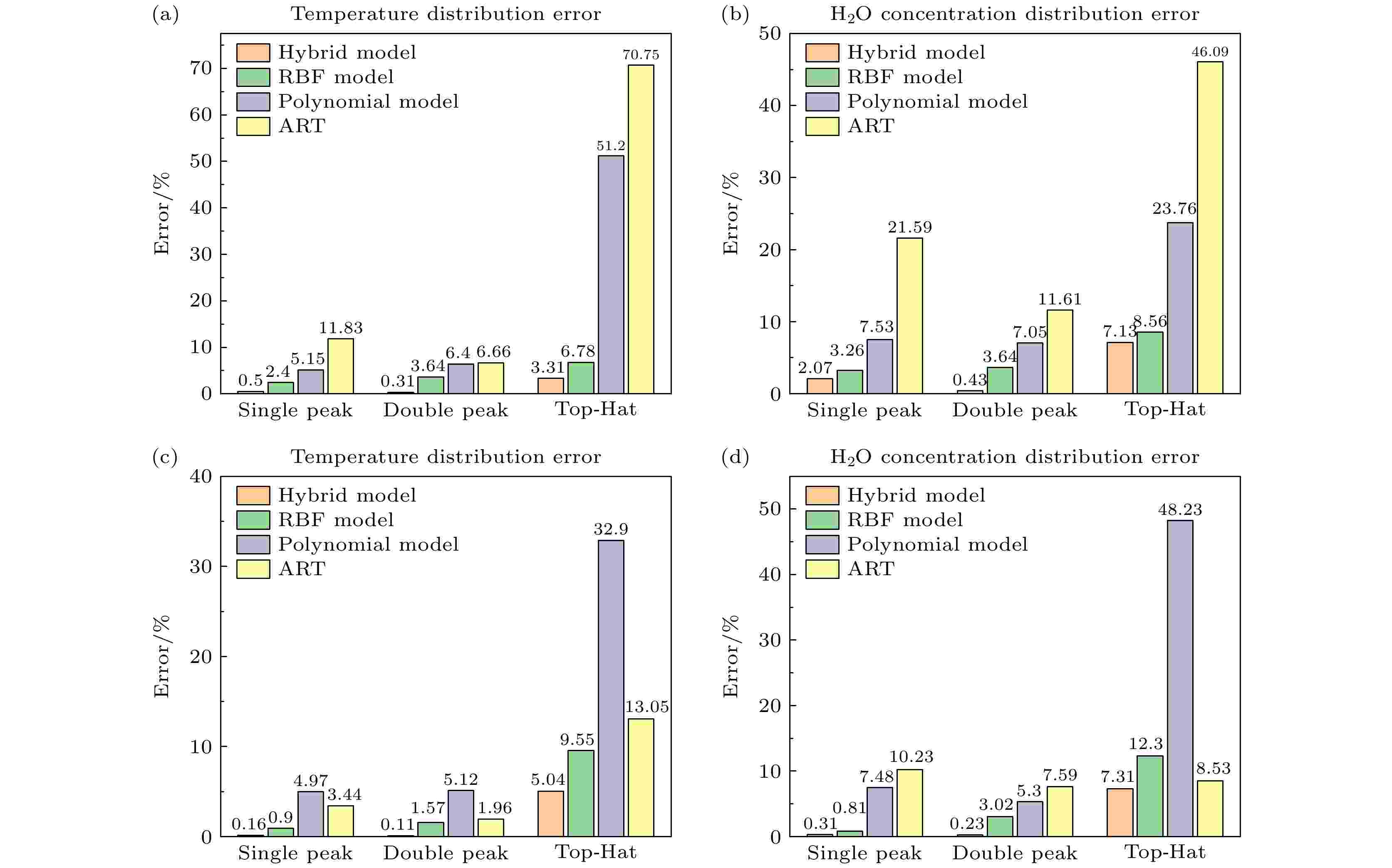 燃烧场温度与气体组分浓度的二维分布对发动机燃烧效率以及性能评估具有重要意义. 本文提出一种基于自适应区域权重混合模型的燃烧场温度和气体组分浓度二维重建方法, 提高复杂突变燃烧场重建精度. 通过区域权重机制将多项式模型与高斯径向基函数模型结合为混合模型, 并自适应迭代计算区域权重矩阵. 一方面通过区域权重矩阵保证了混合模型在兼顾全局特征的同时, 提高混合模型细节特征的描述能力; 另一方面, 在残差函数中加入区域权重正则化方法, 提升算法的精度. 数值模拟了三种燃烧场分布, 通过对比验证了混合模型的表征能力和重建精度, 结果表明, 混合模型算法重建误差低于单一模型及传统ART算法, 其温度、浓度分布重建最大误差分别为3.31%和7.13%. 并在标准McKenna燃烧器上搭建了扫描式TDLAS测量平台及热电偶测量平台对该方法进行实验验证, 重建结果与实际分布一致性较好, 1800 K下中心温度与热电偶测量结果偏差为10 K, 验证了该方法的有效性, 可为发动机燃烧场测量分析提供有效的参考.