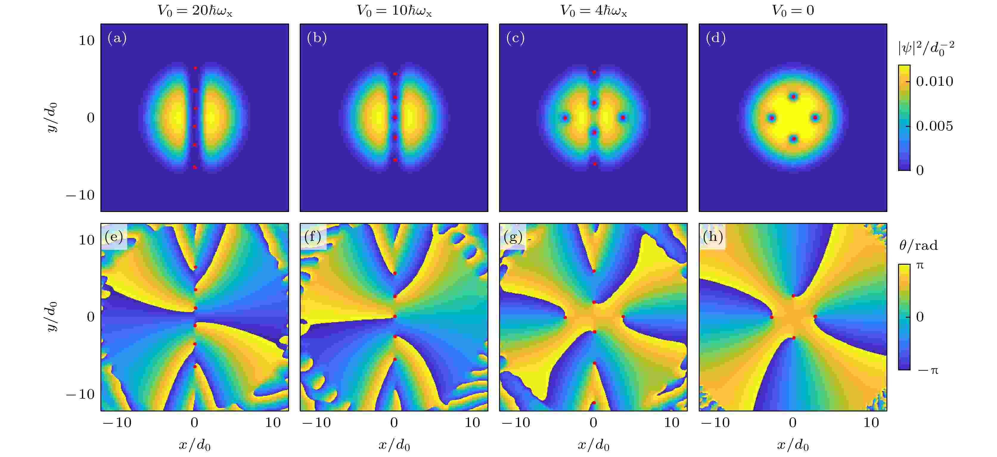 玻色-爱因斯坦凝聚体的涡旋研究是探索宏观量子现象的重要途径. 本文聚焦于旋转双势阱中势垒参数对隐藏涡旋形成和演化的影响, 旨在揭示势垒宽度和高度对涡旋动力学的调控机制. 通过数值求解带耗散的Gross-Pitaevskii方程, 分析了不同势垒宽度和高度下凝聚体的密度分布、相位分布、涡旋数量及平均角动量. 结果表明: 增大势垒宽度可以显著促进隐藏涡旋的生成, 且生成的可见涡旋和隐藏涡旋总数仍然满足费曼规则; 当势垒宽度较大时, 隐藏涡旋会沿势垒轴线呈现摆动分布, 反映隐藏涡旋间相互作用增强. 相比之下, 当势垒高度高于临界值(指能够将凝聚体完全分隔的势垒高度)时, 改变其值对生成涡旋数量影响很小; 当势垒高度低于临界值时, 隐藏涡旋核因势阱连通变得可见, 而且可见涡旋的生成阈值降低. 特别地, 在旋转谐振子势阱中临时引入中间势垒可有效引入相位奇点, 促进在较低旋转频率下生成稳定涡旋态, 优于纯谐振子势阱所需的频率. 本研究为实验调控涡旋提供了理论依据, 具有一定的学术价值和应用前景.