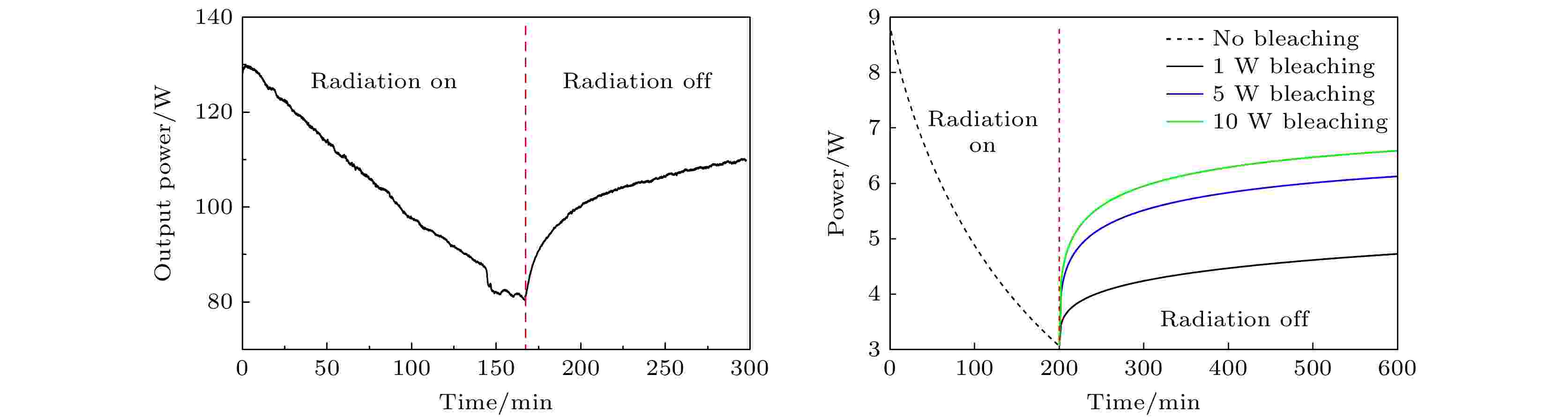 辐射环境下, 增益光纤的辐致损耗会引起激光器输出性能的退化. 光漂白是降低辐射影响, 恢复激光器输出特性的一种有效方法. 本文对掺镱光纤激光器的辐照和光漂白特性开展了实验研究和模拟仿真. 在伽马辐照实验中, 激光器输出功率出现了明显的下降; 在漂白实验中, 观察到了激光器的性能恢复, 即自漂白现象. 为了摸清产生漂白效应的具体激光波长, 使用915, 976, 1070和1550 nm等不同波长激光测试了掺镱光纤内部辐致损耗的漂白特性, 明确了1 μm波段激光信号是引起掺镱光纤激光器性能恢复的主要因素, 而915, 976和1550 nm波段信号则无法实现对掺镱光纤的有效漂白. 测量了不同泵浦功率下掺镱光纤的漂白曲线, 并通过拟合得到了1070 nm光漂白下, 掺镱光纤辐致损耗的演化参数. 在此基础上, 计算给出了在辐照和光漂白条件下, 掺镱光纤内部辐致损耗的演化曲线; 结合激光器的辐射物理模型, 仿真给出了掺镱光纤激光器的功率演化曲线; 相关计算和仿真结果与实验测量数据变化趋势一致. 相关工作可为光纤激光器在辐射和漂白条件下性能演化预估提供技术支撑.