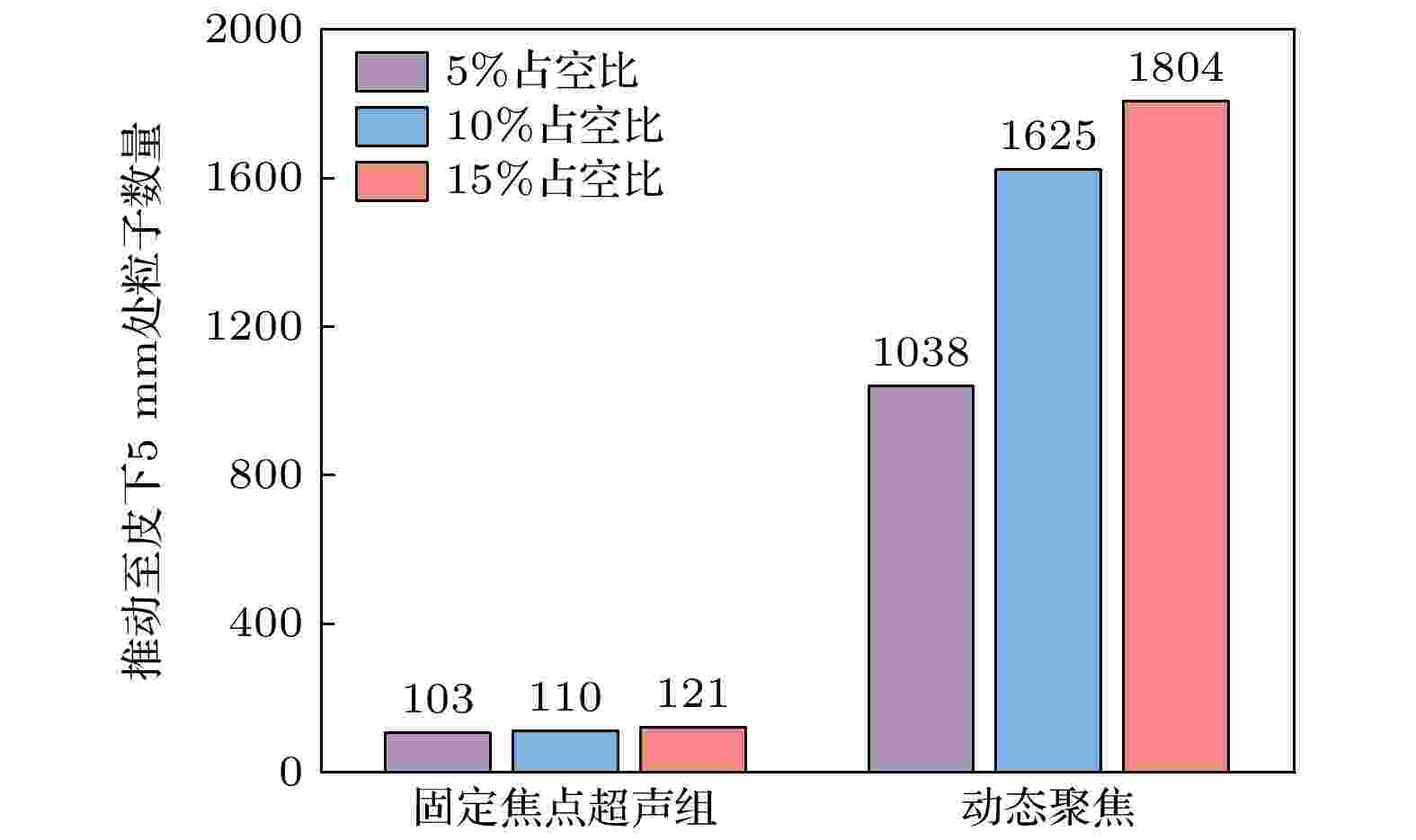 针对传统超声透皮给药技术中声场聚焦模式单一、药物粒子穿透深度及分布范围受限等关键瓶颈问题, 本研究提出了一种基于超声换能器阵列的多阶动态移焦发射策略, 旨在实现声能量在皮肤深度方向的动态重分布, 从而提升纳米粒子的透皮效率与分布均匀性. 通过调控换能器阵元激励相位, 构建多阶移动的声聚焦作用路径, 并通过在体动物实验与有限元仿真联合验证其透皮给药效果. 结果显示, 与固定焦点模式相比, 动态聚焦显著提升了药物粒子的经皮渗透深度与空间分布均匀性, 其平均渗透深度可提高65.7%, 荧光积分强度提升69.3%, 并在皮肤组织中形成更均匀的沉积带结构. 有限元仿真结果进一步揭示了该模式下粒子扩散演化行为与焦点动态轨迹之间的强耦合机制, 证实动态移焦模式下的“多焦点接力式”驱动效应可在显著优化粒子的经皮渗透效率的同时, 有效降低局部能量沉积引发的潜在风险, 为构建高效、安全、可控的超声透皮递药技术提供了重要的理论基础与技术支撑.