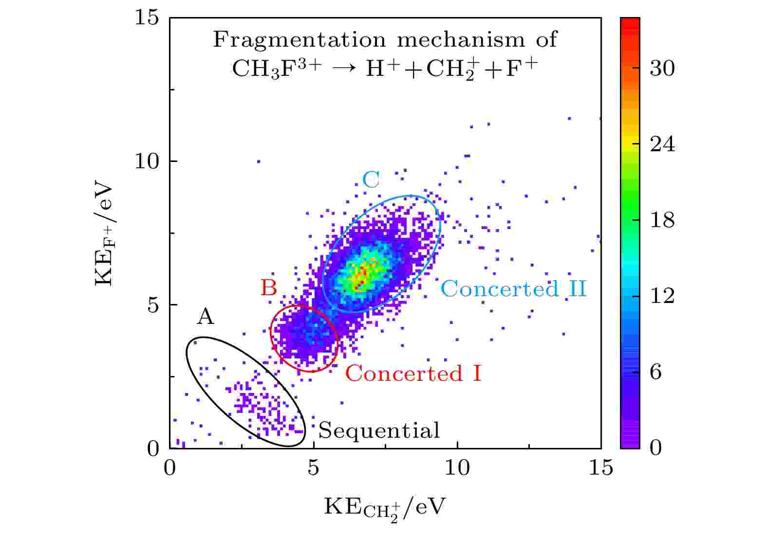 研究分子的碎裂机制以及碎片的动能分布, 有助于理解其在等离子体物理、生物组织的辐射损伤和星际化学等方面的重要作用. 本文利用冷靶反冲离子动量谱仪开展了3 keV/u的Ar8+离子束与氟甲烷气体分子束的碰撞实验, 聚焦CH3F3+离子C—F键和C—H键断裂后形成H++$ {\mathrm{C}\mathrm{H}}_{2}^{+} $+F+这一三体碎裂通道, 测得3个碎片离子的三维动量. 借助离子-离子动能谱、Newton图和Dalitz图展示碎片的动能与动量关联, 分析了H++$ {\mathrm{C}\mathrm{H}}_{2}^{+} $+F+通道的解离机制. 研究发现, 该通道存在协同碎裂以及通过中间体CH2F2+顺序碎裂两种解离方式, 其中协同碎裂占主导地位. 此外, 实验上观测到两种不同动力学特征的协同碎裂过程, 表明CH3F3+离子中H原子可以具有不同的化学环境. 这可能是由于分子异构化产生不同分子构型或者Jahn-Teller效应使得分子产生不同C—H键所致.