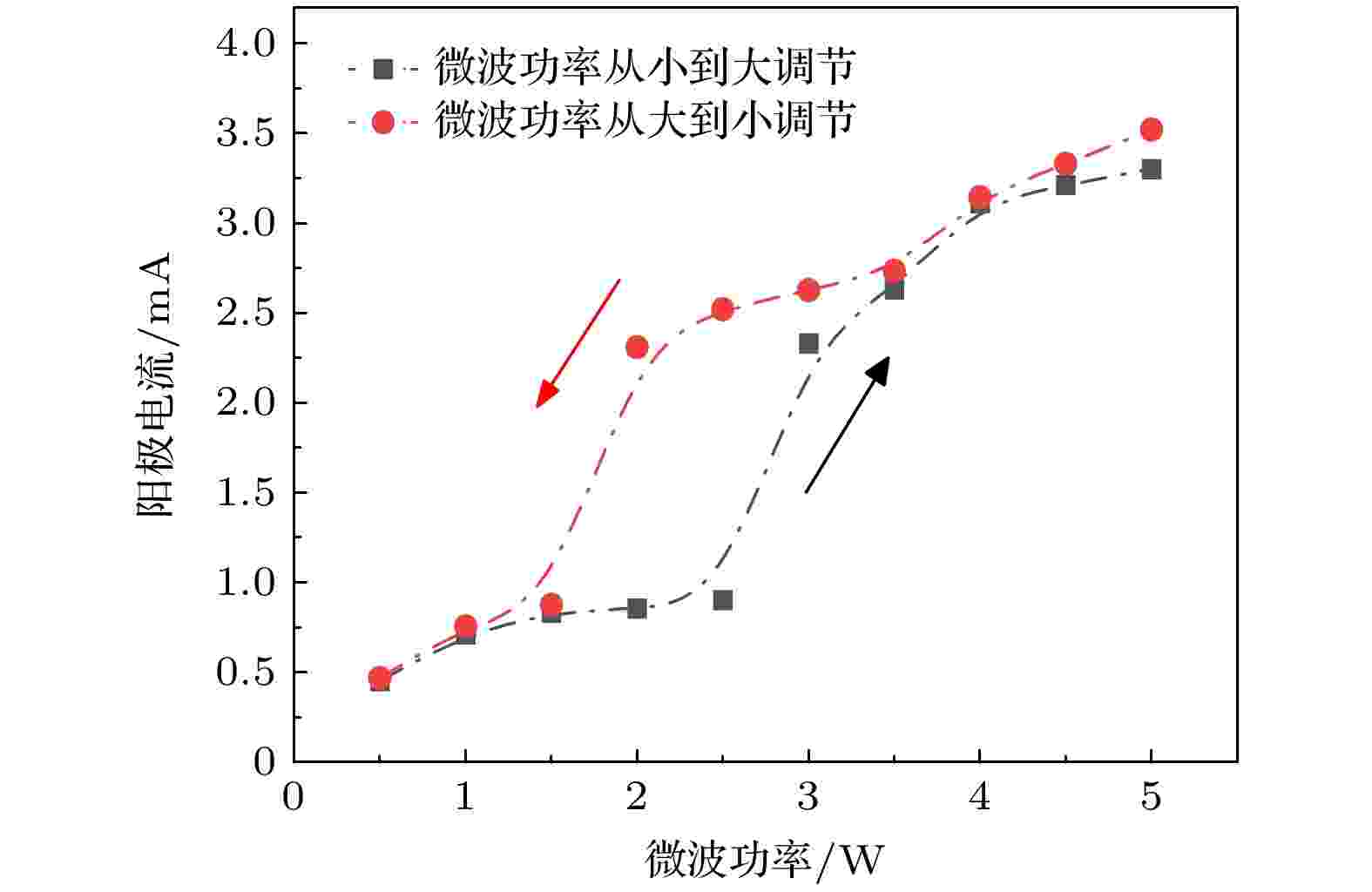 微牛级会切霍尔推力器是一种微波辅助电离调控的电推进装置, 作为无拖曳控制系统的执行机构, 通过宽范围连续调节推力来保障控制精度与稳定性. 但调节过程中会发生模式转换导致阳极电流突变, 降低控制精度和稳定性. 因此, 有必要对模式转换发生的规律进行研究. 本文通过探针诊断等方式, 研究了微波模式转换前后推力器内部等离子体参数与放电特性的变化规律. 实验结果显示, 模式转换前, 等离子体亮区主要集中于阳极前端1—3 mm处的电子回旋共振区域; 转换后, 亮区向上游移动, 近阳极区等离子体密度超过截止密度, 沿轴向急剧下降. 等离子体密度变化改变基本波的传输特性是电子加热方式发生改变的根本原因. 等离子体密度上升至截止密度时, 驱动电离的R波与O波迅速衰减或被反射. 此时R波无法到达共振面, 主导的电子回旋共振(ECR)电离失效. R波-O波主导电离变为O波主导电离, 电子加热机制从体加热向表面波加热过渡. 本文研究将为后续优化推力器微波传输、降低模式转换发生的阈值提供依据.