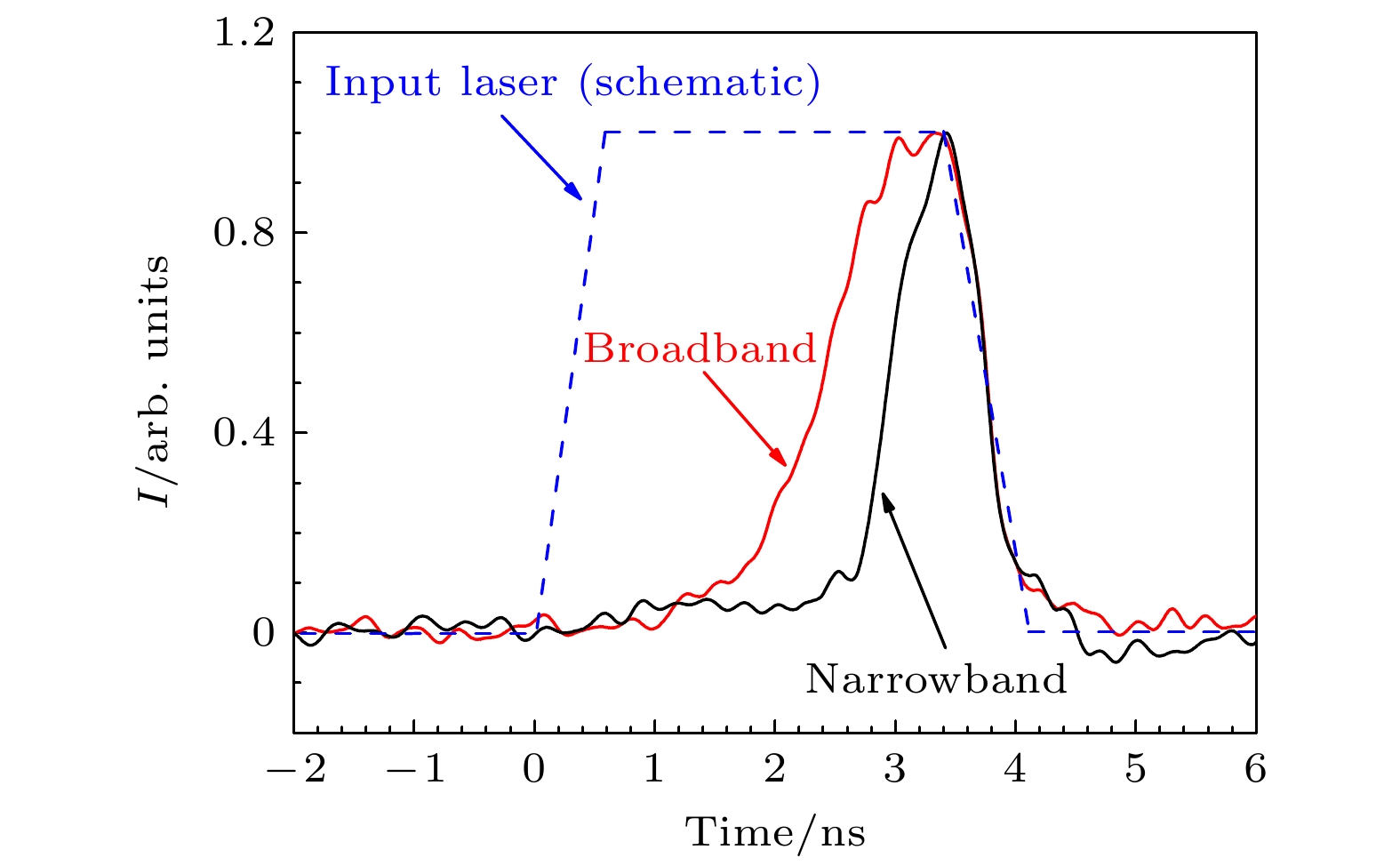 Laser plasma interaction (LPI) has always been an important research topic in the ignition phase of inertial confinement fusion (ICF). Over the years, researchers have attempted to use various laser beam smoothing schemes and optimized light source solutions to suppress the development of LPI. Among them, low-coherence laser drivers have attracted widespread attention in the fields of laser-plasma physics and laser technology in recent years. Recently, a broadband second harmonic laser facility named “Kunwu” has provided a reliable experimental research platform for the LPI process driven by broadband lasers. Aiming at the strong stimulated Brillouin scattering (SBS) and stimulated Raman scattering (SRS) in the LPI process of large-scale low-density plasma, forward scattering experiment and near-forward scattering experiment on C8H8planar film targets driven by broadband laser and narrowband laser under the same conditions are carried out. Based on the “Kunwu” laser facility, two sets of measurement systems are designed, one is centered around fiber-heads and spectrometer, and the other around phototubes and oscilloscope. These systems enable multi-directional precise measurements of scattered lightand a comprehensive analysis of LPI. The main focus is on the comparison of the components and spectral information of the scattering beams between broadband laser and narrowband laser, and it is found that the LPI processes driven by broadband laser and narrowband laser are greatly different. Additionally, preliminary results indicate that broadband laser exhibits a stronger penetration capability than narrowband laser. The time to ablation the target and penetrate the plasma are both nearly 1 ns ahead, with the transmitted energy increased by nearly an order of magnitude. And after penetrating the plasma, there is a smaller spatial divergence angle. These results provide good reference value for better understanding the effect of broadband laser on LPI.