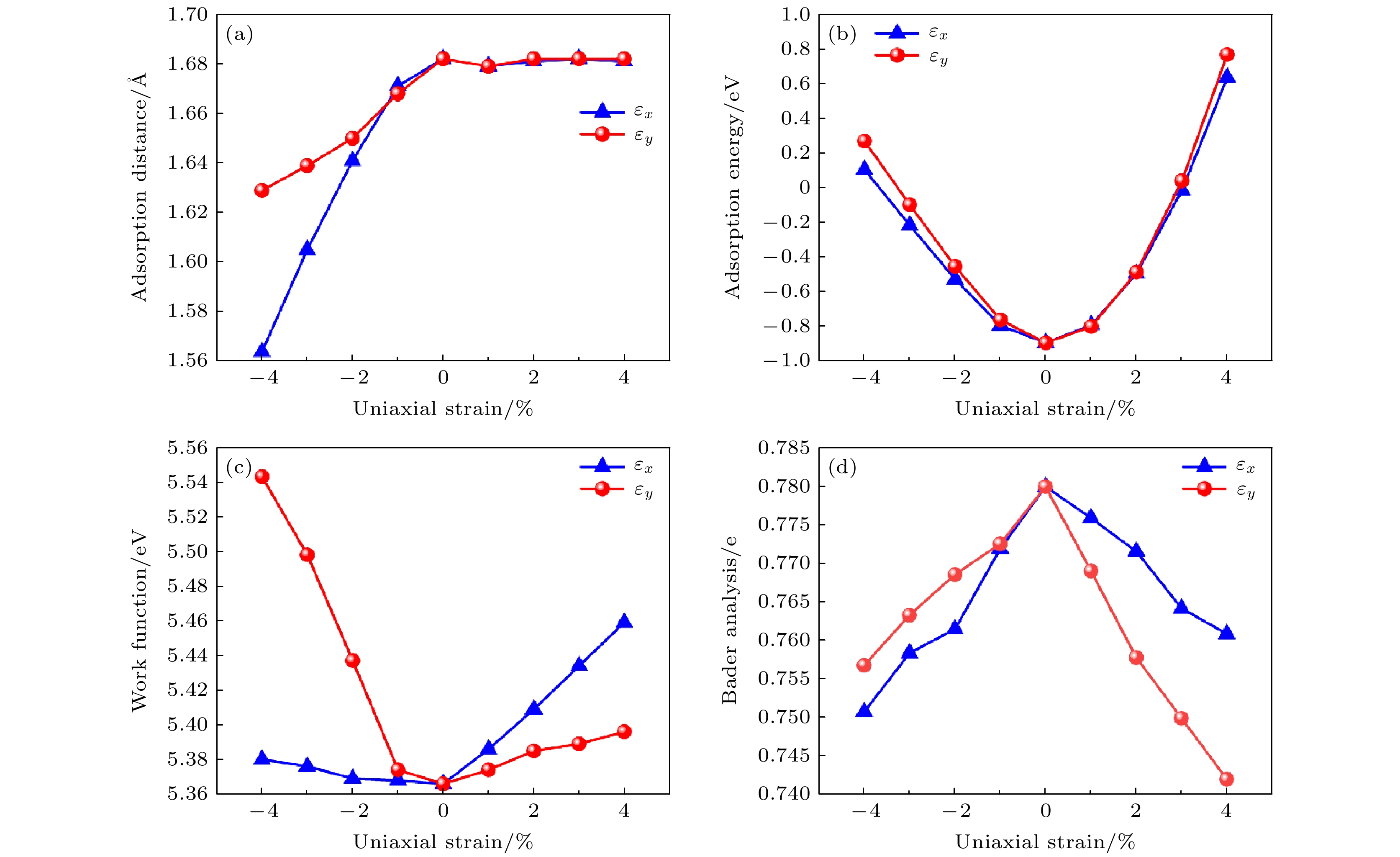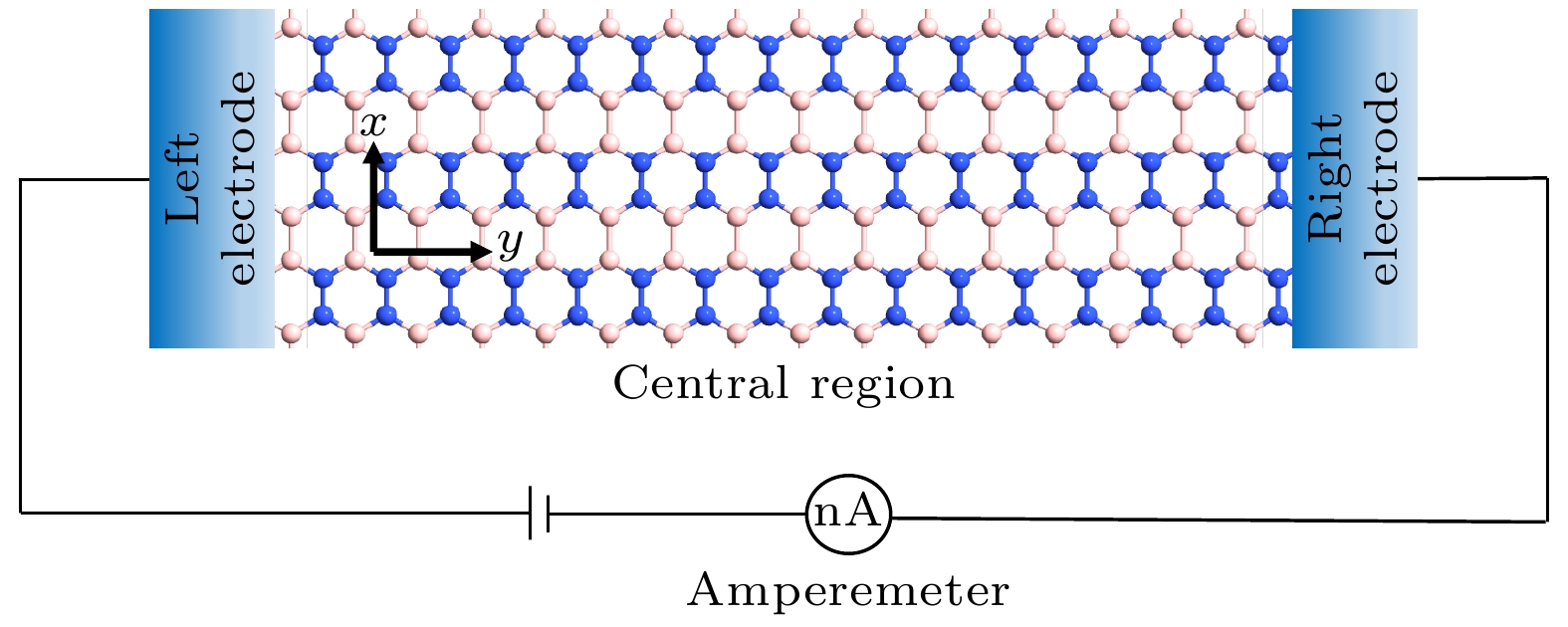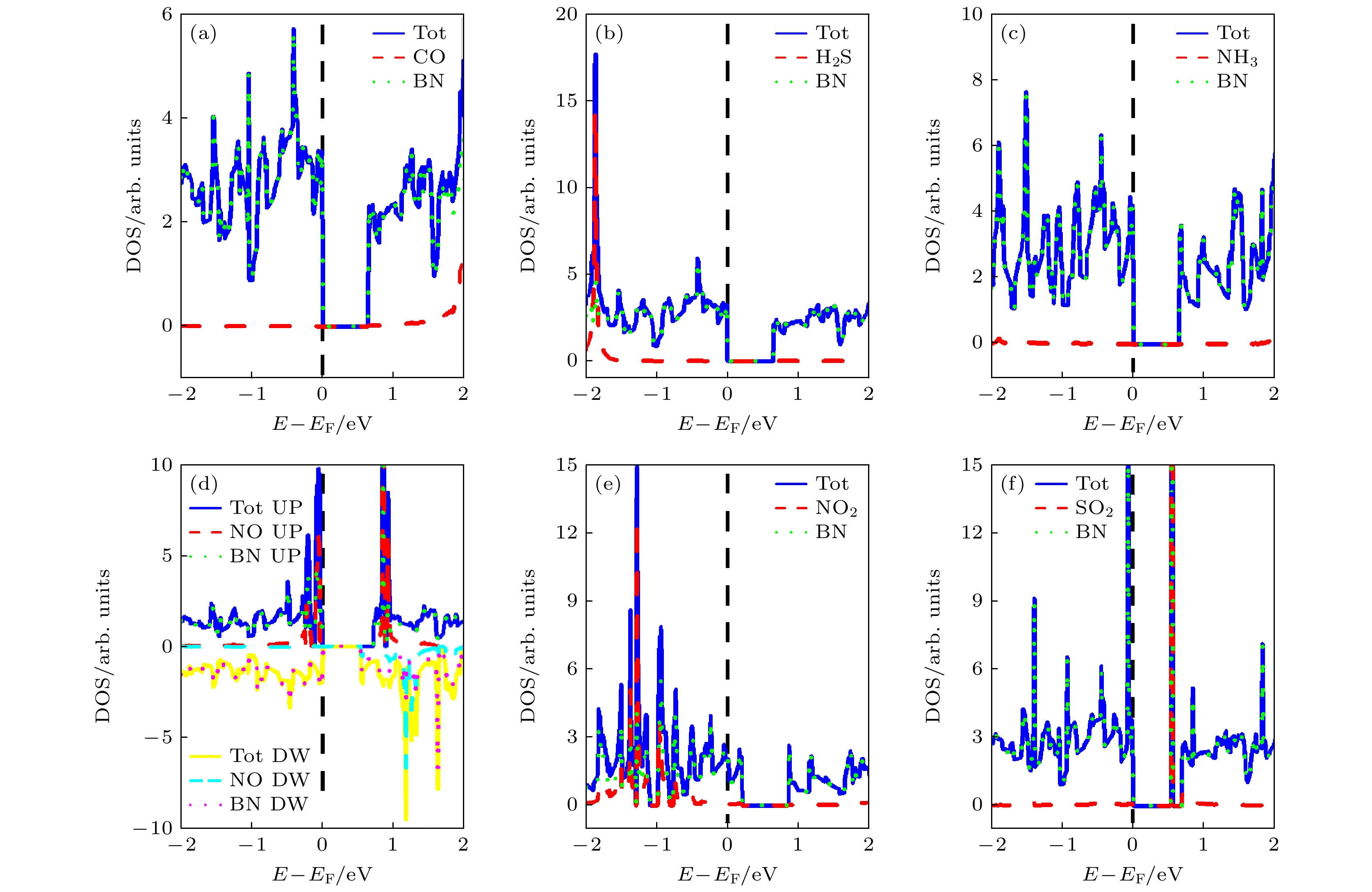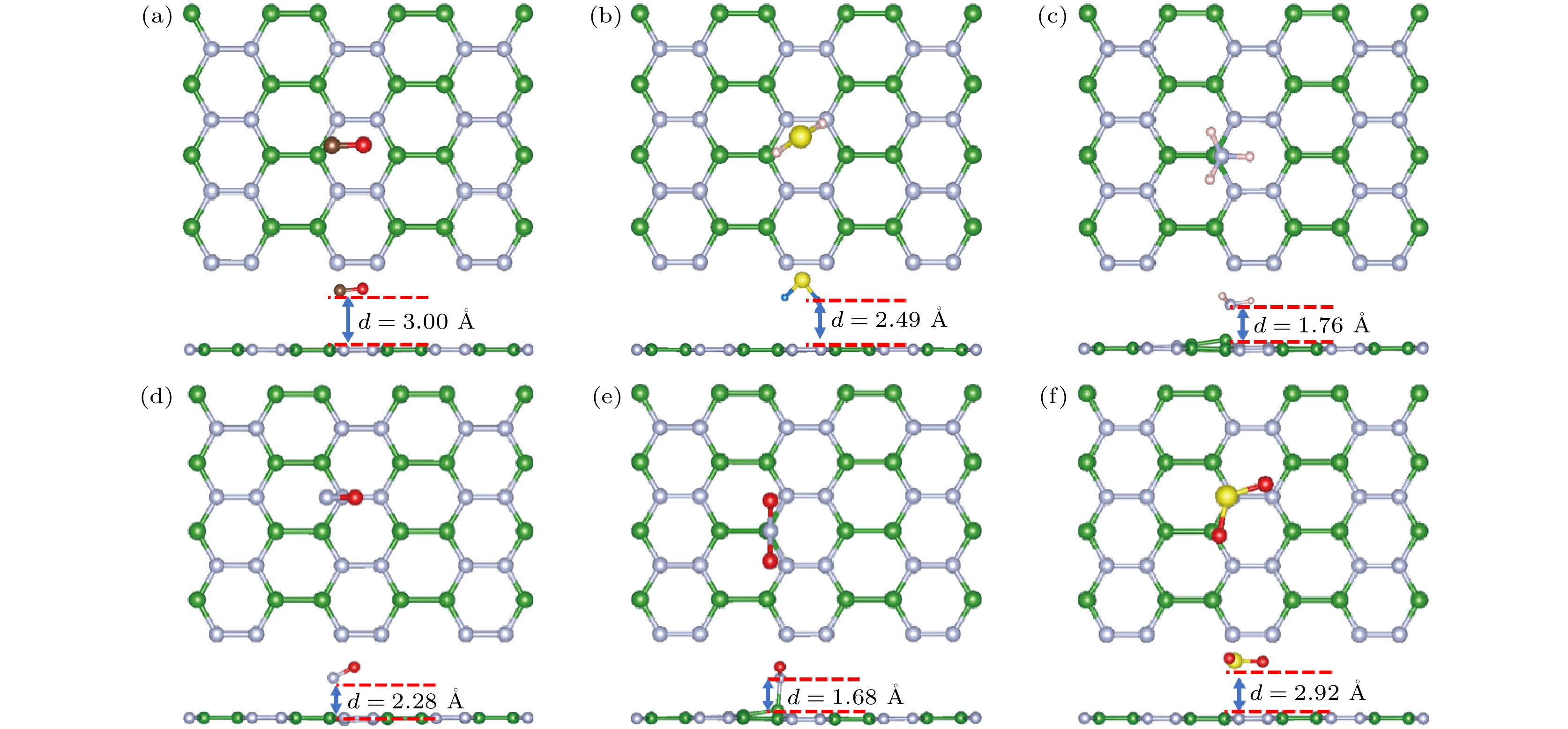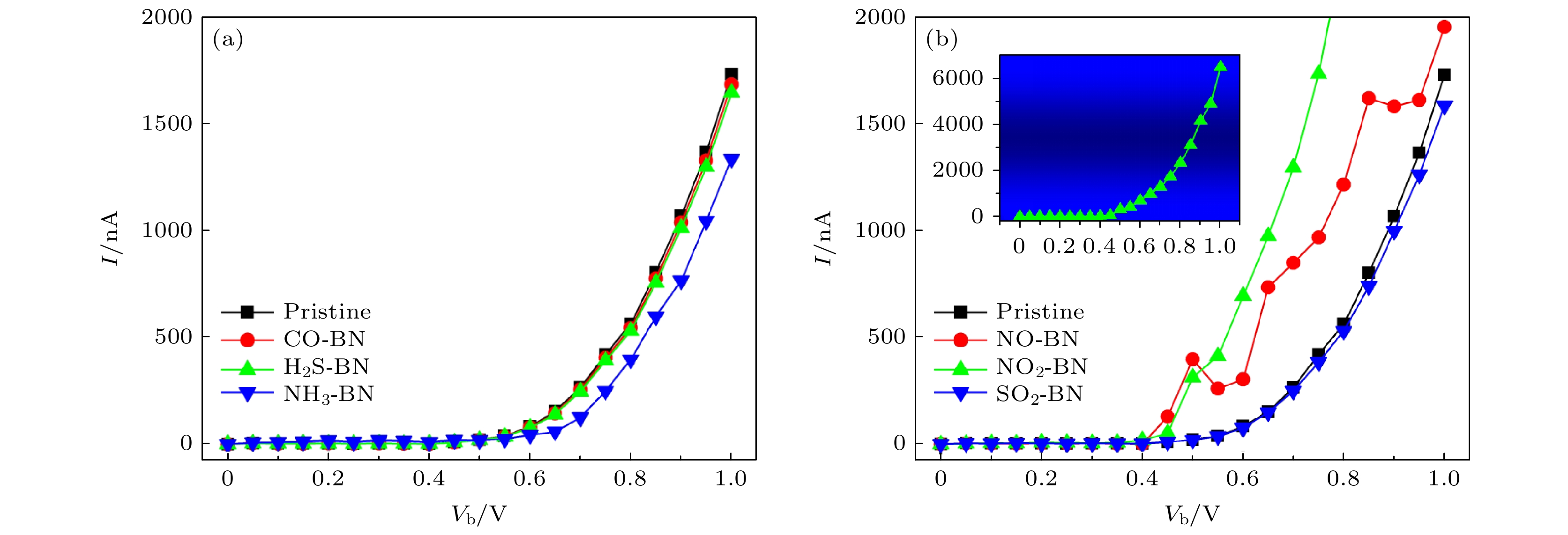 The adsorption properties of toxic gases on the surface of low-dimensional nanomaterials are a research hot topic and key issue for developing semiconductor sensors to detect toxic gas molecules. Recently, a novel orthorhombic BN monolayer has attracted extensive attention from researchers. Using first principles calculations, we investigate the adsorption properties of typical toxic gas molecules, such as CO, H2S, NH3, NO, NO2, and SO2molecules, on the surface of two-dimensional (2D) orthorhombic BN monolayer adsorption. The calculated adsorption energy show that the adsorptions of the above six molecules on the surface of BN monolayer are energy-favorable exothermic processes. It is found that NO2and NH3molecules are of chemical adsorption, while other systems are of physical adsorption, and NO adsorbing system exhibits a spin-polarized electronic band structure. The calculated density of states reveals that the adsorption of NO molecule and SO2molecule have significant influences on the electronic structure near the Fermi level. Moreover, the adsorption of the NO2molecule on the substrate exhibits remarkable variation of the work function, suggesting that the o-BN monolayer possesses excellent selectivity and sensitivity to NO2molecule. In addition, we use first principles combined with non-equilibrium Green’s function to simulate the electrical transport properties of monolayered o-BN semiconductor based nanodevice with adsorption of typical toxic gas molecules. TheI-Vbcurve shows that the current through the nanodevice is 6500 nA for the NO2molecule adsorbing system under 1 V bias voltage. The calculation results reveal that the adsorption of NO2molecule on the o-BN monolayer can significantly enhance its electrical transport performance, and the o-BN monolayer possesses excellent sensitivity and selectivity to the NO2gas molecule. The work function and the charge transfer can be effectively manipulated by tensile strain, indicating its potential application in anisotropic electronics. Our results indicate that the o-BN monolayer has excellent adsorption performance to toxic gases, showing its practical application in capturing toxic gas molecules as a gas sensor in future.