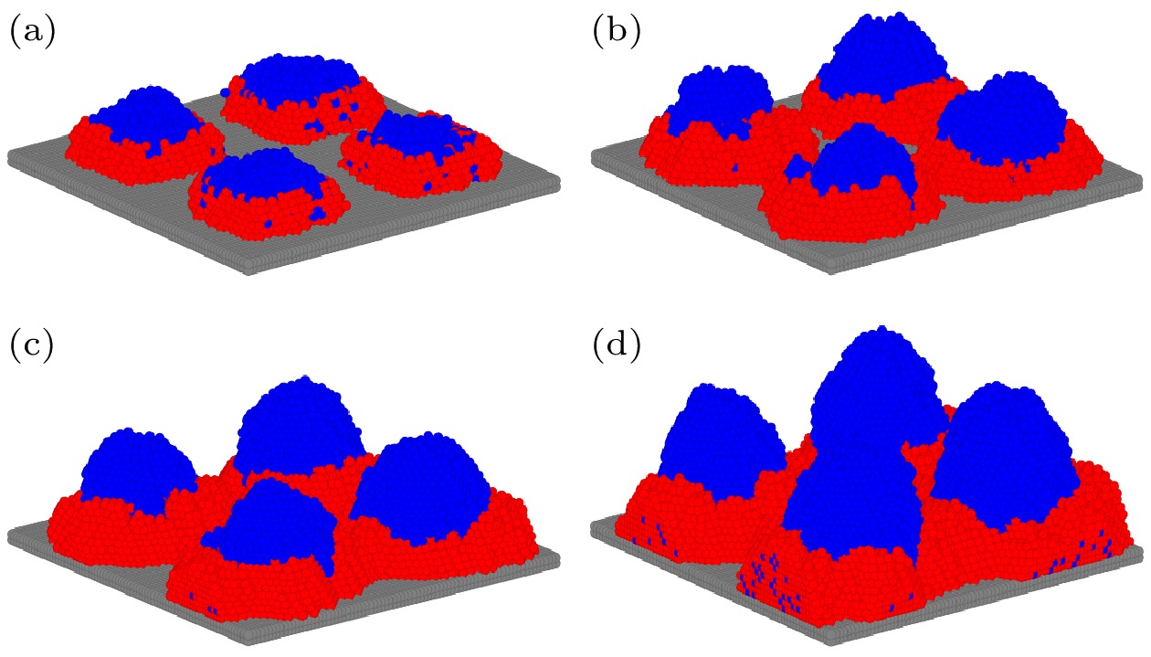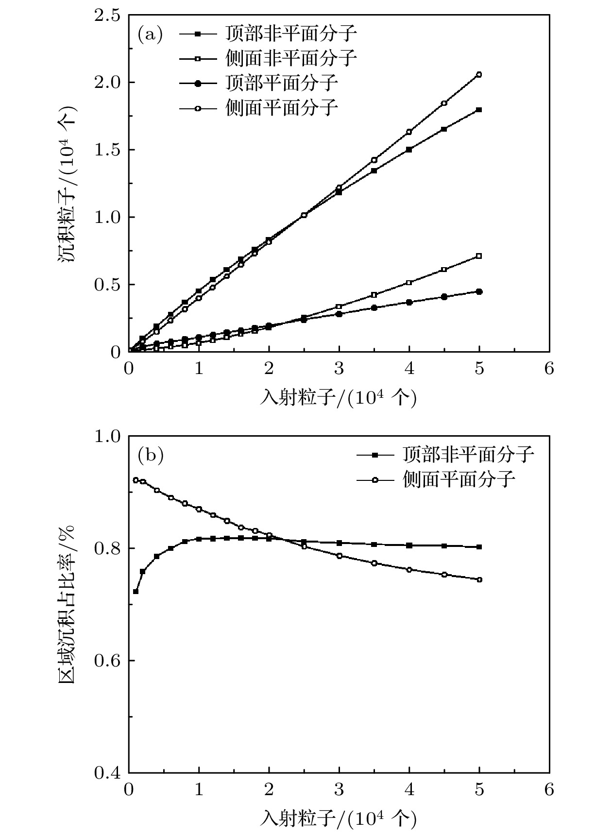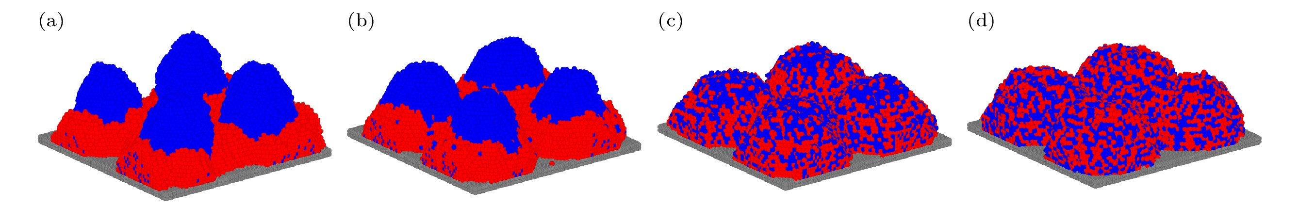 The selective area growth approach (namely the self-assembly of molecules on pre-patterned surfaces) that takes into account the properties of organic molecular materials and traditional lithography techniques, is expected to play a significant role in manufacturing organic micro-nano patterns for photoelectric and full-color display. The manufacture of organic devices with tunable multicolor patterned films depends on the control of nucleation distribution of two or more organic molecules by using a selective area growth approach, particularly through the application of mixed deposition growth that can enhance the nucleation efficiency of multicolor thin films. However, till now the issue of mixed deposition growth of two kinds of organic molecules has been rarely reported, owing to the complexity in experimental operation. In this work, the selective area growth of mixed deposition of two kinds of molecules is studied by molecular kinetic Monte Carlo approach in order to find the experimental conditions for separating two kinds of molecular growth. In the simulation, the interaction energy between the two molecules is adjusted and controlled to study its influence on the separately selective area growth of the two molecules. The results show that when the intermolecular interaction energy is weak, the planar molecules and the non-planar molecules exhibit completely different growth behaviors. The most of non-planar molecules gather at the top of the electrode in an island mode, while planar molecules mainly accumulate in a layer-by-layer mode on the sides of the electrode. On the contrary, when the intermolecular interaction energy is strong, the number of non-planar particles on the tops decreases and a large number of planar particles appear. Moreover, on the sides of the electrode, the doping nucleation of planar molecules and non-planar molecules also exists, resulting in the failure of molecular phase separation growth. It proves that the intermolecular interaction energy can affect separately area-selective growth of various organic molecules. Therefore, when several different kinds of molecules are mixed and deposited, relatively pure crystalline monochromatic films can be obtained at the top and on the sides of the electrode, respectively, by appropriately adjusting the intermolecular interaction energy, which can further facilitate the application of multi-color organic micro-nano pattern in display and other fields.