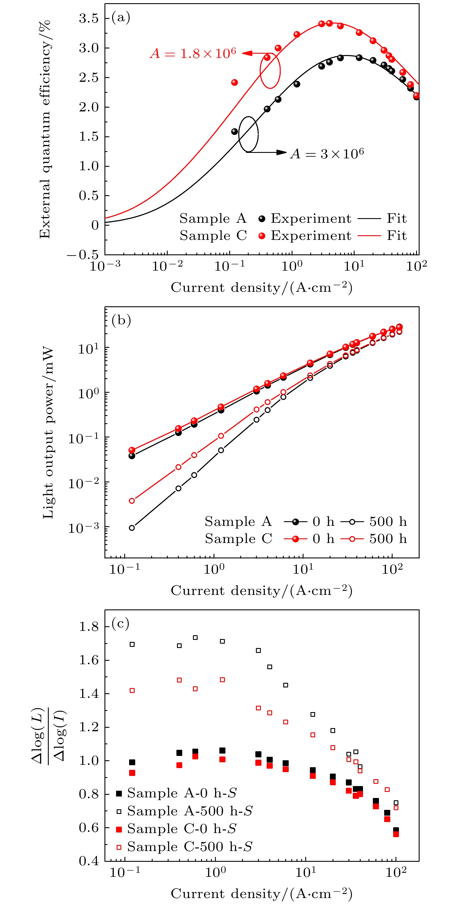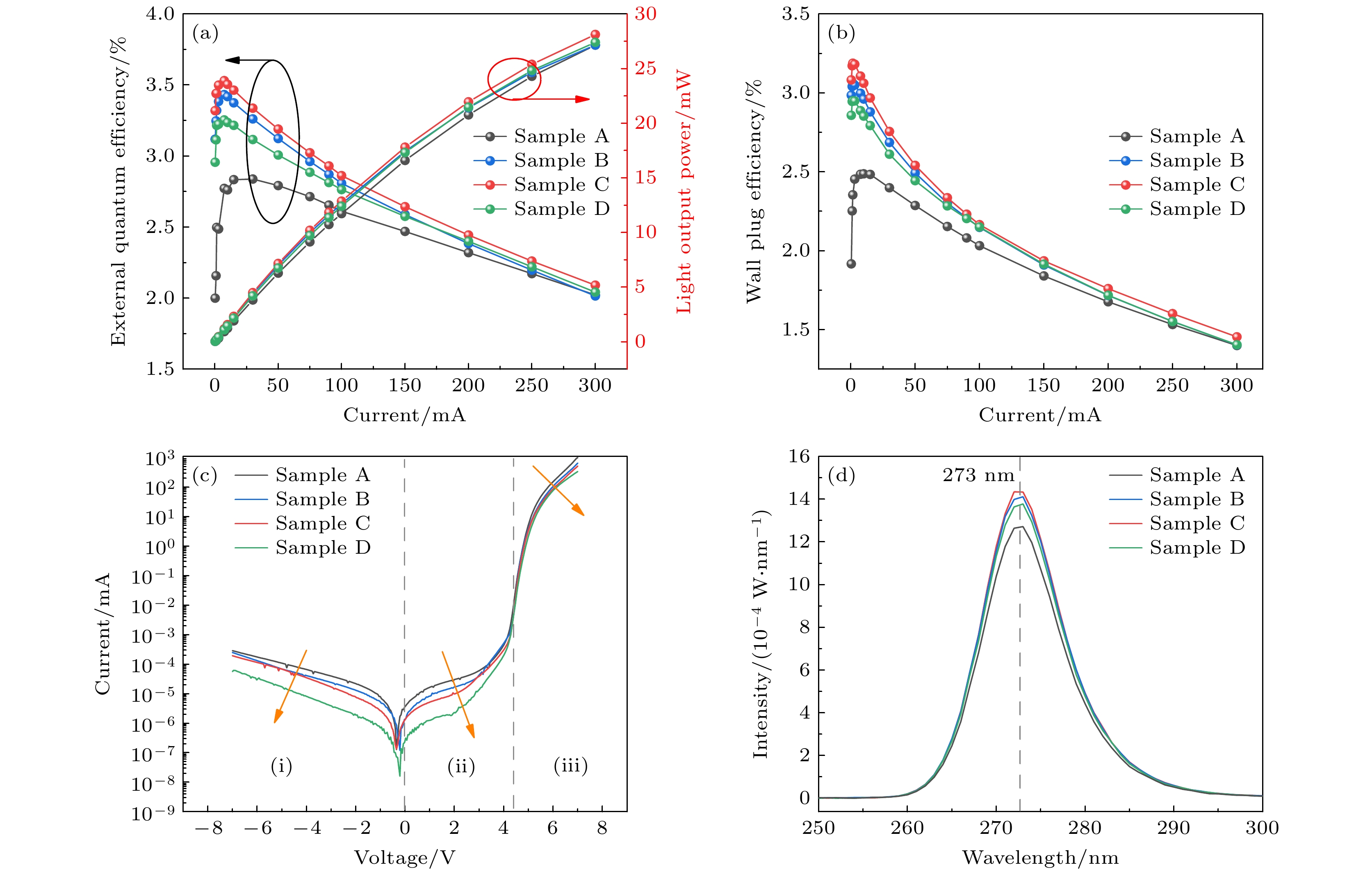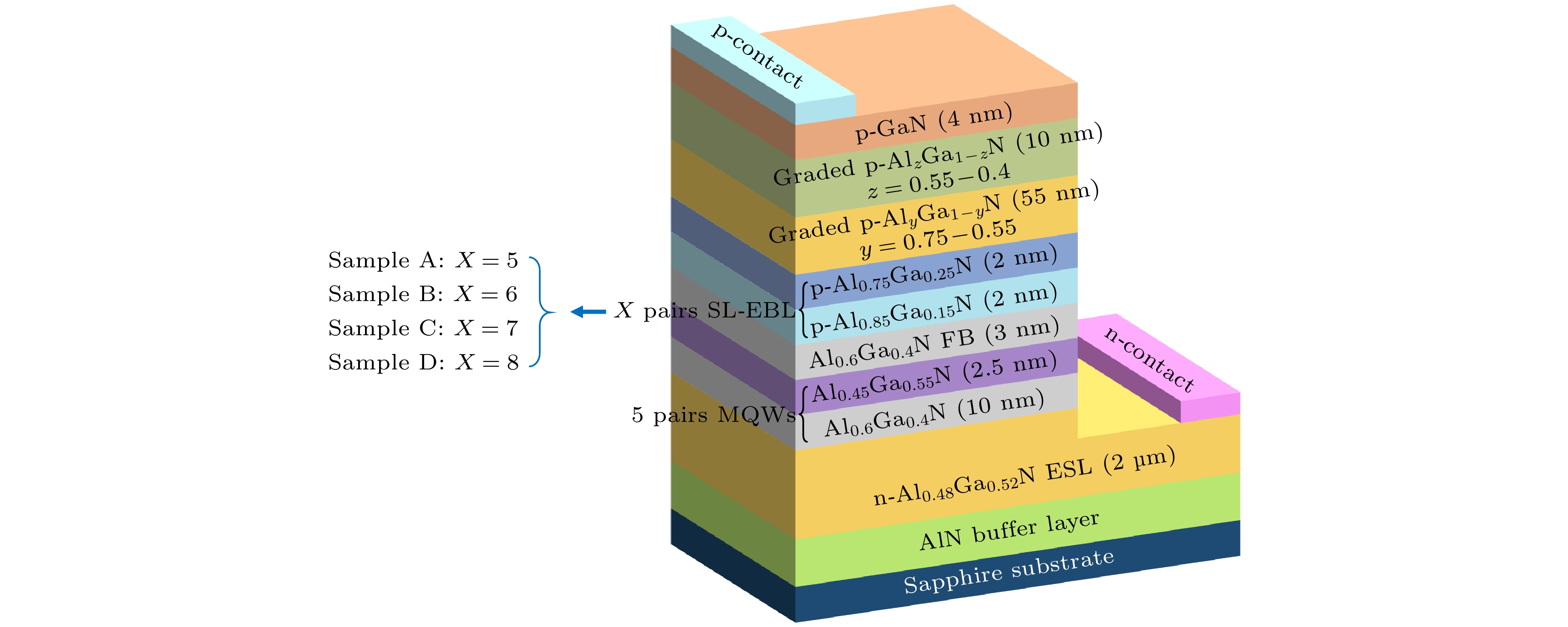 The development of AlGaN-based deep ultraviolet light emitting diodes (DUV-LEDs) is currently limited by poor external quantum efficiency (EQE) and wall-plug efficiency (WPE). Internal quantum efficiency (IQE), as an important component of EQE, plays a crucial role in improving the performance of DUV-LEDs. The IQE is related to the carrier injection efficiency and the radiation recombination rate in the active region. In order to improve the IQE of AlGaN-based DUV-LEDs, this work proposes a scheme to optimize the period number of superlattice electron barrier layer (SL-EBL) to achieve better carrier injection efficiency and confinement capability. The effect of the period number of SL-EBL on the luminous efficiency, reliability and carrier recombination mechanism of AlGaN-based DUV-LEDs with an emission wavelength of 273 nm are investigated. The experimental results show that the light output power (LOP), external quantum efficiency (EQE) and wall-plug efficiency (WPE) of the DUV-LEDs tend to first increase and then decrease with the period number of SL-EBL increasing, while the leakage current decreases and the reliability is enhanced. The maximum EQE and WPE of the DUV-LED are 3.5% and 3.2%, respectively, at an injection current of 7.5 mA when the period number of SL-EBL is fixed at 7 (the thickness is 28 nm). Meanwhile, the numerical simulation results show that the electron potential barrier height is enhanced with the period number of SL-EBL increasing, and the variation of the hole potential barrier height is negligible. Therefore, increasing the period number of SL-EBL is beneficial to shielding the dislocations and suppressing the leakage of electrons into the p-type layer, which improves the luminous efficiency and reliability of DUV-LEDs. However, when the period number of SL-EBL exceeds 7, the excessively thick hole potential barrier prevents the holes from entering into the activation region and reduces the radiative recombination efficiency. Therefore, EQE and WPE will show an inflection point with the variation of the period number of SL-EBL. In addition, to investigate the carrier recombination mechanism of the active region, the experimental EQE curves are fitted by the ABC model as well as the different slopes in logarithmic light output power-current (L-I) curves are calculated after aging. It can be found that increasing the period number of SL-EBL can effectively suppress the non-radiative combination of carriers in the active region. This investigation can provide an alternative way to enhance the photoelectric performance of DUV-LEDs.