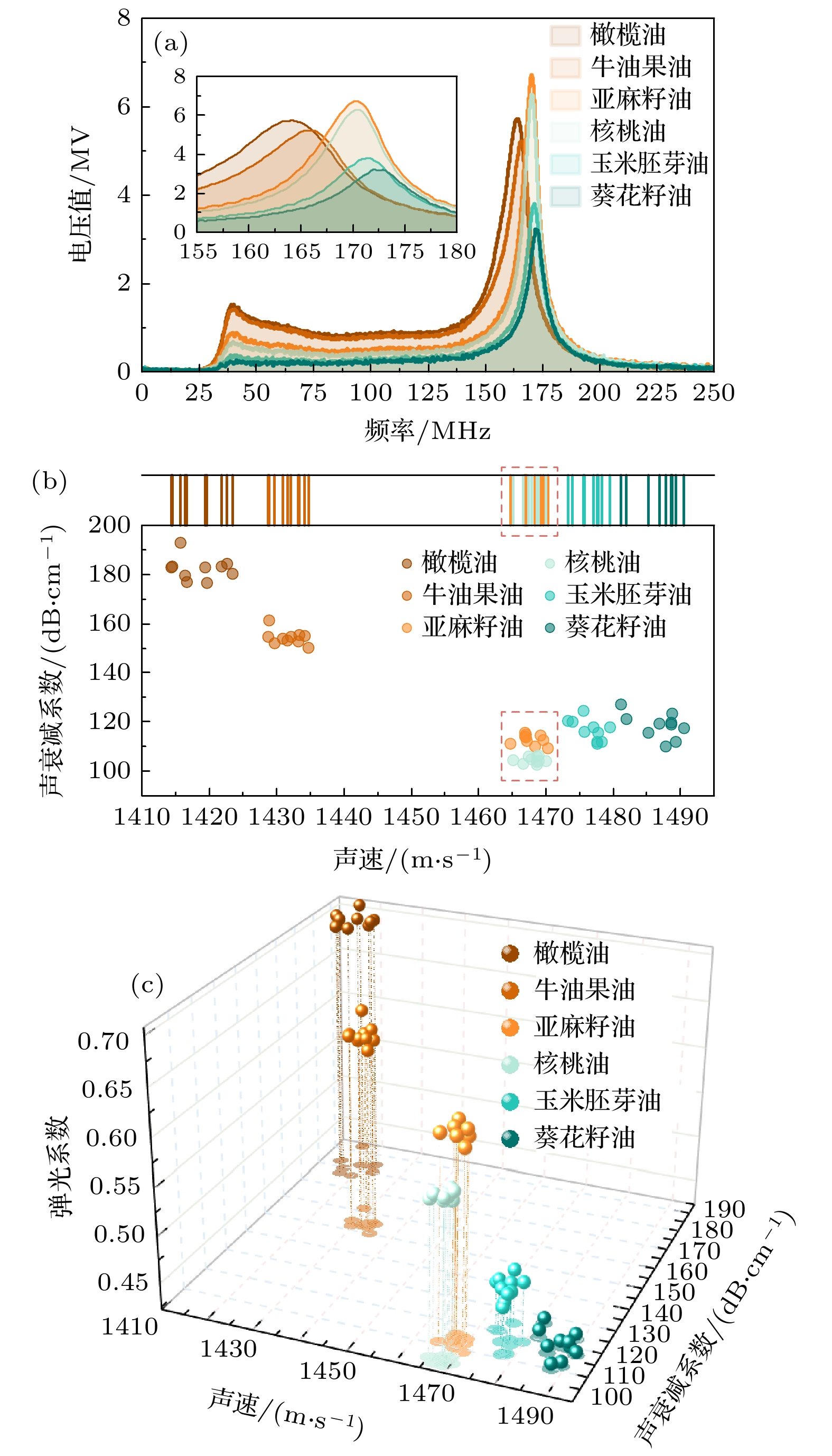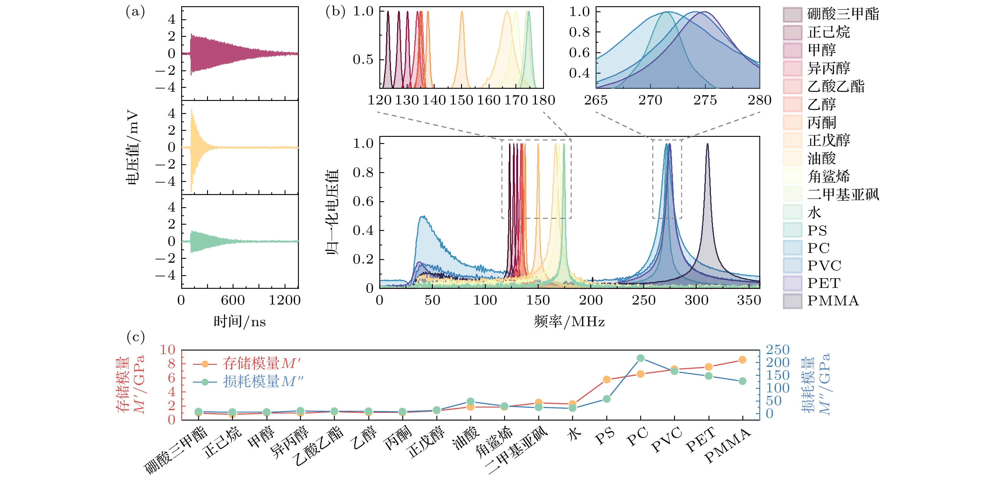 The mechanical properties of cells and tissues play a crucial role in determining biological functions. As a label-free and non-contact mechanical imaging method, Brillouin spectroscopy can characterize viscoelastic changes in samples with high spatial resolution. To sensitively identify small mechanical differences among biological systems, it is important to improve Brillouin scattering efficiency while combining various viscoelastic contrast mechanisms in measurement. This paper presents a high-speed Brillouin spectroscopy based on impulsive stimulated Brillouin scattering. The acoustic oscillation can be excited in a single shot with a pulsed pump laser and detected by a continuous probe laser in the time domain. This time-domain signal can then be transferred to the frequency-domain Brillouin spectrum with high precision. With this method, various viscoelastic information including sound velocity, sound attenuation coefficient, elastic longitudinal storage modulus, and loss modulus can be obtained simultaneously based on derived spectral information. Owing to stimulated scattering and time-domain detection, spectra with a signal-to-noise ratio of 26 dB can be achieved within a millisecond-level spectral integration time. The average measurement precision for storage modulus and loss modulus of the longitudinal elastic modulus are 0.1% and 1%, respectively. With this method, the Brillouin spectra and viscoelastic parameters of typical liquids and polymer materials are measured and compared, providing a comprehensive reference for viscoelastic parameters. We also study the elastic changes in different curing stages of PDMS and make a comparison of viscoelasticity with agarose gel. Moreover, six edible oils are identified based on various viscoelastic contrast mechanisms, which not only provides a new perspective for material identification but also expands the measurement capabilities of Brillouin spectroscopy and enhances the sensitivity of viscoelasticity measurements.