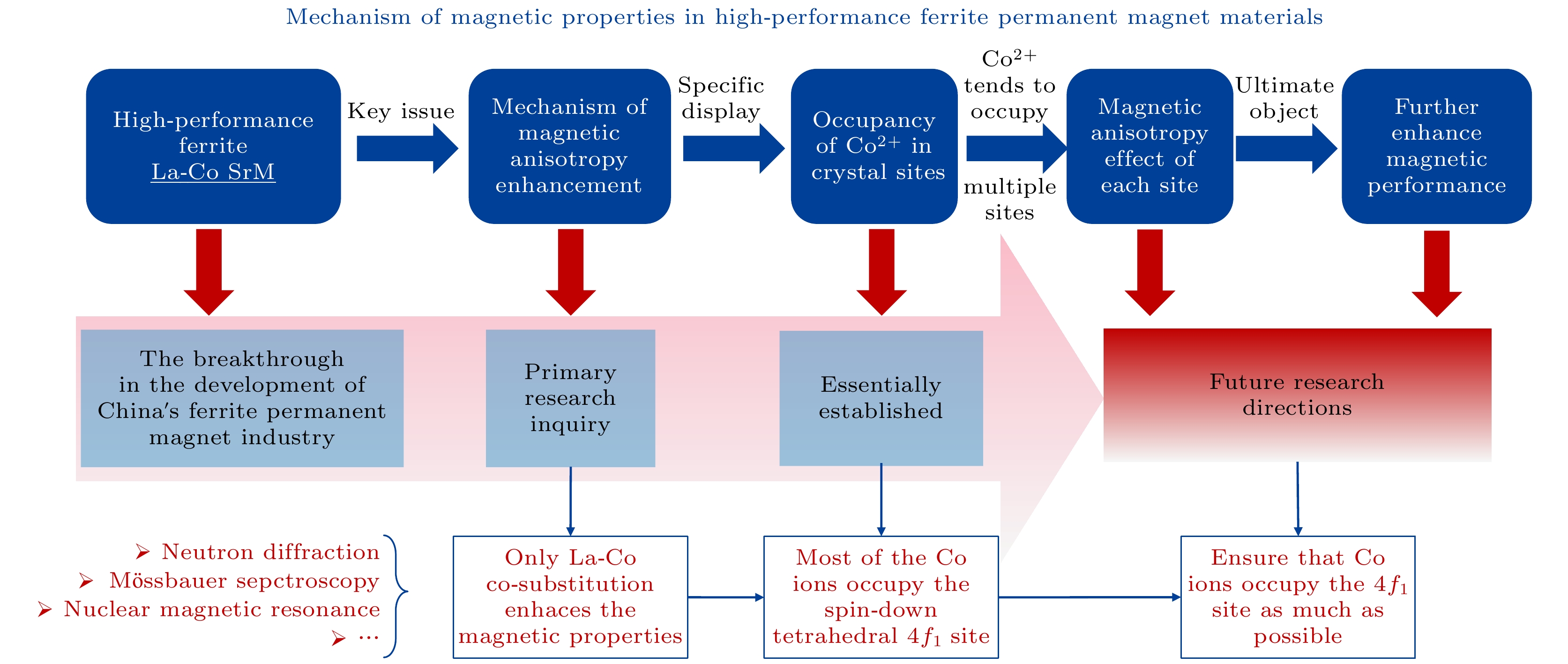 2+play a pivotal role in enhancing the uniaxial anisotropy of M-type ferrites. However, a comprehensive understanding of its microscopic mechanism remains elusive. In order to meet the increasing performance requirements of ferrite materials, it is imperative to clarify the mechanism behind the enhancement of magnetic anisotropy, and at the same time seek the guiding principles that are helpful to develop high-performance product quickly and economically. But its mechanism at a microscopic level has not been explained. This review comprehensively analyzes various studies aiming at pinpointing the crystal sites of Co substitution within the lattice. These investigations including neutron diffraction, nuclear magnetic resonance, and Mössbauer spectroscopy can reveal the fundamental origins behind the enhancement of magnetic anisotropy, thereby providing valuable insights for material design strategies aiming at further enhancing the magnetic properties of permanent magnet ferrites.