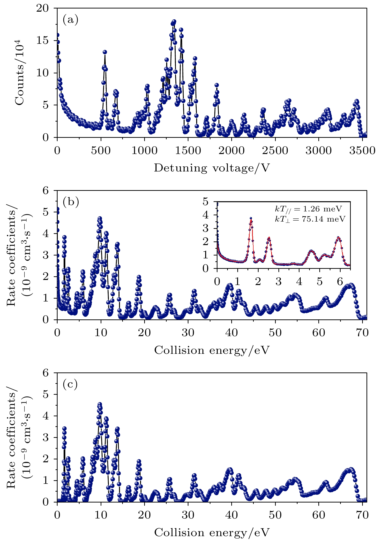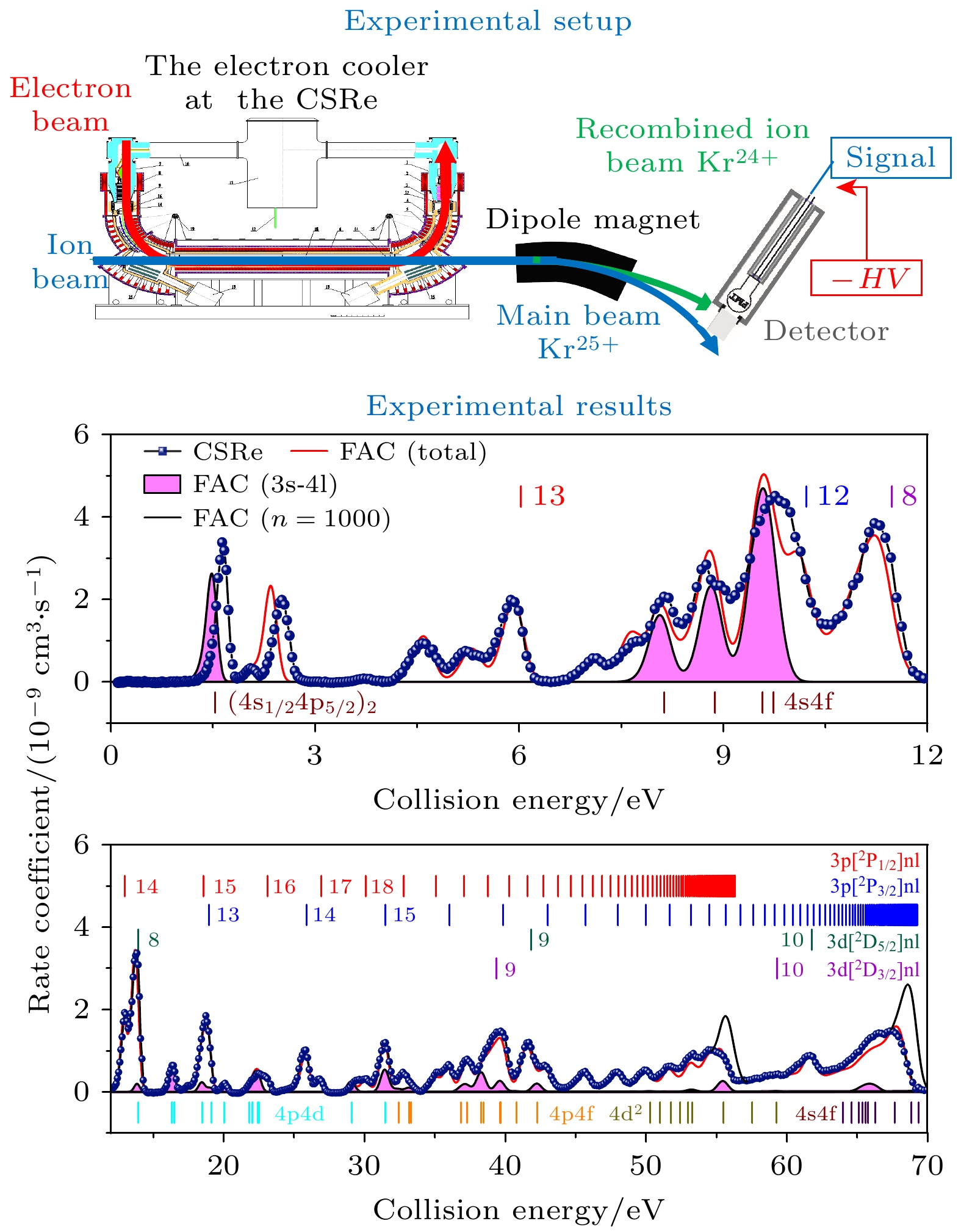 The experimental study of precision spectroscopy of dielectronic recombination (DR) of highly charged ions is not only important for astronomical plasma and fusion plasma, but also can be used as a new precision spectroscopy to test the strong-field quantum electrodynamic effect, measure isotope shift, and extract the radius of atomic nuclei. An specially designed electron beam energy detuning system for electron-ion recombination precision spectroscopy experiments has been installed on the heavy ion storage ring CSRe in Lanzhou, China, where the electron-ion collision energy in the center-of-mass system can be detuned to 1 keV, and an independently-developed plastic scintillator detector and multiwire proportional chamber detector have been installed downstream of the electron cooler of the CSRe for detecting recombined ions. The multiwire proportional chamber detector has the ability to non-destructively monitor the profile of the ion beam in real-time while acquiring the recombined ion counts, providing guidance for optimizing the ion beam. On this basis, the first test experiment on dielectronic recombination of Kr25+ions is carried out at the CSRe, and the dielectronic recombination rate coefficients in a range of 0–70 eV in the frame of center-of-mass are measured. In order to fully understand the experimental results, we calculate the dielectronic recombination rate coefficient of the Kr25+ion by using the flexible atomic code (FAC) and make a detailed comparison with the experimental result, showing that they are in good agreement with each other, and only the resonance energy values of the two resonance peaks at 1.695 eV and 2.573 eV are significantly different. In addition, the DR resonance energy values and intensities are obtained by fitting the experimental results in a range of 0–35 eV, and we find that the transition 3s→4l (∆n= 1) contributes significantly to the experimental spectral lines. Furthermore, we compare the plasma rate coefficients derived from the DR rate coefficients with those derived from the AUTOSTRUCTURE and FAC theories, which differ by 20 percent in a temperature range less than 106K. The experimental results show that the DR experimental platform of the CSRe has very good stability and reproducibility, and can provide support for the future DR experiments of highly charged ion, i.e. for testing strong-field quantum electrodynamics effect and measuring the properties of atomic nuclei.