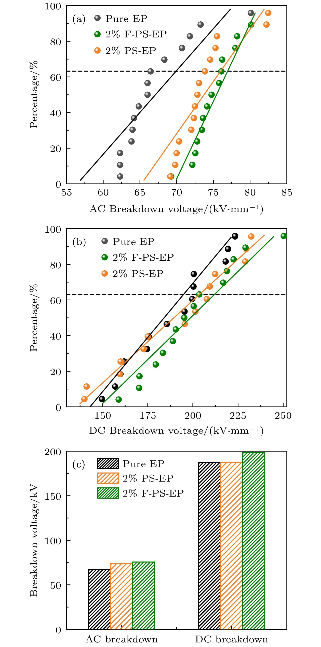 Epoxy resin nanocomposites are widely used in the field of electrical insulation packaging. It is of great significance to regulate the dielectric and insulation properties of composite materials by introducing nano-filler to meet special application requirements. This work proposes a chemical copolymerization method, fluorinated polystyrene nanospheres are synthesized through an addition reaction as filler, and finally the epoxy nanocomposites are prepared. The polystyrene nanospheres have a uniform size and good compatibility with the epoxy resin. The introducing of nanospheres reduces the dielectric constant of the epoxy resin composite material and increases the breakdown strength simultaneously. Although the dielectric loss increases, the composites’ imaginary part remains below 0.04 within 1 MHz frequency. In particular, the fluorinated polystyrene/epoxy composite with a mass fraction of 2% exhibits a decrease in dielectric constant and DC conductivity, while the AC breakdown strength and DC breakdown strength increase by 12.6% and 6%, respectively.
