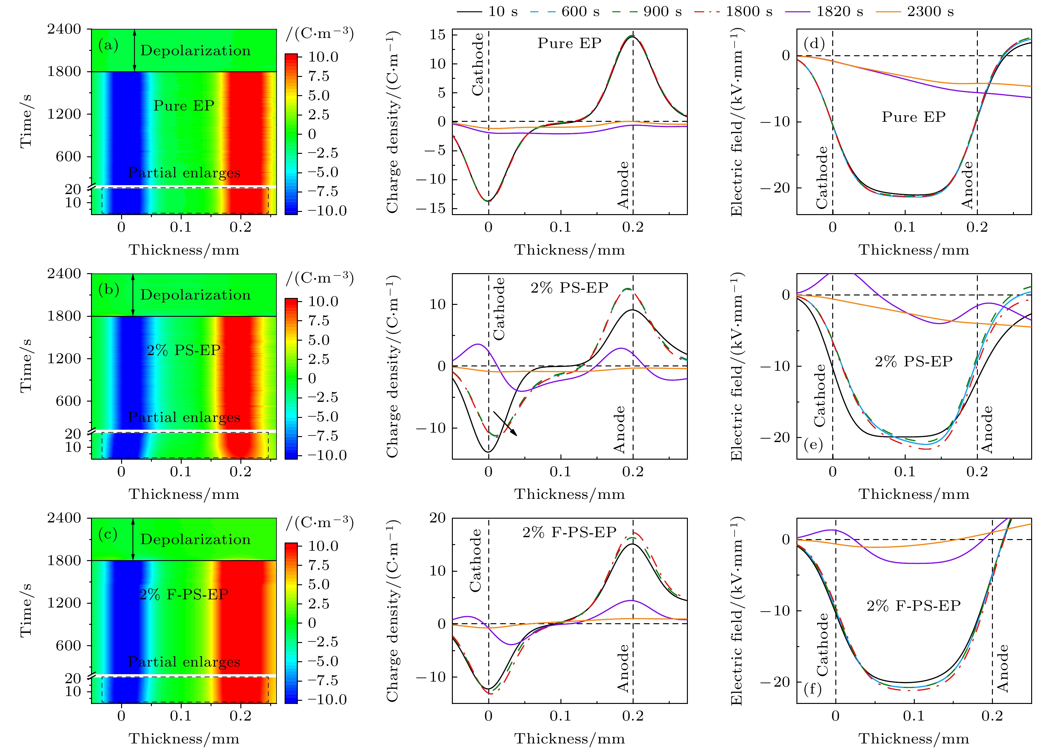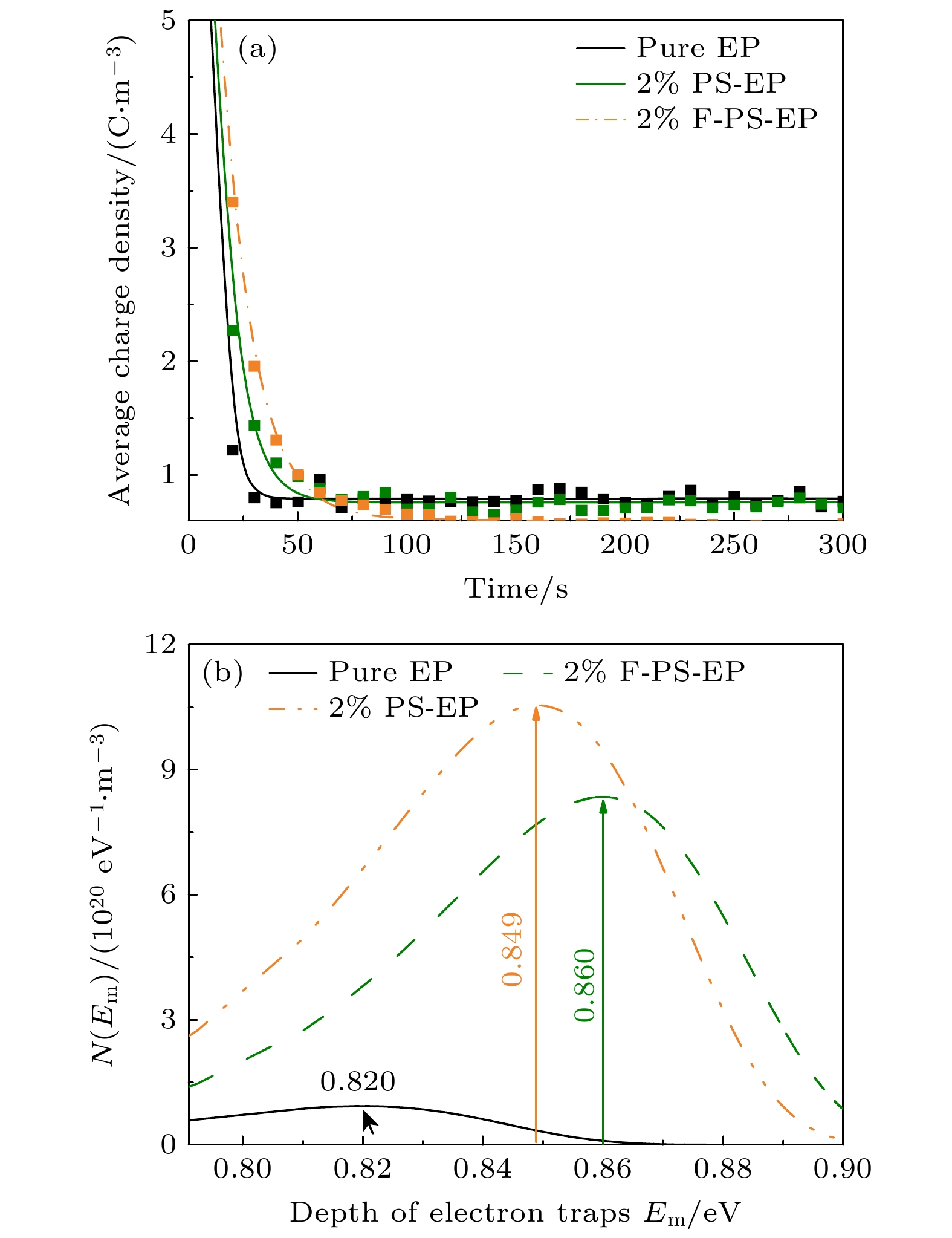 The results of the pulse electro-acoustic method indicate that the charge injection of the epoxy resin filled with non-fluorinated polystyrene nanospheres is evident, while the introduction of fluorinated nanospheres significantly reduces the charge injection level. Calculations based on the depolarization process reveal that the introduction of fillers leads to an increase in trap density and depth of energy levels in the composites. Notably, the epoxy resin filled with fluorinated fillers has the deepest trap levels, providing an explanation for the improved insulation breakdown performance. The research can provide guidance for regulating dielectric properties of epoxy composites and material synthesis for the application of electrical insulation packaging