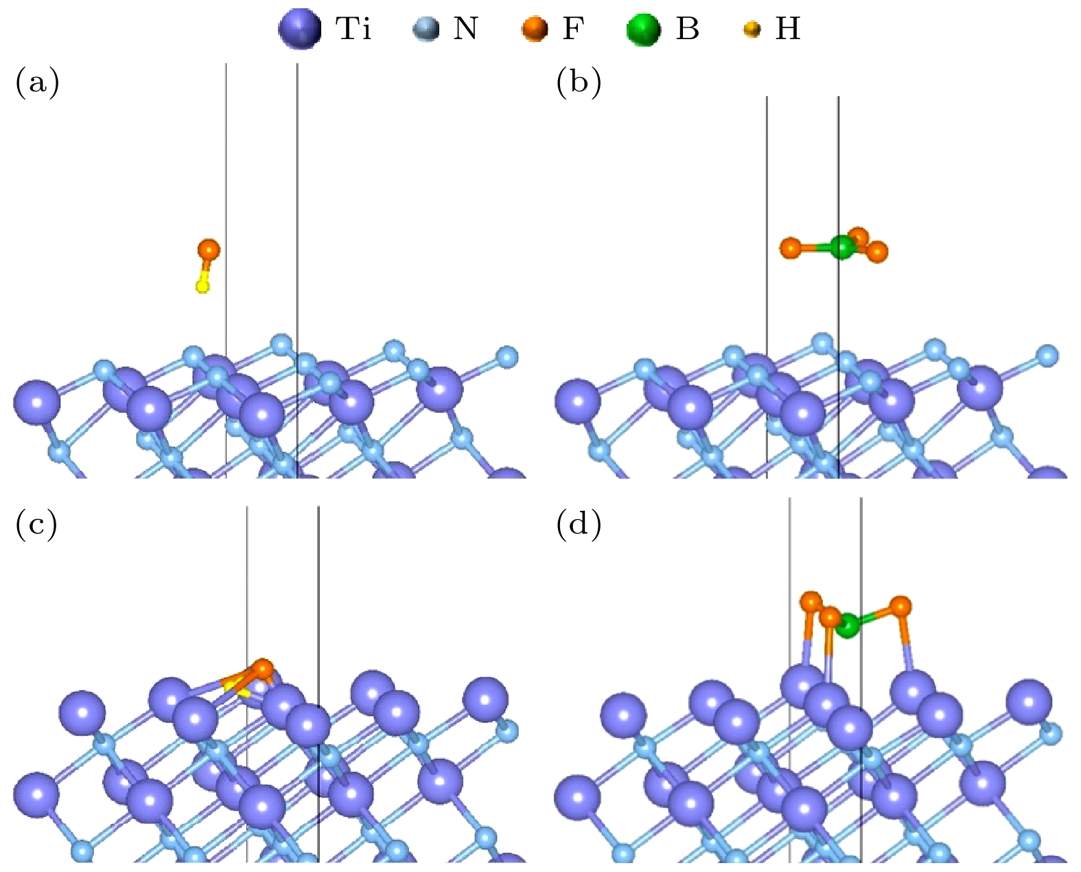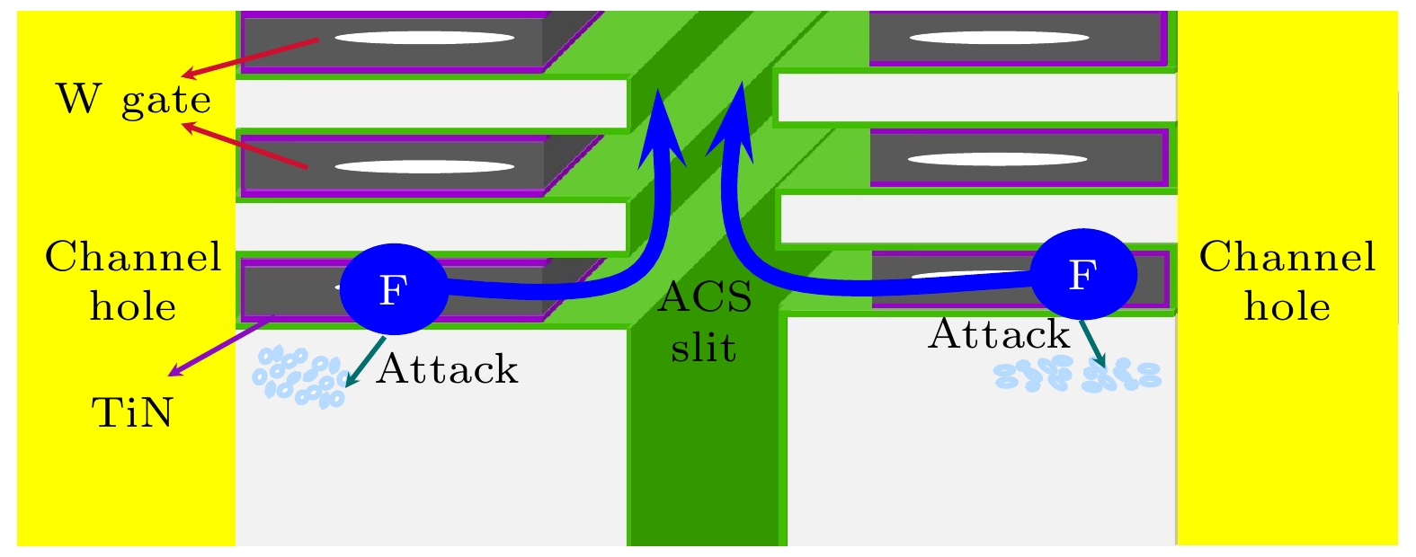 Three-dimensional (3D) NAND flash memory is a key technology in the field of mainstream memory solutions, which is primarily due to its extremely low bit cost. The architecture of 3D NAND, characterized by its vertically stacked design, substantially enhances the capacity of individual chips. This advancement is completely consistent with the demands for high-capacity data storage in contemporary environments, securing its widespread adoption in diverse application scenarios. As storage density increases, the complexity of process integration increases, bringing new challenges. The word lines in 3D NAND are typically filled by using gate replacement techniques, and compared with chemical vapor deposition (CVD), atomic layer deposition (ALD) is favored for its superior step-coverage, especially for depositing tungsten (W) at the gate. However, due to the complexity of the replacement gate deposition structure, fluorine (F) residues are found in the voids of the tungsten metal gate filling structure and diffuse into the surrounding structure under subsequent process conditions, corroding other films such as silicon oxide and degrading device performance and reliability. To alleviate the problem of fluorine attack, a thin layer of titanium nitride is usually deposited as a barrier layer before deposition of tungsten gate, which blocks the fluorine in the tungsten gate and prevents its diffusion into the oxide layer. Previously, there were studies to increase the ability to stop F diffusion by varying the thickness of the F blocking layer (TiN). However, increasing the thickness of TiN will further increase the complexity of high aspect ratio etching in the 3D NAND process, which will have adverse effect on subsequent processes. To further minimize the effect of fluorine erosion, residual fluorine elements can be removed by introducing annealing in the subsequent process flow. In the actual 3D NAND process, elemental fluorine (F) is adsorbed and accumulates on the TiN surface, and is further activated by subsequent high-temperature processes, leading to severe fluorine erosion. The delay between TiN deposition and subsequent processing steps is hypothesized to facilitate fluorine adsorption due to the oxidation of TiN. This work corroborates this hypothesis through first-principles calculations, and demonstrates the role of TiN oxidation in fluorine adsorption. In this work, we evaluate the effect of this oxidation on the fluorine-blocking effectiveness of the TiN barrier layer. We simulate the adsorption of fluorine-containing by-products on TiN and its oxides, providing theoretical insights into mitigating fluorine attack. The higher degree of oxidation of TiN is more likely to cause F adsorption, and Ti exposed surface TiN is more prone to oxidation, which is more likely to cause F adsorption in unoxidized condition and oxidized condition. Based on these insights, we implemente an ammonia purge treatment in 3D NAND manufacturing, which effectively minimizes fluorine attack, reducing the leakage probability of word line by 25% and wafer warpage by 43%.