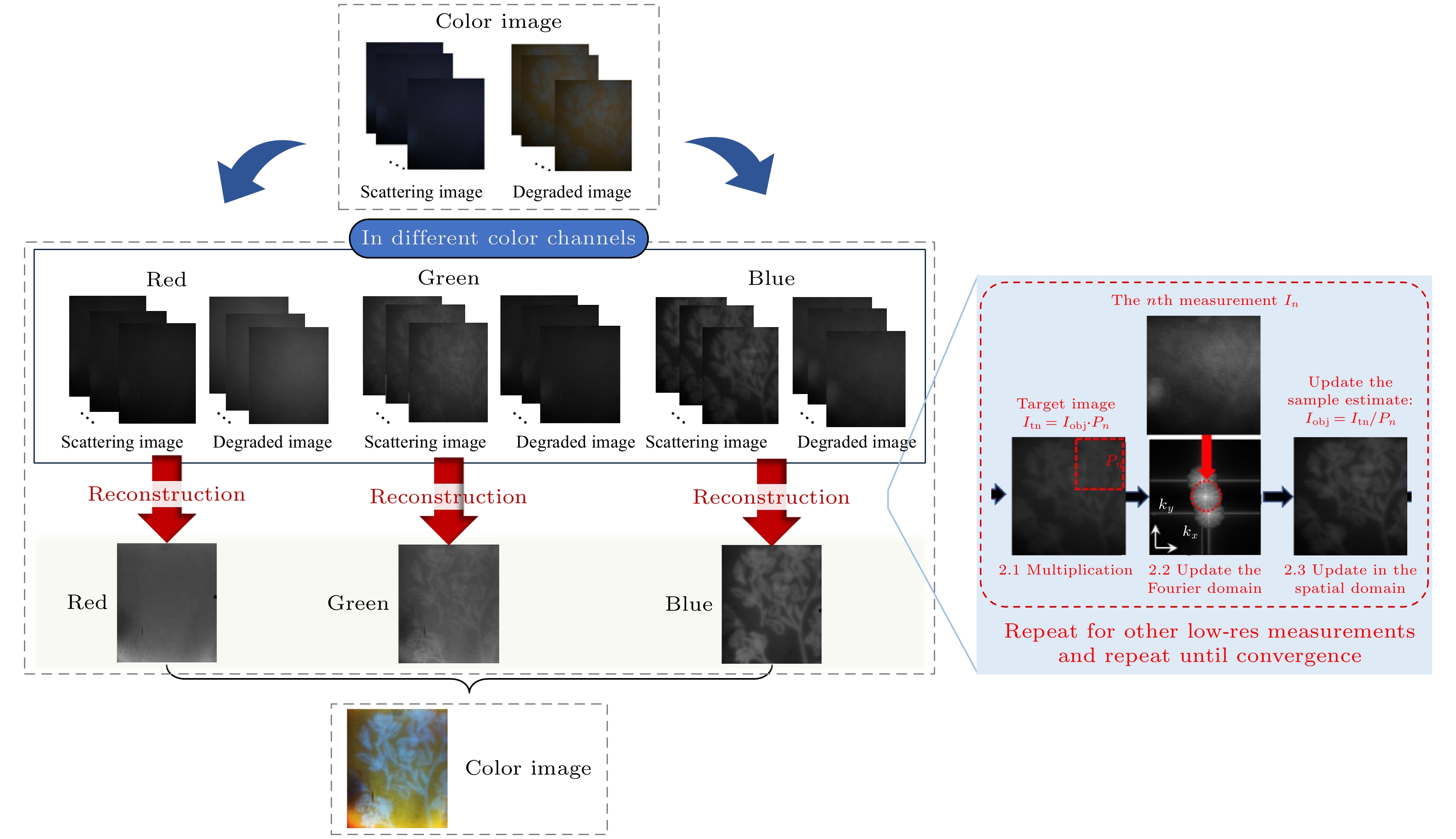 Compared with traditional scattering imaging model, the proposed method can perform super-resolution color imaging and descattering under various conditions, and solve the problem of color cases. Furthermore, the proposed method is easy to incorporate into a traditional Fourier Ptychography imaging system to obtain high-fidelity images with better quality and effective detail information. Therefore, the proposed method has the potential to help super-resolution imaging to obtain more practical applications.