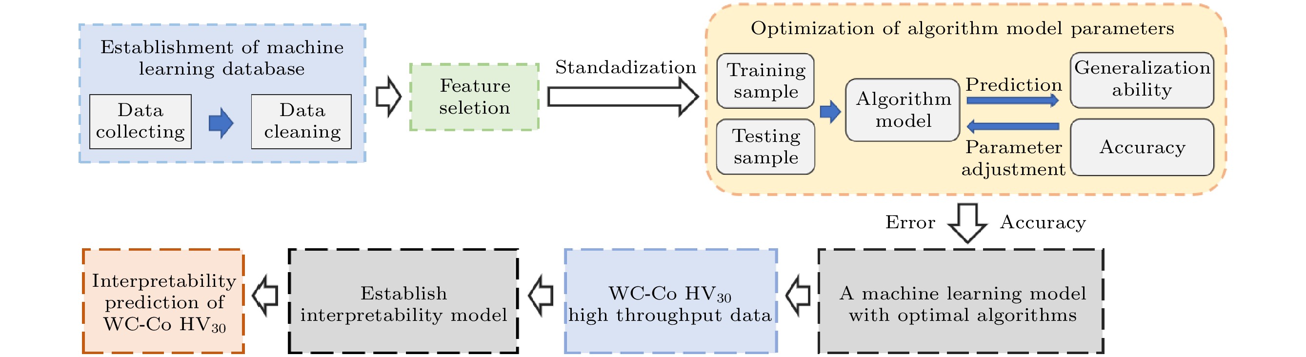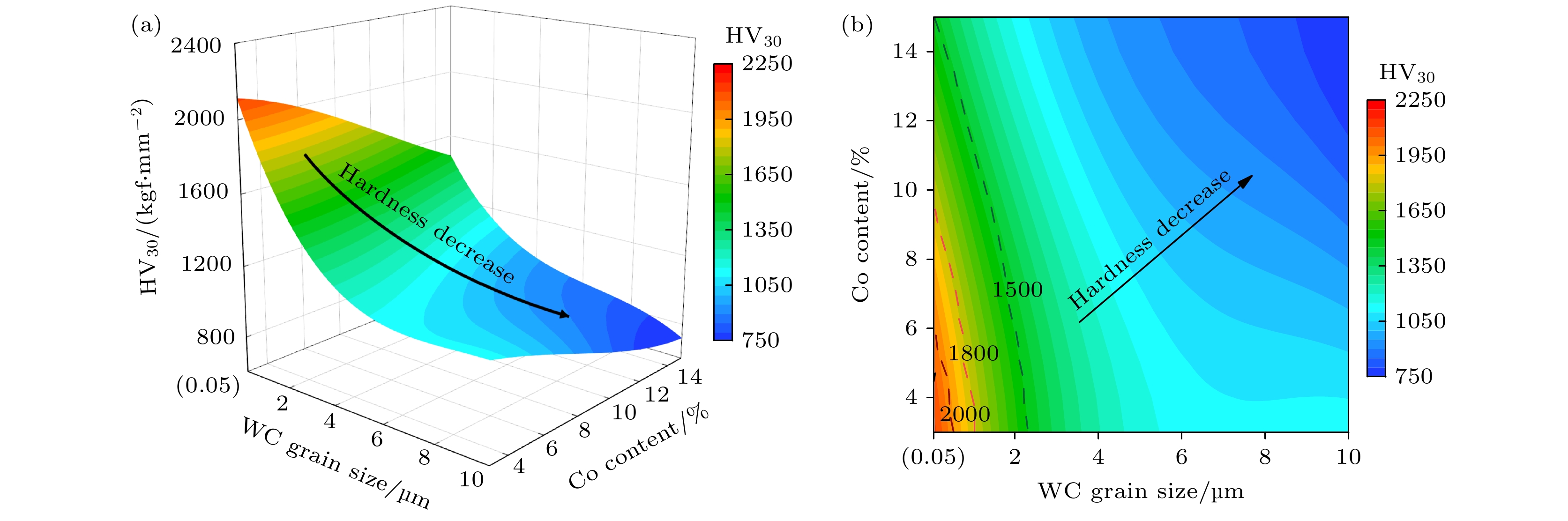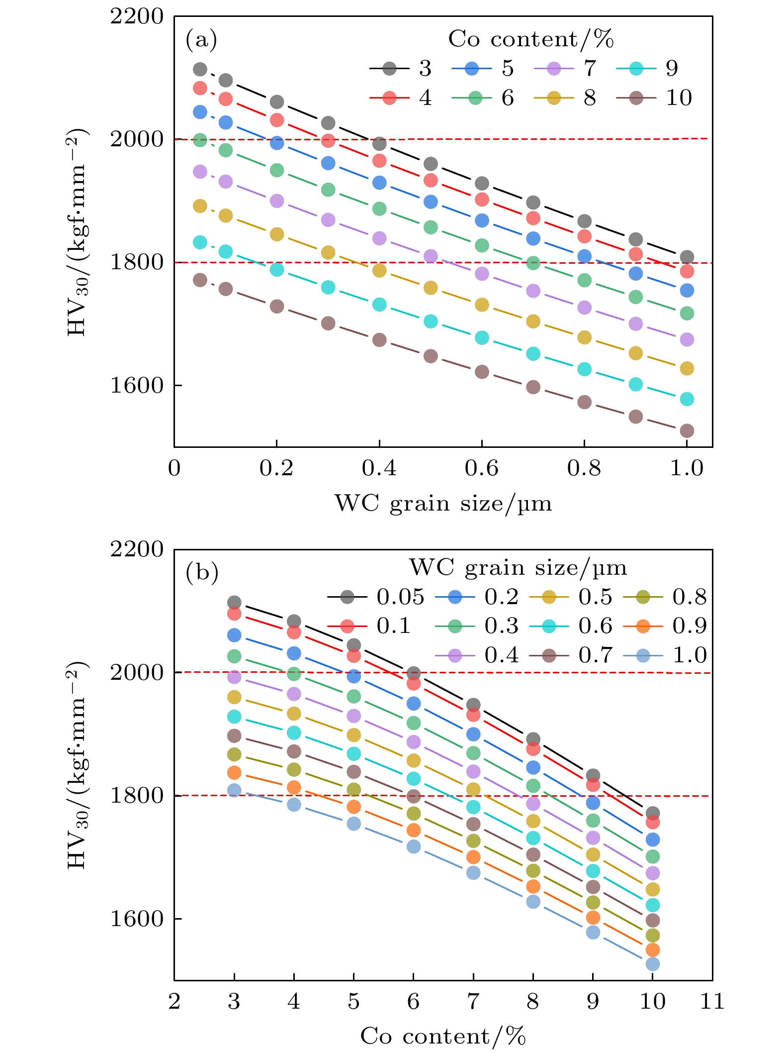 The hardness of cemented carbides is a fundamental property that plays a significant role in their design, preparation, and application evaluation. This study aims to identify the critical factors affecting the hardness of WC-Co cemented carbides and develop a high-throughput predictive model for hardness. A dataset consisting of raw material composition, sintering parameters and characterization results of cemented carbides is constructed in which the hardness of cemented carbide is set as the target variable. By analyzing the Pearson correlation coefficient, Shapley additive explanations (SHAP) results, WC grain size and Co content are determined to be the key characteristics influencing the hardness of cemented carbide. Subsequently, machine learning models such as support vector regression (SVR), polynomial regression (PR), gradient boosting decision tree (GBDT), and random forest (RF) are optimized to construct prediction models for hardness. Evaluations using 10-fold cross-validation demonstrate that the GBDT algorithm model exhibits the highest accuracy and strong generalization capability, making it most suitable for predicting and analyzing the hardness of cemented carbides. Based on predictions from GBDT algorithm model, PR algorithm model is established to achieve high-precision interpretable prediction of the hardness of cemented carbides. As a result, a quantitative relationship between hardness and Co content and WC grain size is obtained, demonstrating that reducing grain size and Co content is the key to obtaining high hardness of cemented carbide. This research provides a data-driven method for accurately and efficiently predicting cemented carbide properties, presenting valuable insights for the design and development of high-performance cemented carbide materials.
