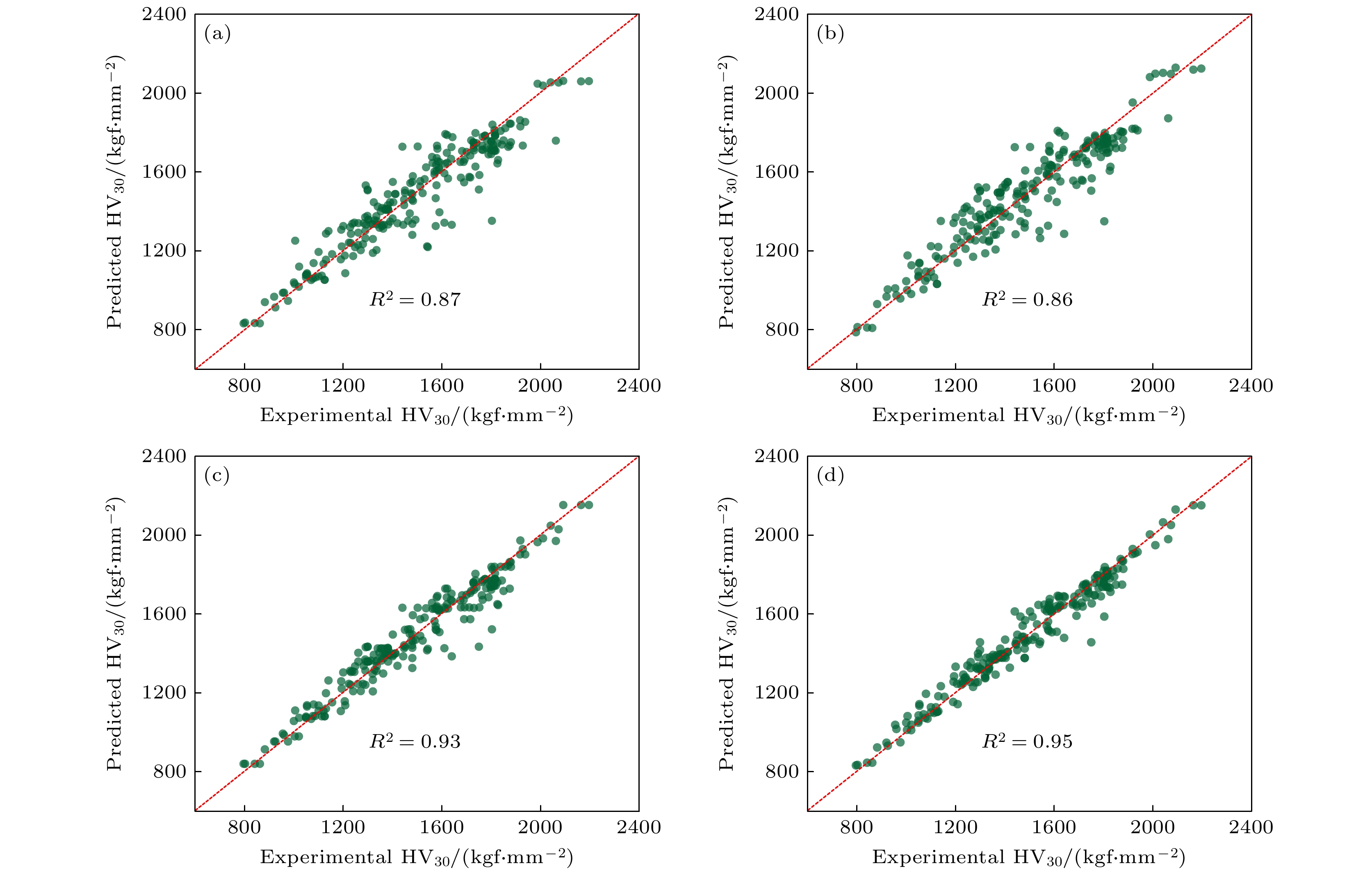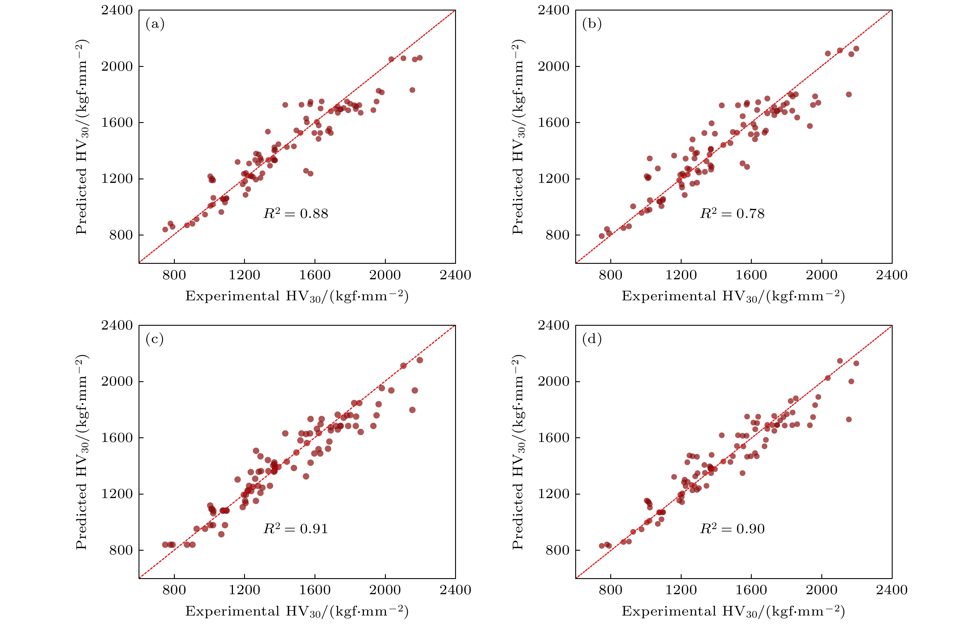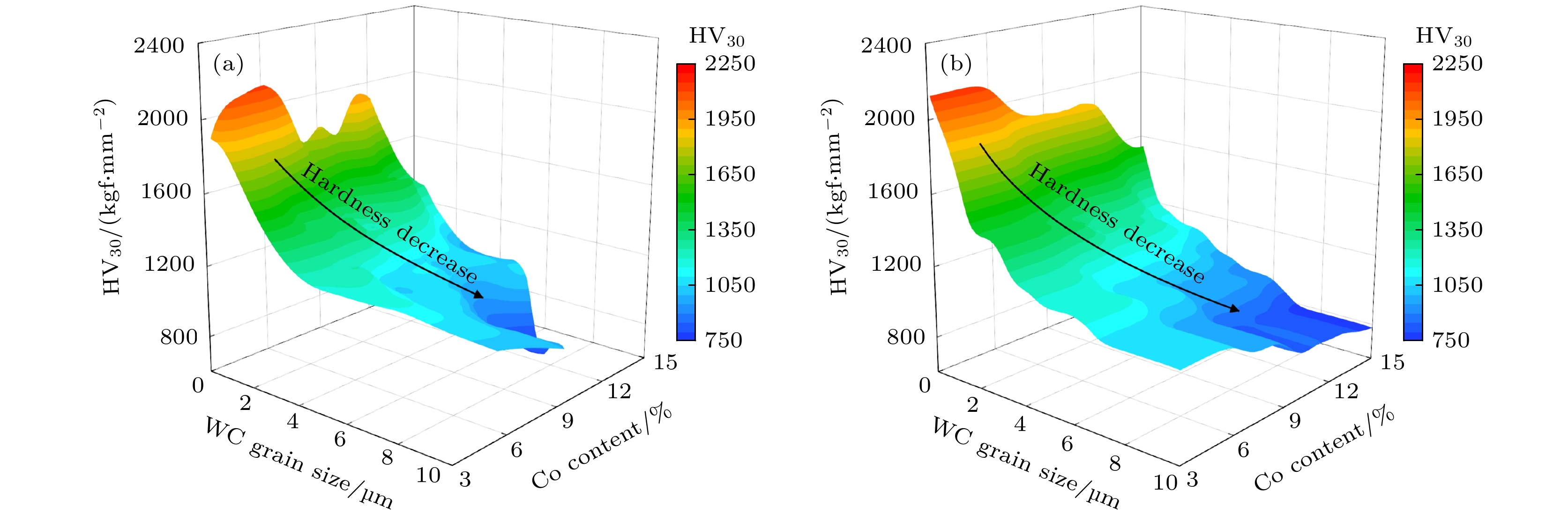The hardness of cemented carbides is a fundamental property that plays a significant role in their design, preparation, and application evaluation. This study aims to identify the critical factors affecting the hardness of WC-Co cemented carbides and develop a high-throughput predictive model for hardness. A dataset consisting of raw material composition, sintering parameters and characterization results of cemented carbides is constructed in which the hardness of cemented carbide is set as the target variable. By analyzing the Pearson correlation coefficient, Shapley additive explanations (SHAP) results, WC grain size and Co content are determined to be the key characteristics influencing the hardness of cemented carbide. Subsequently, machine learning models such as support vector regression (SVR), polynomial regression (PR), gradient boosting decision tree (GBDT), and random forest (RF) are optimized to construct prediction models for hardness. Evaluations using 10-fold cross-validation demonstrate that the GBDT algorithm model exhibits the highest accuracy and strong generalization capability, making it most suitable for predicting and analyzing the hardness of cemented carbides. Based on predictions from GBDT algorithm model, PR algorithm model is established to achieve high-precision interpretable prediction of the hardness of cemented carbides. As a result, a quantitative relationship between hardness and Co content and WC grain size is obtained, demonstrating that reducing grain size and Co content is the key to obtaining high hardness of cemented carbide. This research provides a data-driven method for accurately and efficiently predicting cemented carbide properties, presenting valuable insights for the design and development of high-performance cemented carbide materials.