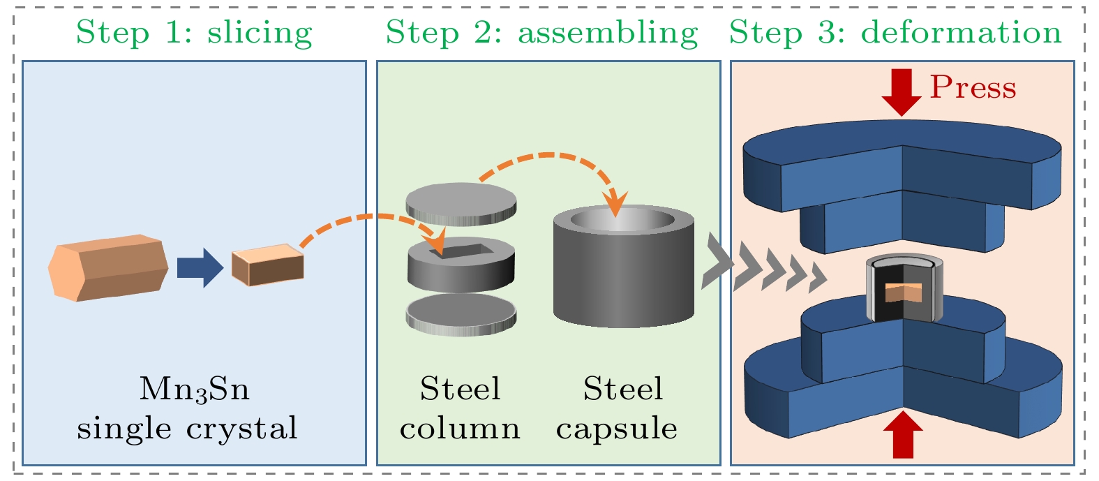 How to achieve spin control of noncollinear antiferromagnetic Mn3Sn at room temperature is a challenge. In this study, we modulate the magnetic structure of Mn3Sn single crystals by subjecting them to uniaxial stress at the GPa level using a high-pressure combined deformation method. Initially, the single crystal is sliced into regular cuboids, then embedded in a stainless steel sleeve, and finally, uniaxial stress is applied along the