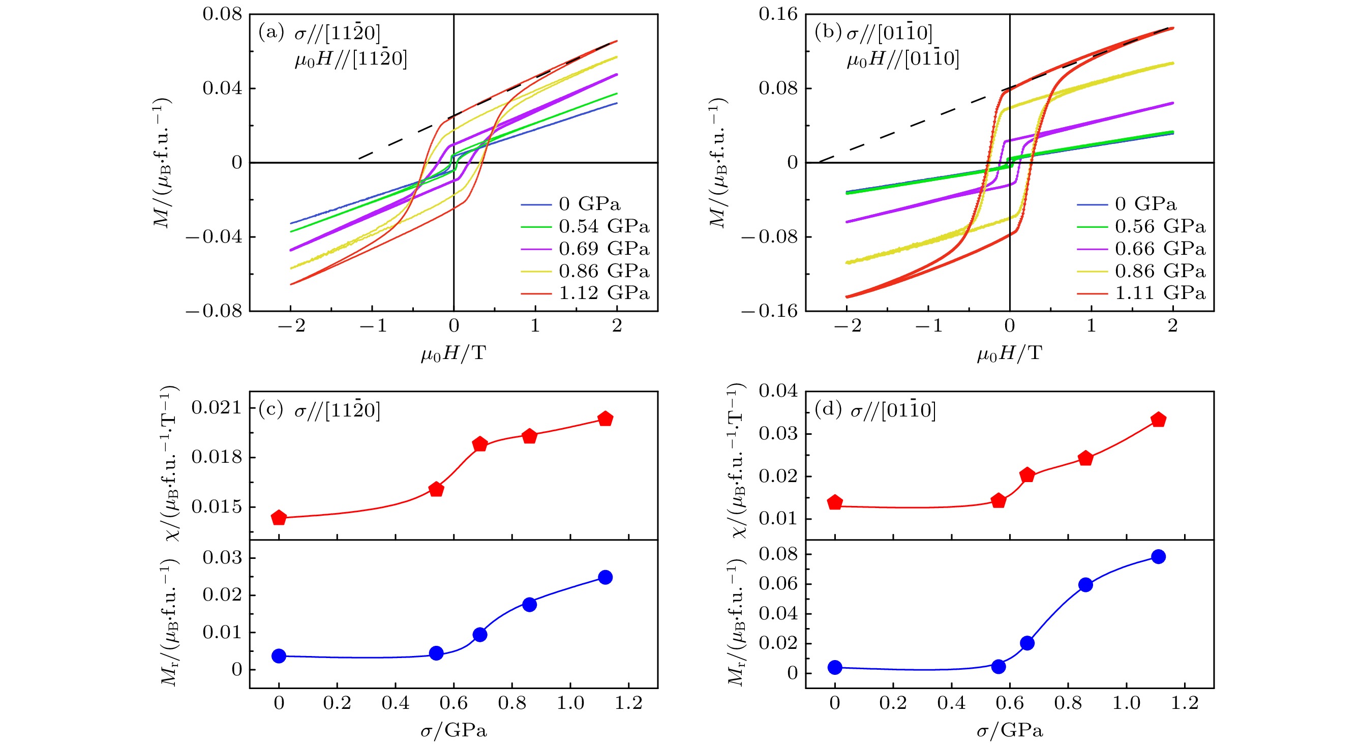 when the stress is 1.11 GPa. This result is also 2.66 times greater than the reported results. We further calculate the values of trimerization parameter (ξ), isotropic Heisenberg exchange interaction (J), and anisotropic energy (δ) of the system under different stresses. Our results show thatξgradually increases,Jgradually decreases, andδgradually increases with the increase of stress. These results show that the GPa uniaxial stress introduces anisotropic strain energy into the single crystal, breaking the symmetry of the in-plane hexagon of the kagome lattice, which causes the bond length of the two equilateral triangles composed of Mn atoms to change. Thus, the exchange coupling between Mn atoms in the system is affected, the anisotropy of the system is enhanced, and the antiferromagnetic coupling of the system is enhanced. Therefore, the systemχis no longer a constant value and gradually increases with the increase of stress. This discovery will provide new ideas for regulating the anti-ferromagnetic spin.