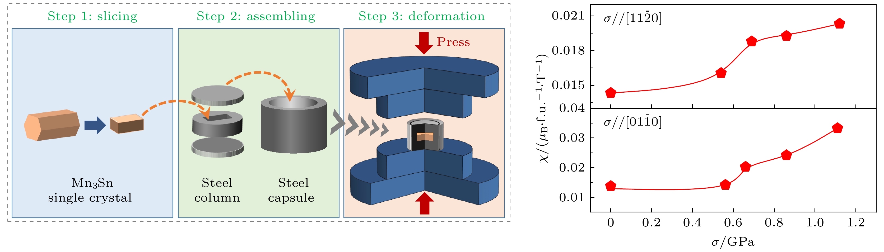 direction of the Mn3Sn single crystal. Under high stress, the single crystal undergoes plastic deformation. Our observations reveal lattice distortion in the deformed single crystal, with the lattice parameter gradually decreasing as the stress level increases. In addition, the magnetic susceptibility of Mn3Sn under GPa uniaxial stress (χ) is different from that under MPa uniaxial stress, and its value is no longer fixed but increases with the increase of stress. When 1.12 GPa stress is applied in the