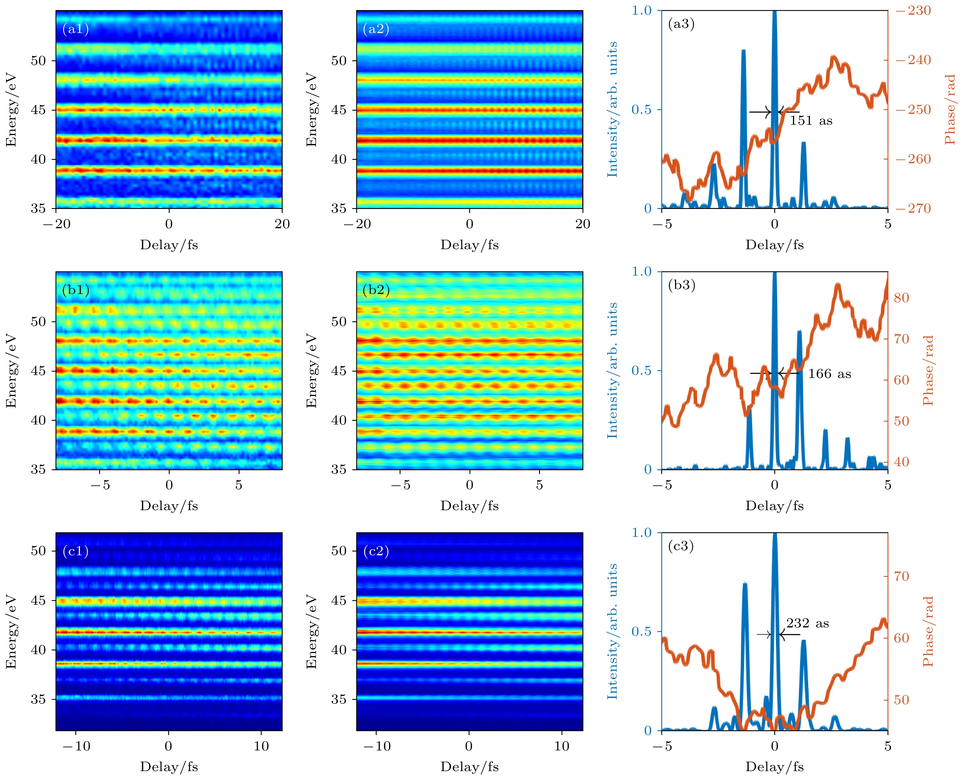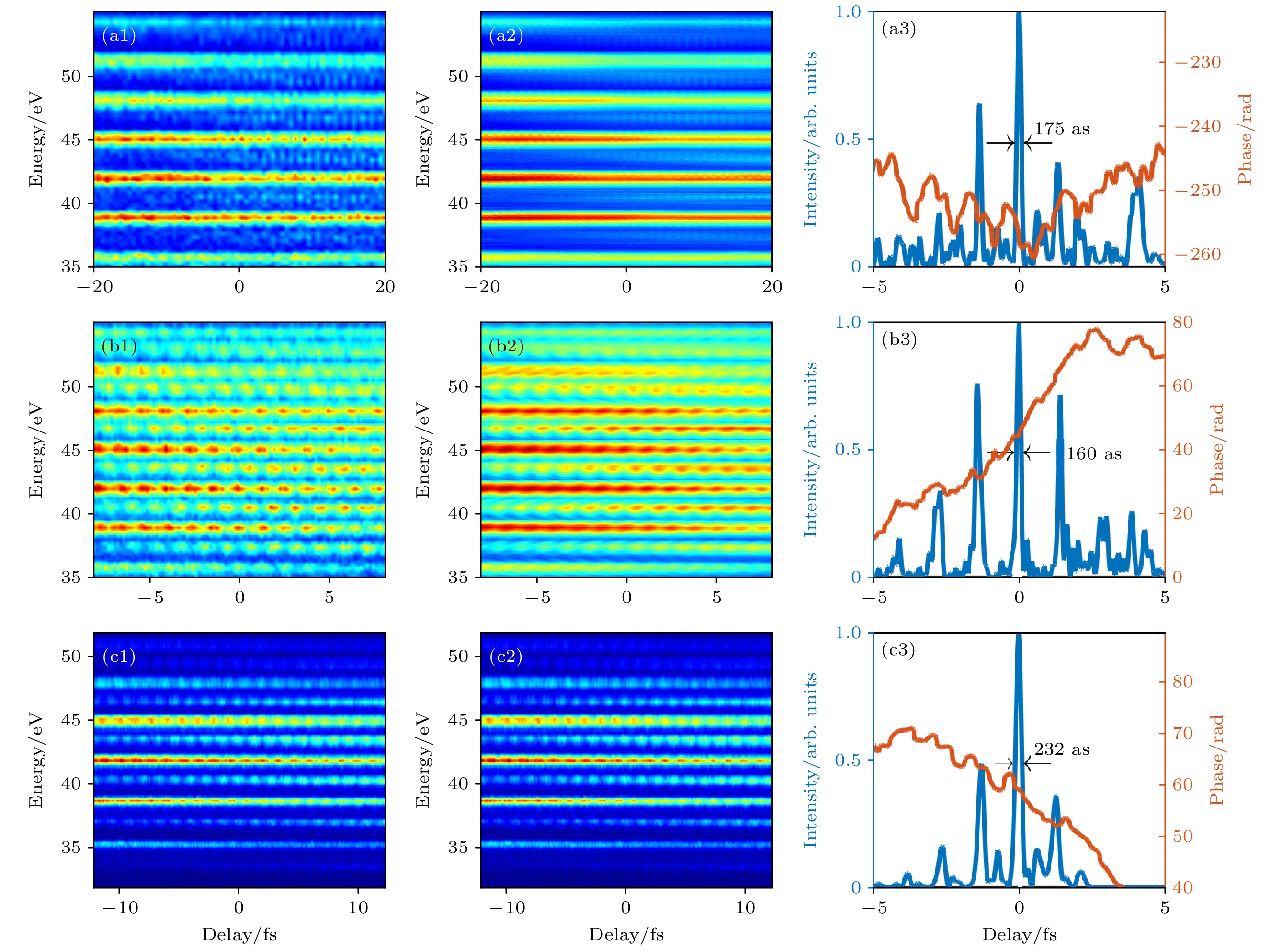 Methods The experimental approach involves the use of a homebuilt femtosecond titanium sapphire regenerative amplifier to produce high-order harmonics, leading to the generation of APTs. The setup includes the homebuilt titanium sapphire chirped pulse amplifier and a collinear attosecond pulse generation and measurement beamline, which are used to conduct RABITT experiments. The process requires the interaction of femtosecond lasers with gas targets to generate high-energy photons in the extreme ultraviolet and soft X-ray spectral ranges. By optimizing the phase-matching conditions within the gas target, strong high-order harmonic signals are observed on an XUV spectrometer. The temporal information of the attosecond pulses is indirectly measured through the photoelectron spectrum produced by the interaction of attosecond pulses with femtosecond lasers. The research also employs the FROG-CRAB algorithm and the extended phase retrieval and iterative engine (ePIE) algorithm for temporally reconstructing APTs and attempts to use a genetic algorithm to extract phase information.