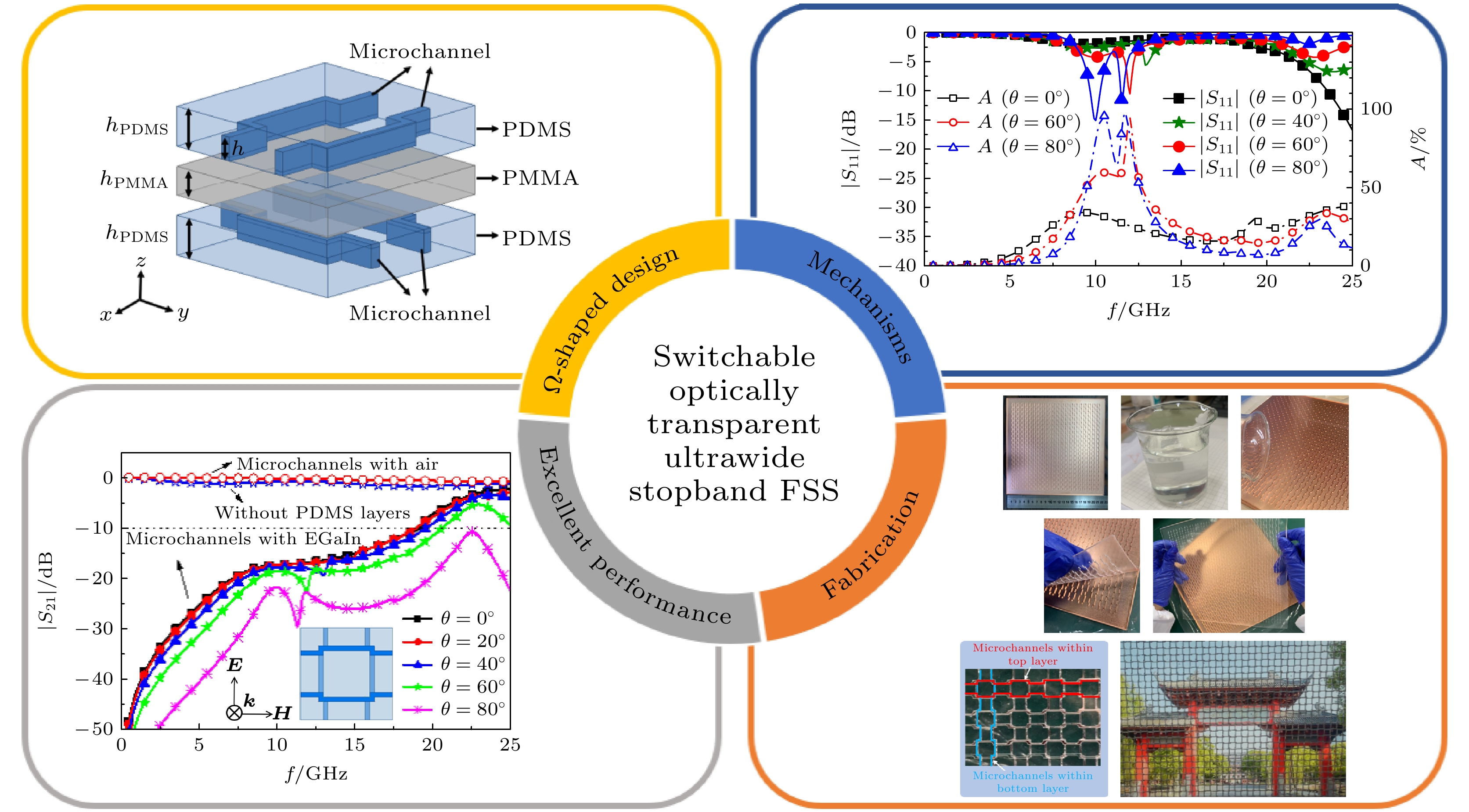 In view of the fact that high-frequency electromagnetic waves mainly enter buildings through windows and glass doors, switchable optically-transparent shielding with broad stopband is increasingly needed. Herein, a novel design for a switchable and optically transparent frequency selective surface (FSS) with ultrawide-stopband is presented in this study. The structure consists of a polymethyl methacrylate (PMMA) layer sandwiched between polydimethylsiloxane (PDMS) layers which contain liquid metal microchannels arranged in an orthogonal Ω-shaped configuration. The mobility of the liquid metal can switch the FSS response from an all-pass to an ultrawide bandstop behavior. The proposed FSS achieves a rejection bandwidth of 18.1 GHz, covering P, L, S, C, X and Ku bands, while maintaining a transparency of 81% and high angular stability up to 80°, regardless of polarization. Furthermore, the mechanism behind the ultrawide stopband and high angular stability is explored through an analysis of reflection and absorption for both TE polarization and TM polarization. Experimental validation under both normal and oblique incidence demonstrates the ultrawide-stopband performance of the fabricated FSS.