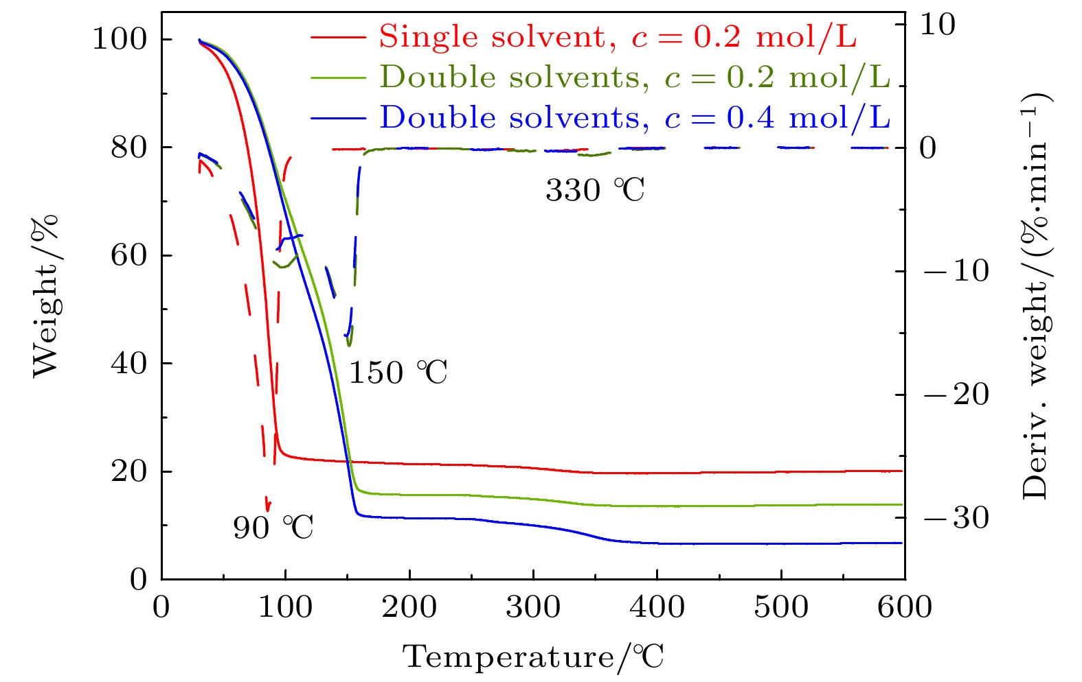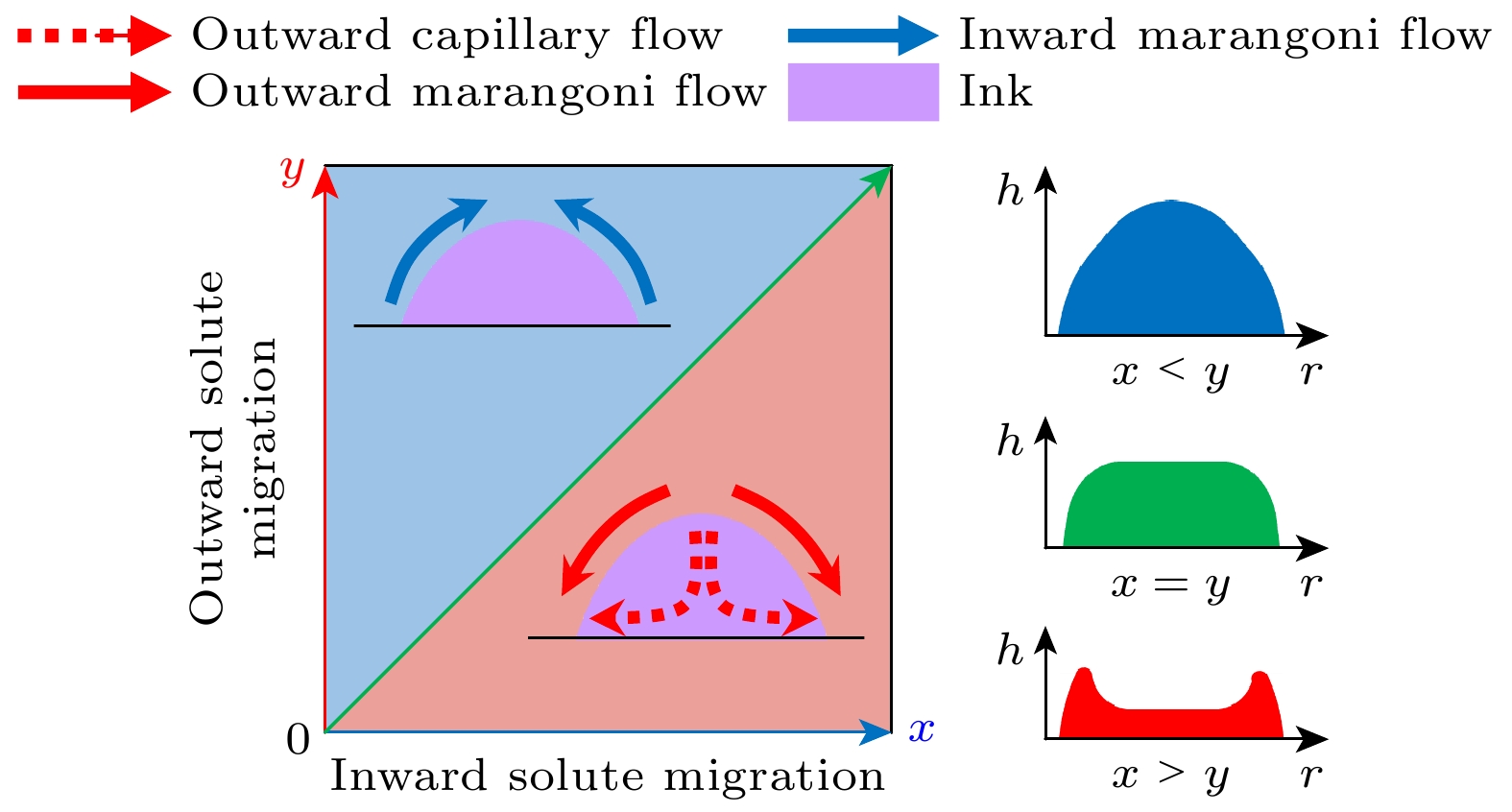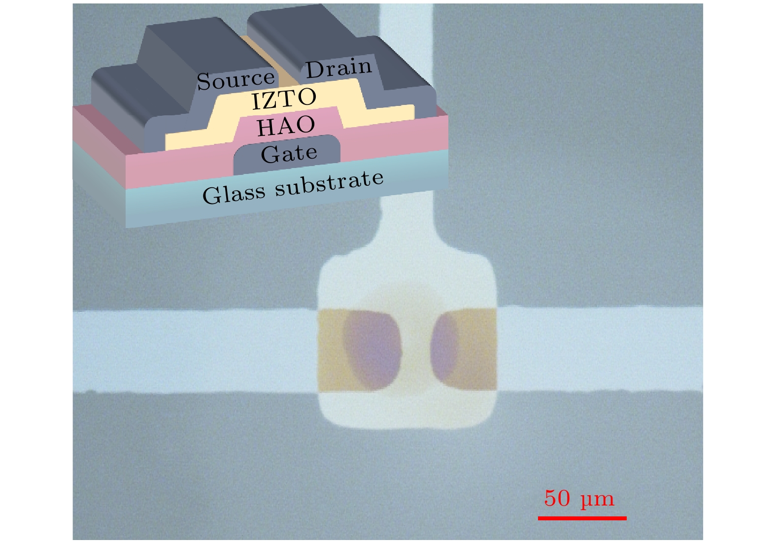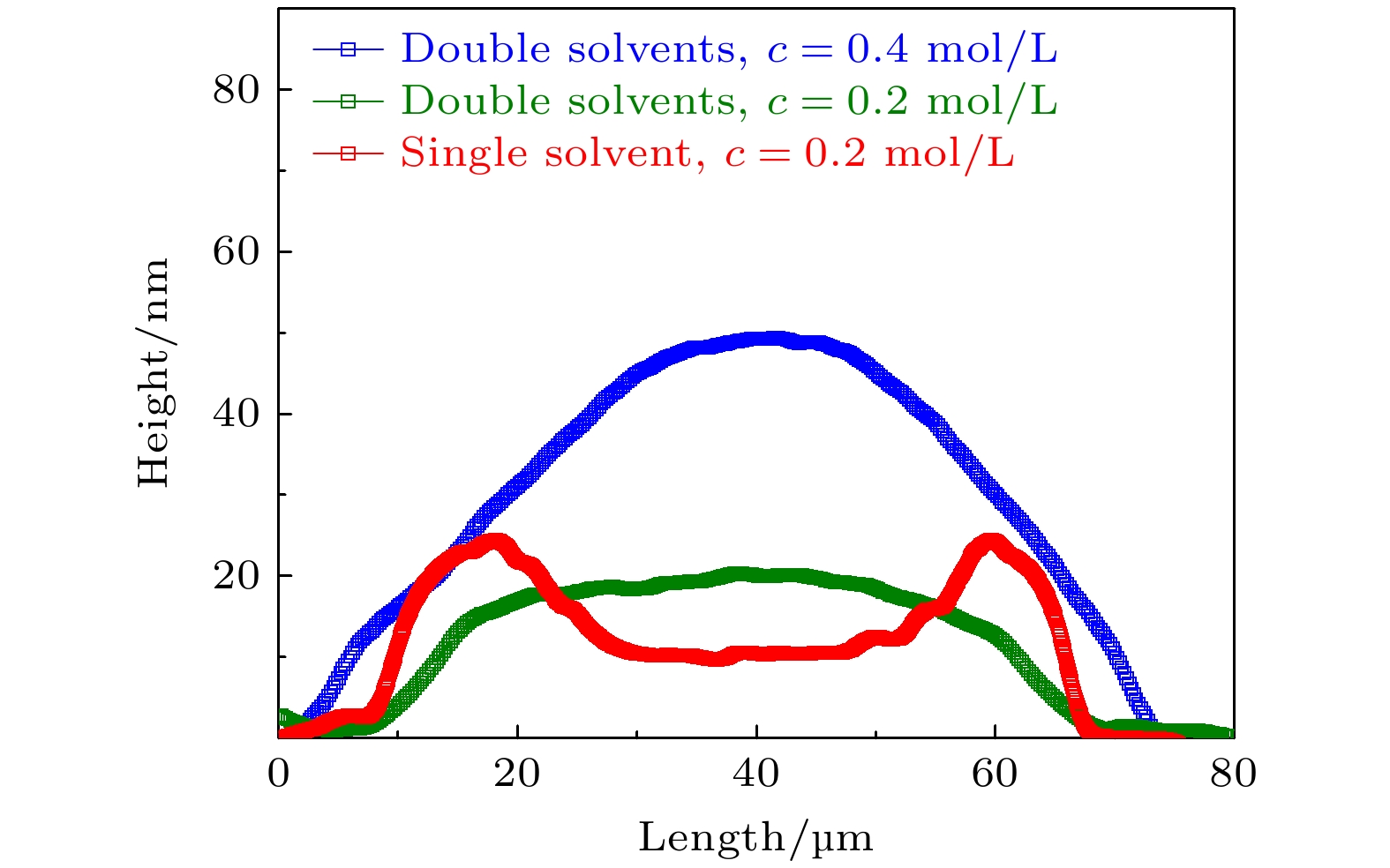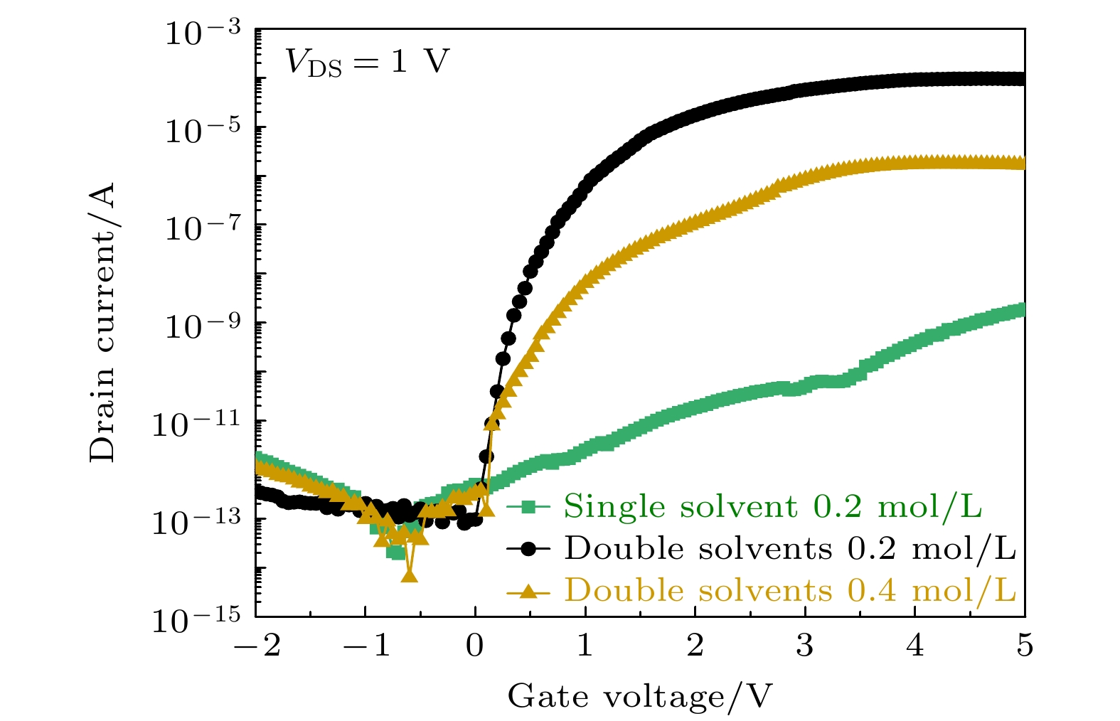 Metal oxide thin film transistor has been widely used in flat panel display industry because of its low leakage current, high mobility and large area uniformity. Besides, with the development of printed display technology, inkjet printing process can fabricate the customizable patterns on diverse substrates with no need of vacuum or lithography to be used, thus significantly reducing cost and receiving more and more attention. In this paper, we use inkjet printing technology to prepare a bottom gate bottom contact thin film transistor (TFT) by using indium-zinc-tin-oxide (IZTO) semiconductor. The surface morphology of the printed IZTO film is modified by adjusting the solvent composition and solute concentration of the printing precursor ink. The experimental result show that the use of binary solvents can effectively overcome the coffee ring shape caused by the accumulation of solute edge in the volatilization process of a single solvent, ultimately presenting a uniform and flat contour surface. Further increase in solute concentration is in favor of formation of convex surface topology. The reason for the formation of the flat surface of the oxide film is the balance between the inward Marangoni reflux of the solute and the outward capillary flow during volatilization. In addition, IZTO thin film transistor printed with binary solvents exhibits excellent electrical properties. The ratio of width/length = 50/30 exhibits a high on-off ratio of 1.21×109, a high saturation field-effect mobility is 16.6 cm2/(V·s), a low threshold voltage is 0.84 V, and subthreshold swing is 0.24 V/dec. The uniform and flat active layer thin film pattern can form good contact with the source leakage electrode, and the contact resistances of TFT devices with different width-to-length ratios are less than 1000 Ω, which can reach the basic conditions of high mobility thin film transistors prepared by inkjet printing. Therefore, using solvent mixture provides a universal and simple way to print oxide films with required surface topology, and present a visible path for inkjet printing of high-mobility thin film transistors.