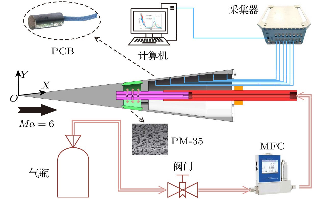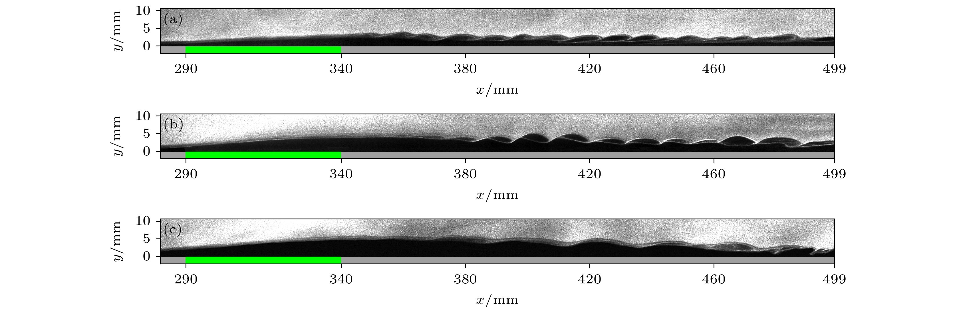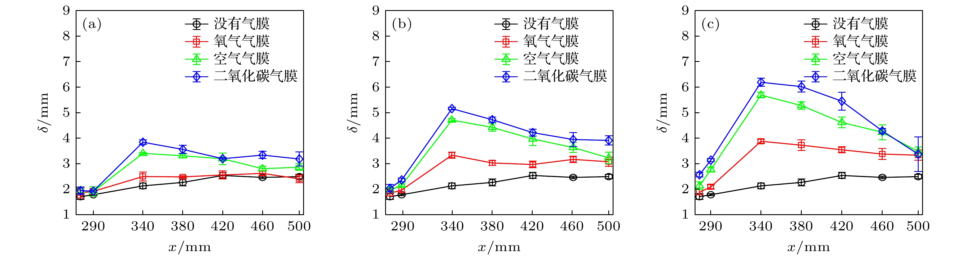 Wall-seeping gas film (WSGF) is a promising method of controlling hypersonic boundary layer transition and reducing friction drag and heat transfer. Experiments are conducted in a Mach 6 hypersonic quiet wind tunnel by using nano-tracer planar laser scattering (NPLS) and high-frequency fluctuating pressure measuring technique. This work investigates the effects of wall-seeping helium, air, and carbon dioxide gas films under identical volume flow rate condition on conical boundary layer thickness, disturbance wave structure, wavelength, frequency, amplitude, and nonlinear interaction. The experimental results reveal that the WSGF significantly thickens the hypersonic boundary layer, with the thickest position appearing at the downstream boundary of the seeping zone. The boundary layer thickness is thinnest for helium gas film but thickest for carbon dioxide gas film. Generally, air gas film and carbon dioxide gas film induce the regular, rope-like, and interlaced second-mode waves to appear in advance in the boundary layer. However, under a higher volume flow rate for carbon dioxide gas film, the disturbance wave structure resembles interface fluctuations, with a characteristic wavelength of approximately 18 mm and a peak frequency as low as about 35 kHz, but no the rope-like interlaced characteristic. At this time, the influence of shear layer instability becomes significant. The disturbance waves do not exhibit second-mode wave characteristics for wall-seeping helium gas film, whose shape is irregular and undergoes deformation with time and space. Additionally, the power spectral density of wall fluctuating pressure exhibits insignificant variation with volume flow rate and flow direction, which is similar to the characteristic of power spectral density in the laminar boundary layer and has no peak frequency. The wavelength of second-mode waves is about 2-3 times the boundary layer thickness for air gas film, and increases to more than 3 times for carbon dioxide gas film. The application of carbon dioxide gas film results in smaller peak frequency and bandwidth of disturbance wave, larger characteristic wavelength and amplitude, longer propagation distance, and stronger nonlinear interaction than the application of air gas film. In the future, attention should be paid to understanding disturbance wave characteristics in the boundary layer for the helium gas film and shear layer instability under larger volume flow rates.