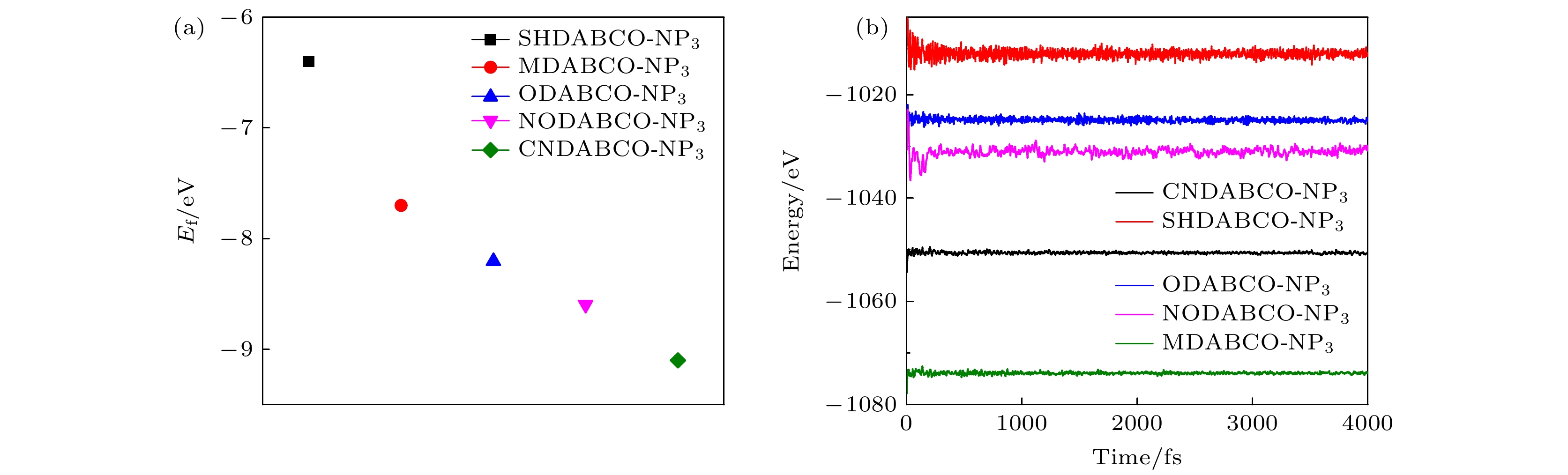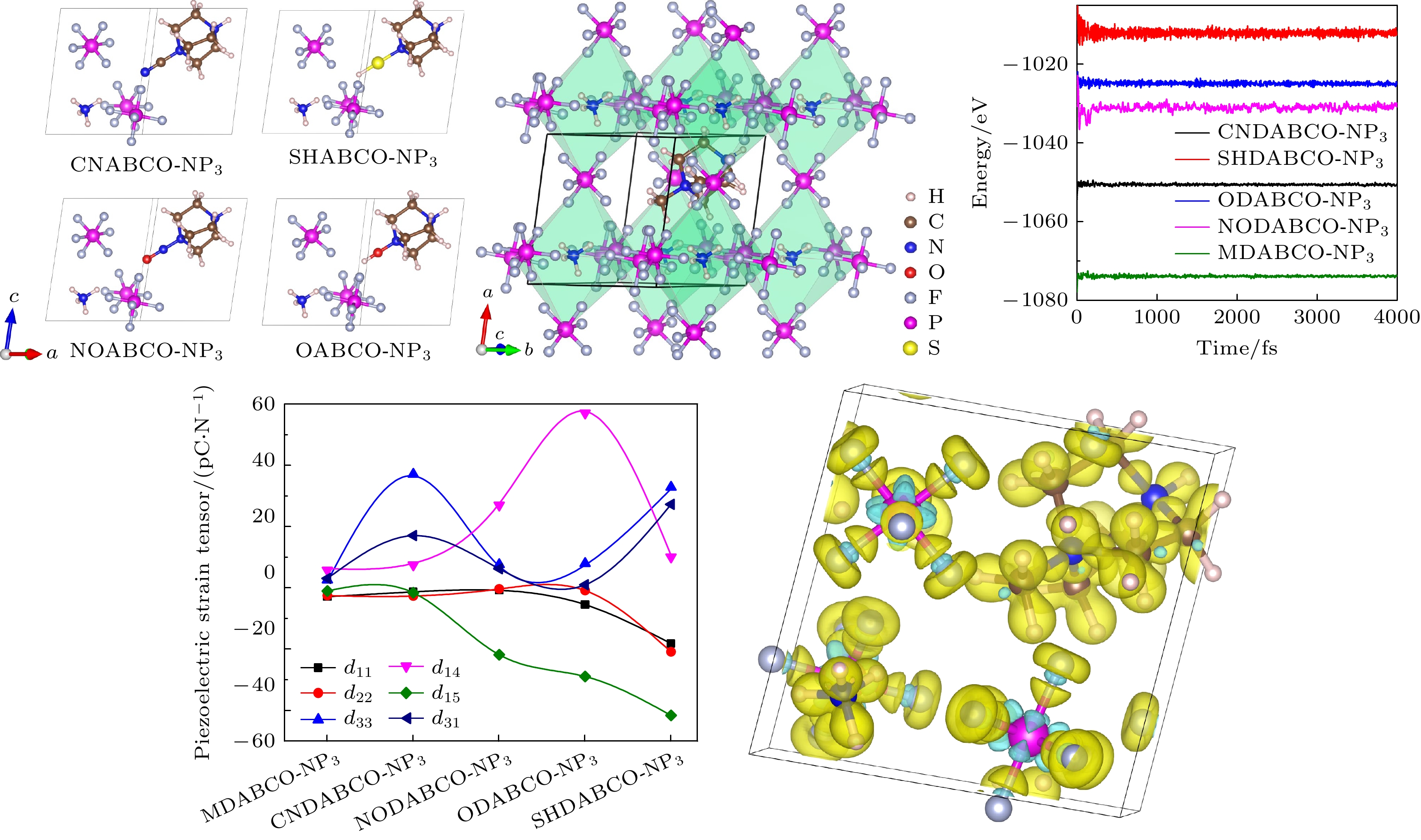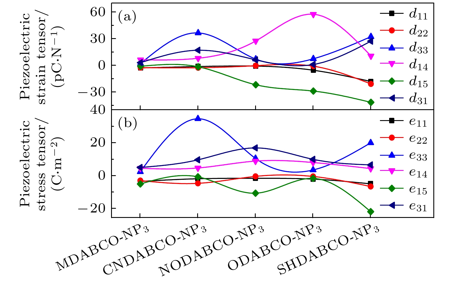 and increases the displacement of the organic cation, resulting in an increase in the contribution of the polarization of the organic cation to the total polarization. In addition, we observe large piezoelectric strain components, the calculated value ofd33is 36.5 pC/N for CNDABCO-NH4-(PF6)3, 32.3 pC/N for SHNDABCO-NH4-(PF6)3, which is larger than the known value ofd33of MDABCO-NH4-I3(14pC/N). The calculated value ofd14is 57.5 pC/N for ODABCO-NH4-(PF6)3, 27.5 pC/N for NODABCO-NH4-(PF6)3. These components are at a high level among known organic perovskite materials and comparable to many known inorganic crystals. The large value ofd14is found to be closely related to the large value of elastic compliance tensors44. The analysis of Young’s modulus and bulk’s modulus shows that these organic perovskite materials have good ductility. These results indicate that these organic materials are excellent candidates for future environmentally friendly piezoelectric materials.