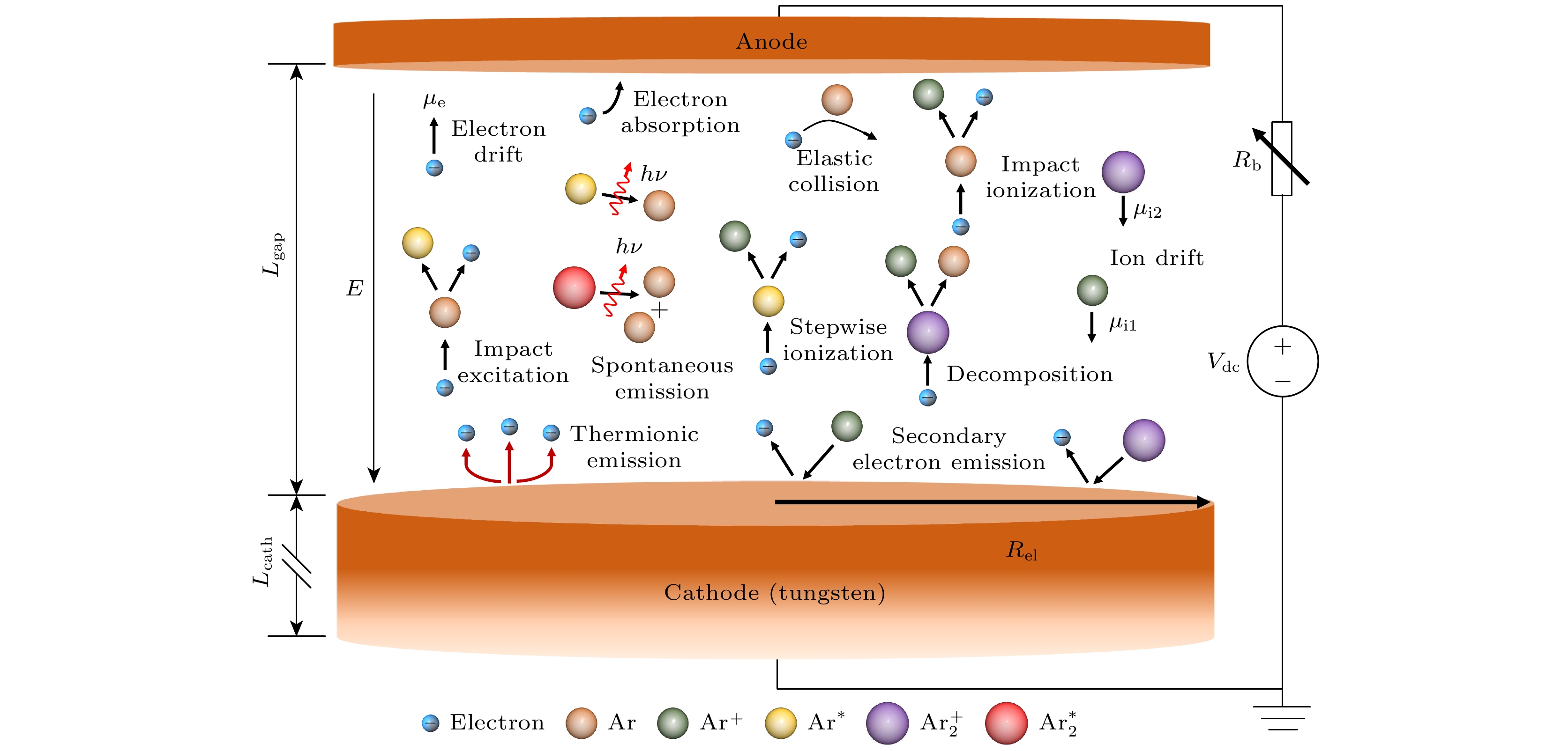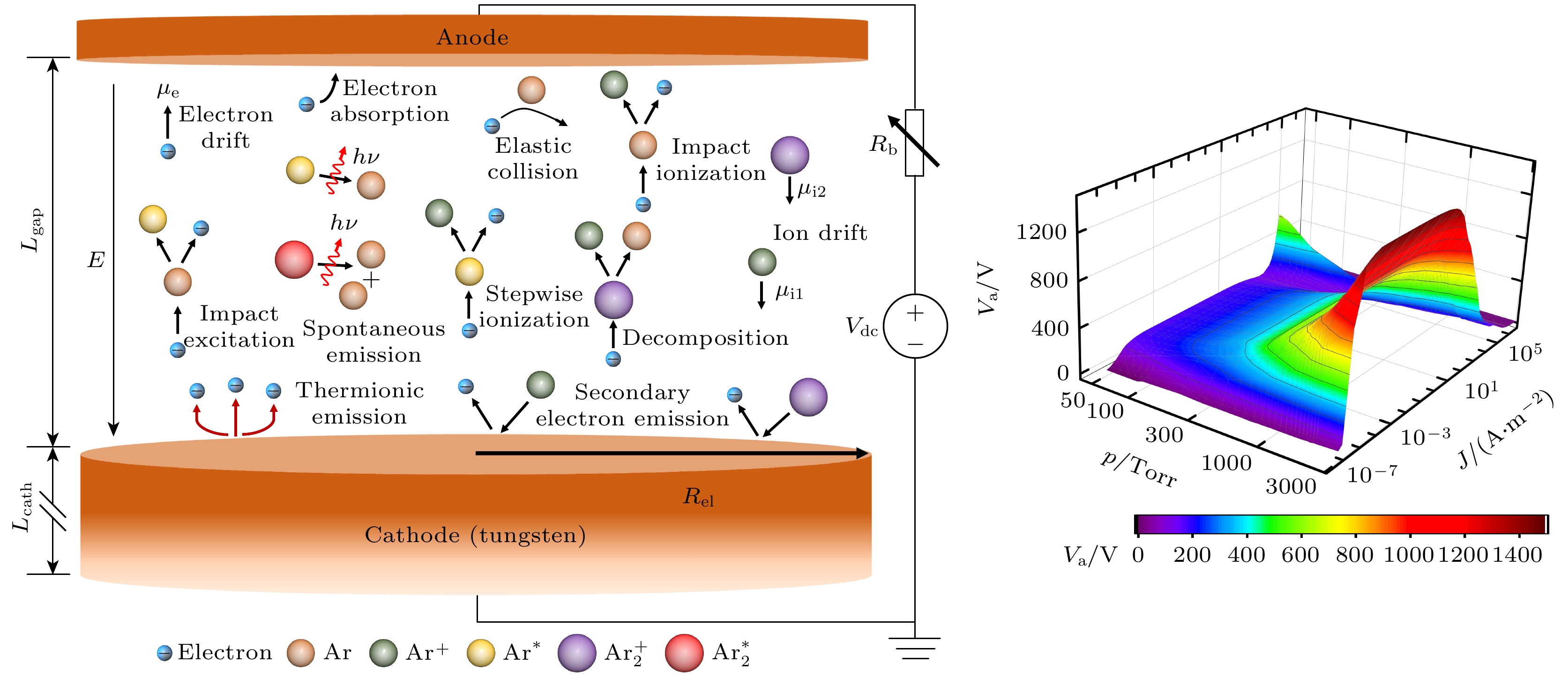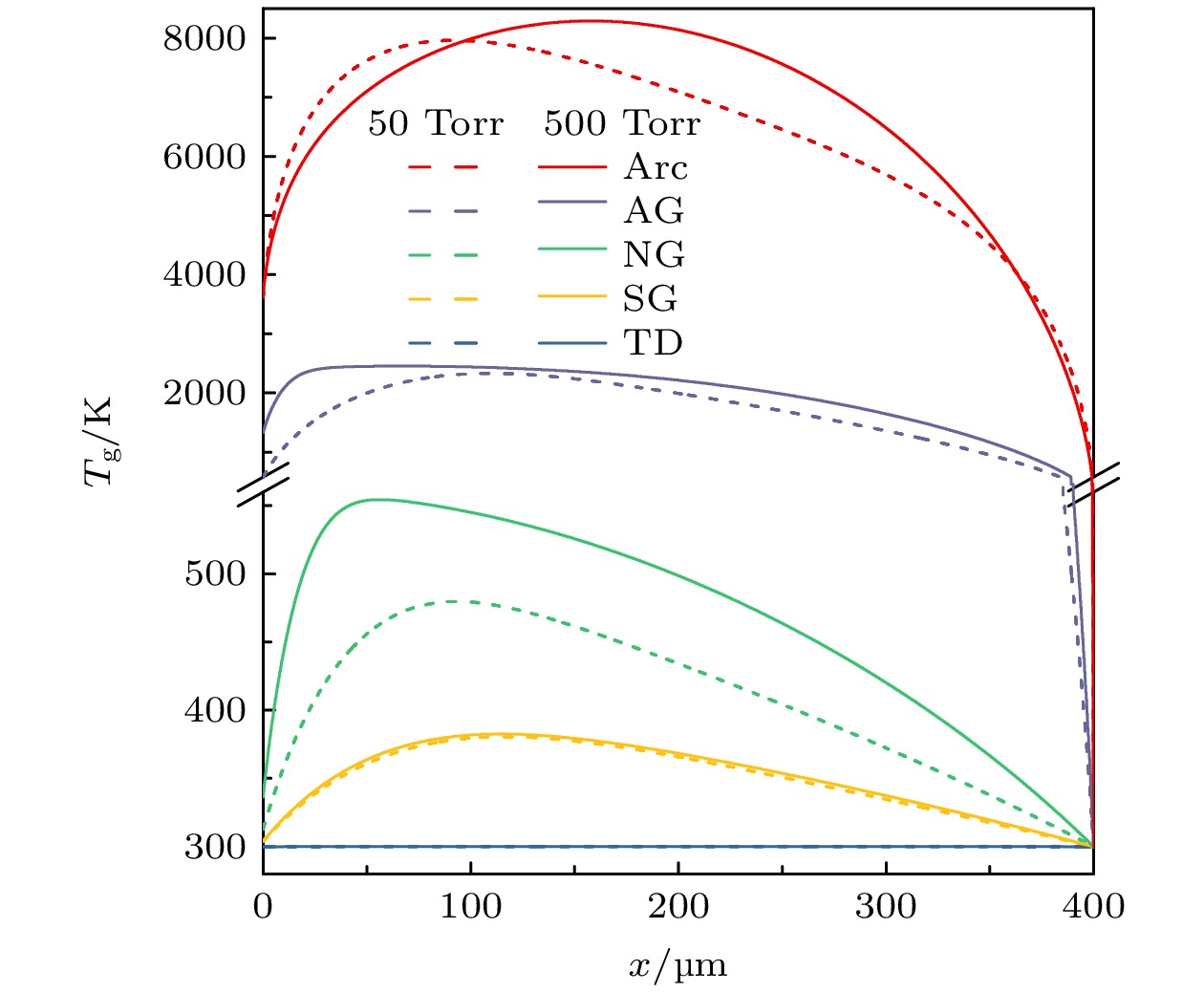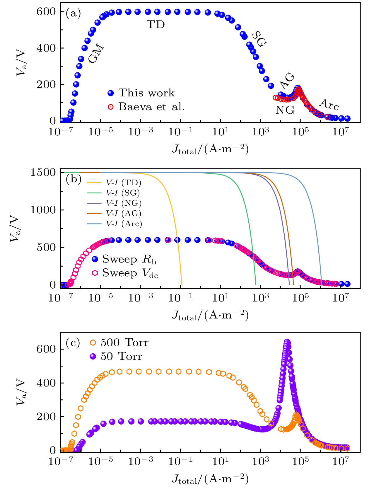 Numerical simulation has become an indispensable tool in the study of gas discharge. However, it is typically used to reveal microscopic properties in a discharge under specific conditions. In this work, a unified fluid model for discharge simulation is introduced in detail. The model includes the continuity equation, the energy conservation equation of the species (electrons and heavy particles), and Poisson’s equation. The model takes into account some processes such as cathode electron emission (secondary electron emission and thermionic emission), reaction enthalpy change, gas heating, and cathode heat conduction. The full current-voltage characteristic (CVC) curve covers a range of discharge regimes, such as the Geiger-Müller discharge regime, Townsend discharge regime, subnormal glow discharge regime, normal glow discharge regime, abnormal glow discharge regime, and arc discharge regime. The obtained CVC curve is consistent with the results in the literature, confirming the validity of the unified fluid model. On this basis, the CVC curves are obtained in a wide pressure range of 50–3000 Torr. Simulation studies are carried out focusing on the discharge characteristics for microgap of 400 µm at pressures of 50 Torr and 500 Torr, respectively. The distributions of typical discharge parameters under different pressure conditions are analyzed by comparison. The results indicate that the electric field in the discharge gap is uniform, and that the space charge effect can be ignored in Townsend discharge regime. The cathode fall region and the quasi-neutral region both appear in glow discharge regime, and the space charge effect is significant. In particular, the electric field reversal occurs in abnormal discharge regime due to the heightened particle density gradient. The electron density reaches about 1022m–3in arc discharge regime dominated by thermionic emission and thermal ionization, with the current density increasing. The gas temperature peak is 11850 K when the pressure is 500 Torr, and the cathode surface is heated to nearly 4000 K due to heat conduction. The present model can be used to simulate gas discharge across a wide range of condition parameters, promoting and expanding fluid model applications, and assisting in a more comprehensive investigation of discharge parameter properties.