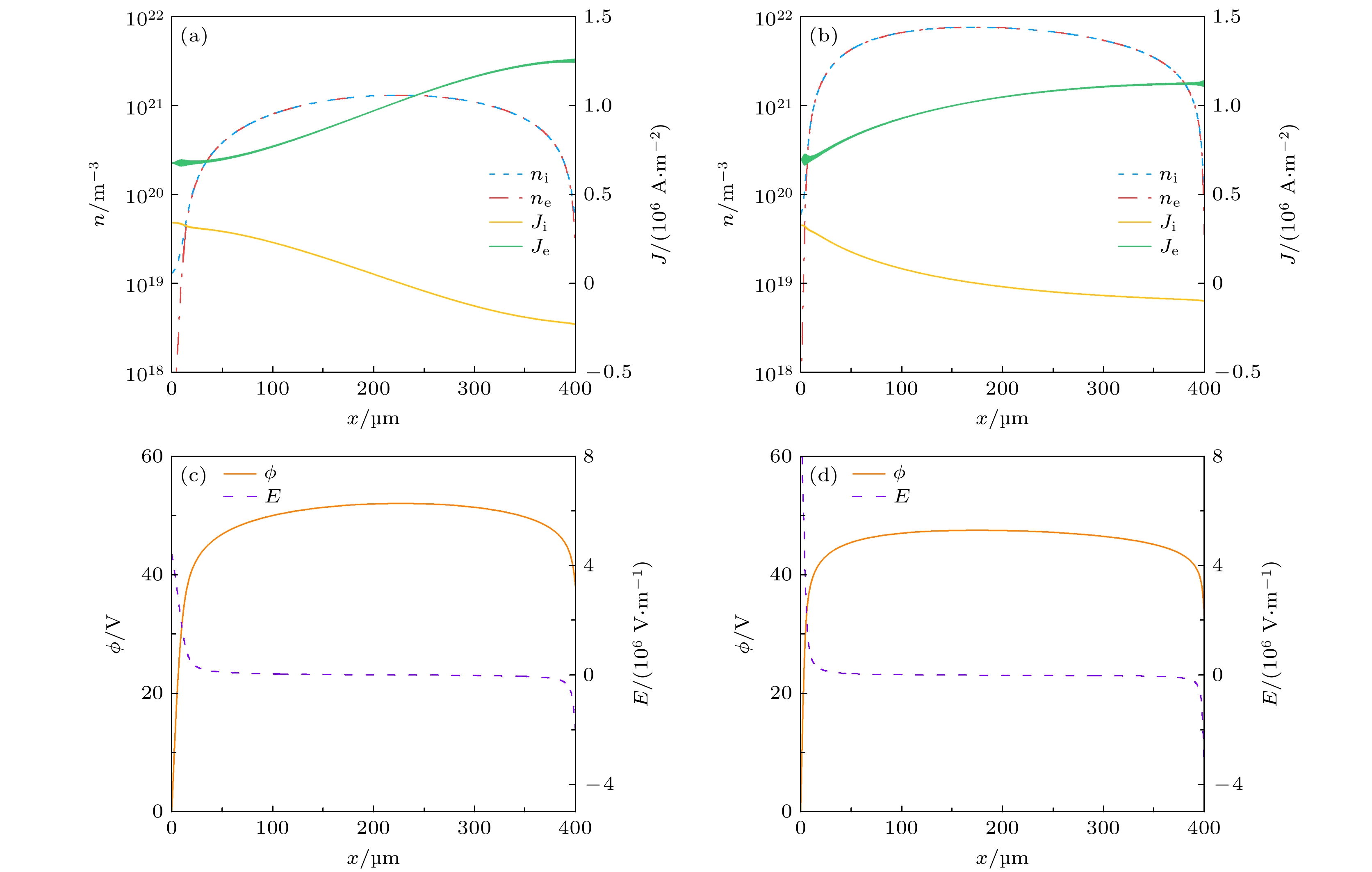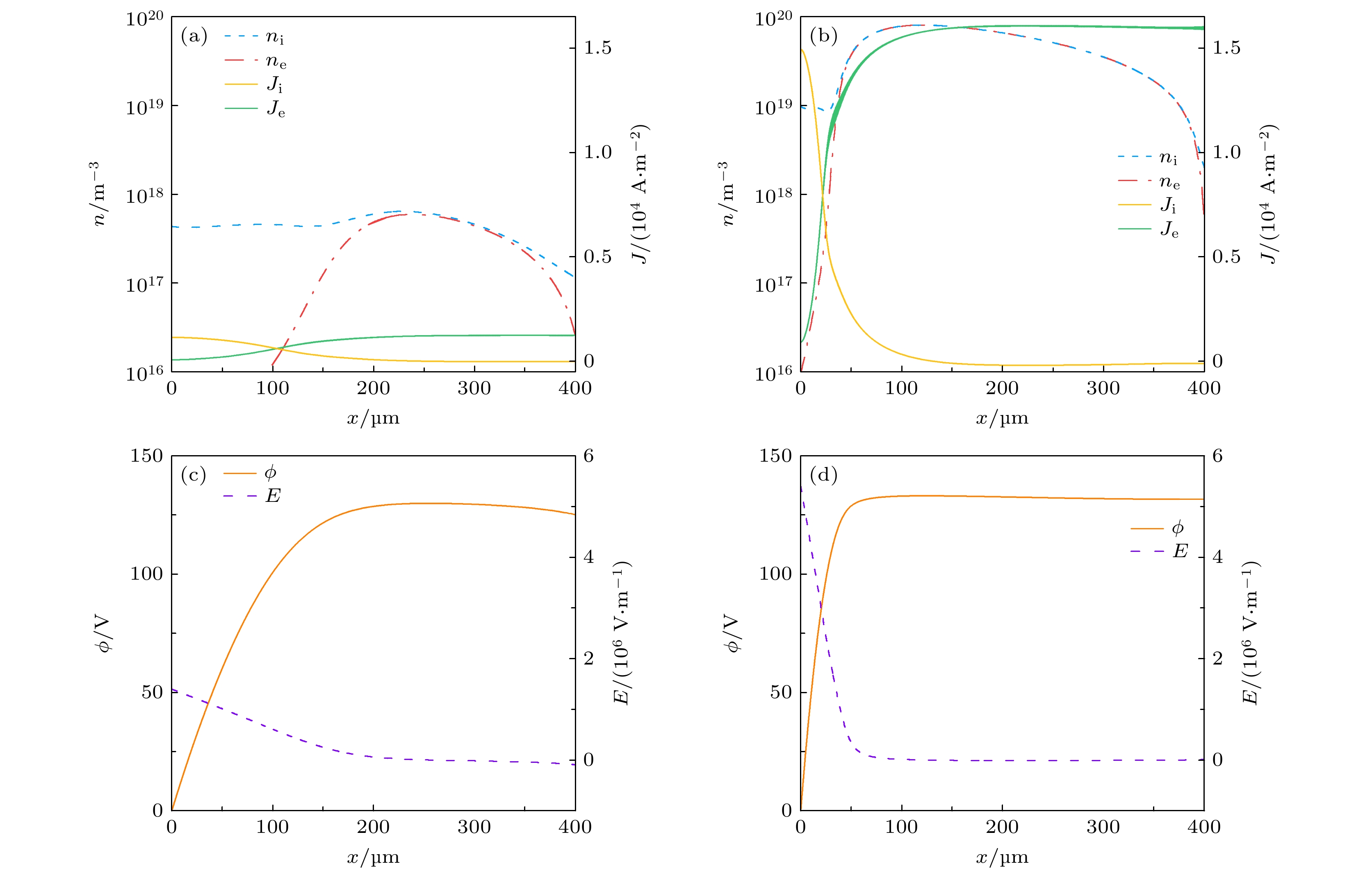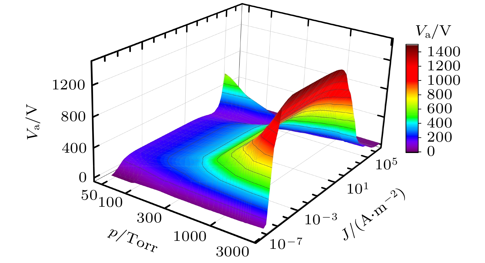 Numerical simulation has become an indispensable tool in the study of gas discharge. However, it is typically used to reveal microscopic properties in a discharge under specific conditions. In this work, a unified fluid model for discharge simulation is introduced in detail. The model includes the continuity equation, the energy conservation equation of the species (electrons and heavy particles), and Poisson’s equation. The model takes into account some processes such as cathode electron emission (secondary electron emission and thermionic emission), reaction enthalpy change, gas heating, and cathode heat conduction. The full current-voltage characteristic (CVC) curve covers a range of discharge regimes, such as the Geiger-Müller discharge regime, Townsend discharge regime, subnormal glow discharge regime, normal glow discharge regime, abnormal glow discharge regime, and arc discharge regime. The obtained CVC curve is consistent with the results in the literature, confirming the validity of the unified fluid model. On this basis, the CVC curves are obtained in a wide pressure range of 50–3000 Torr. Simulation studies are carried out focusing on the discharge characteristics for microgap of 400 µm at pressures of 50 Torr and 500 Torr, respectively. The distributions of typical discharge parameters under different pressure conditions are analyzed by comparison. The results indicate that the electric field in the discharge gap is uniform, and that the space charge effect can be ignored in Townsend discharge regime. The cathode fall region and the quasi-neutral region both appear in glow discharge regime, and the space charge effect is significant. In particular, the electric field reversal occurs in abnormal discharge regime due to the heightened particle density gradient. The electron density reaches about 1022m–3in arc discharge regime dominated by thermionic emission and thermal ionization, with the current density increasing. The gas temperature peak is 11850 K when the pressure is 500 Torr, and the cathode surface is heated to nearly 4000 K due to heat conduction. The present model can be used to simulate gas discharge across a wide range of condition parameters, promoting and expanding fluid model applications, and assisting in a more comprehensive investigation of discharge parameter properties.