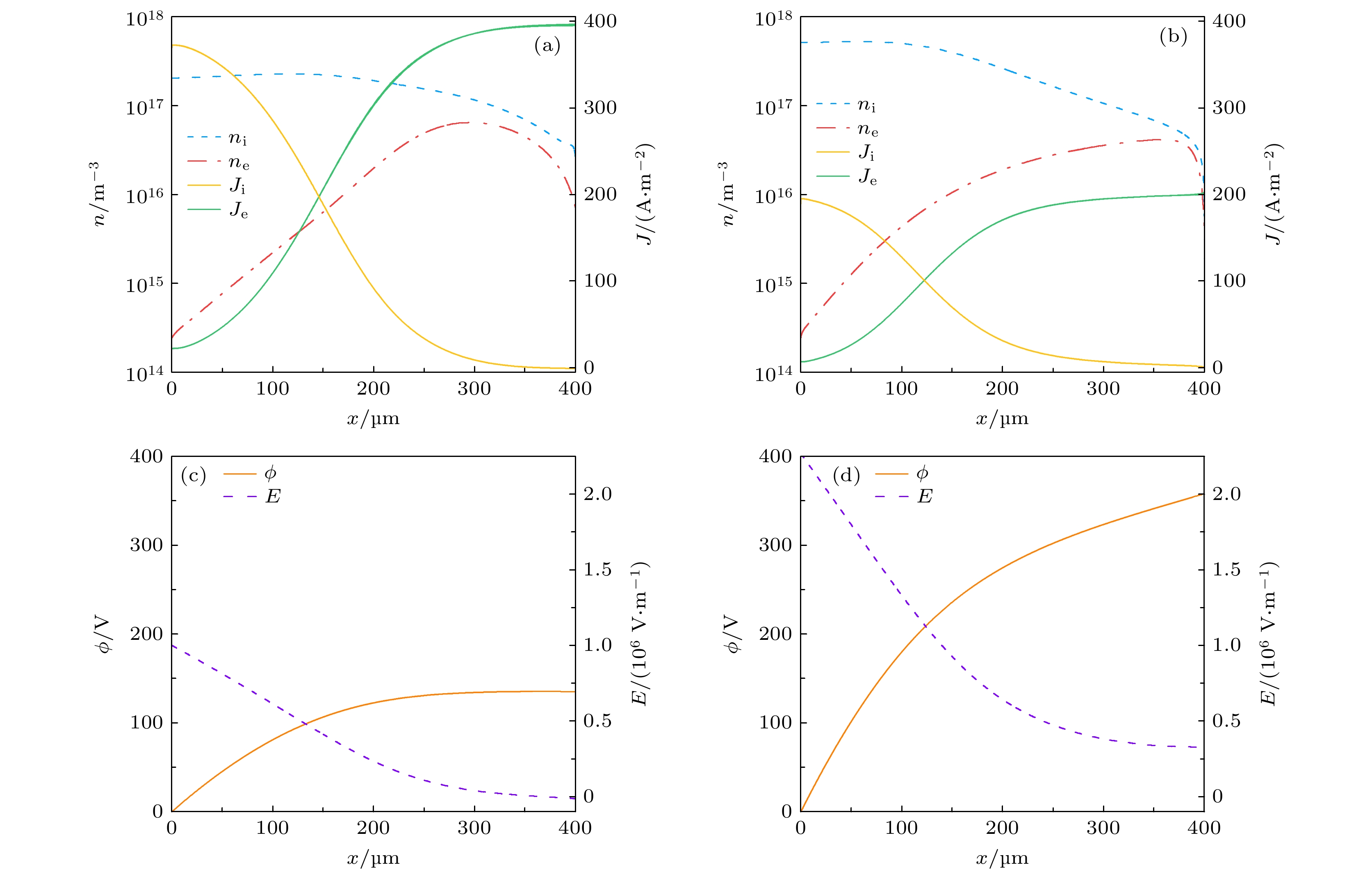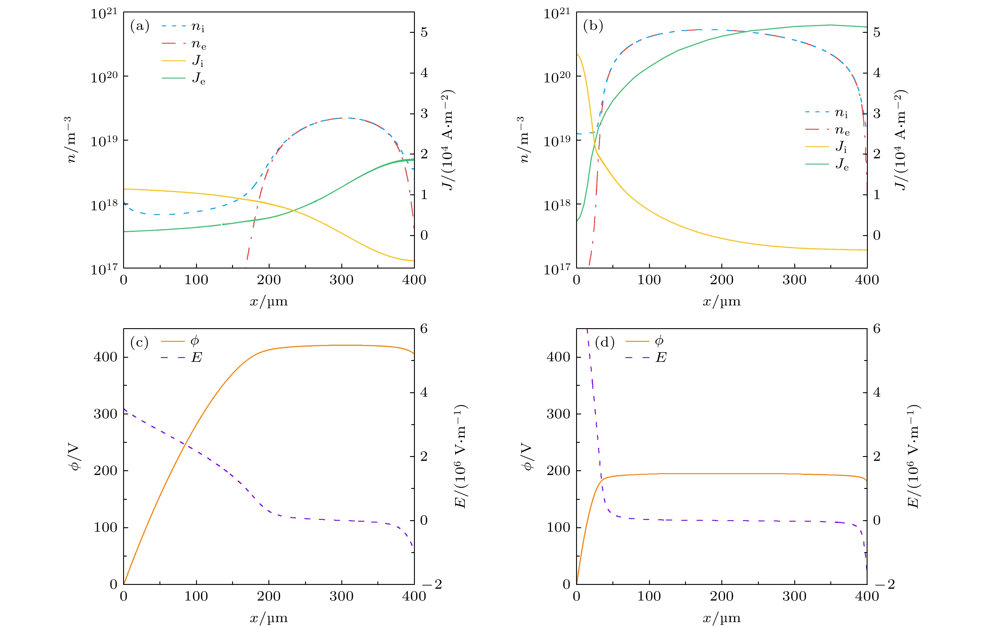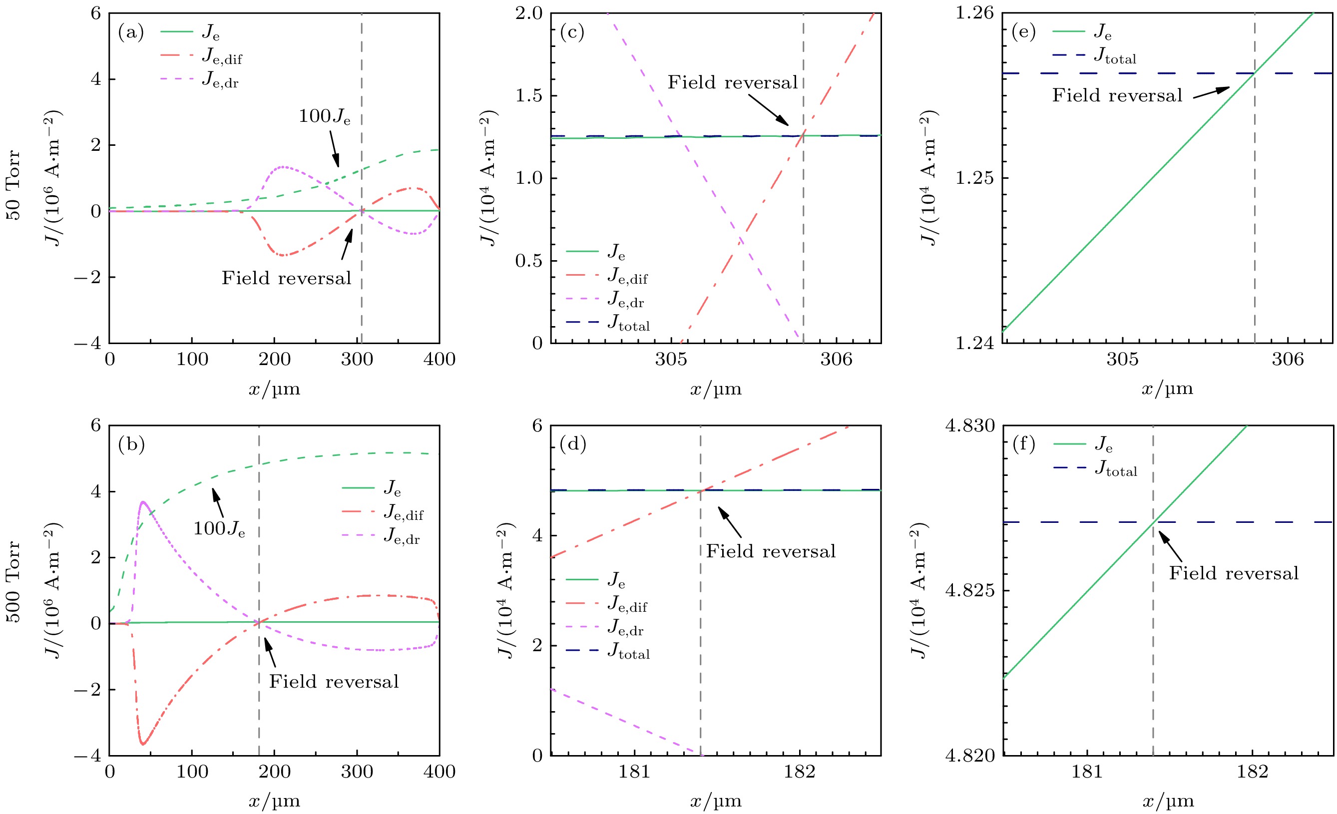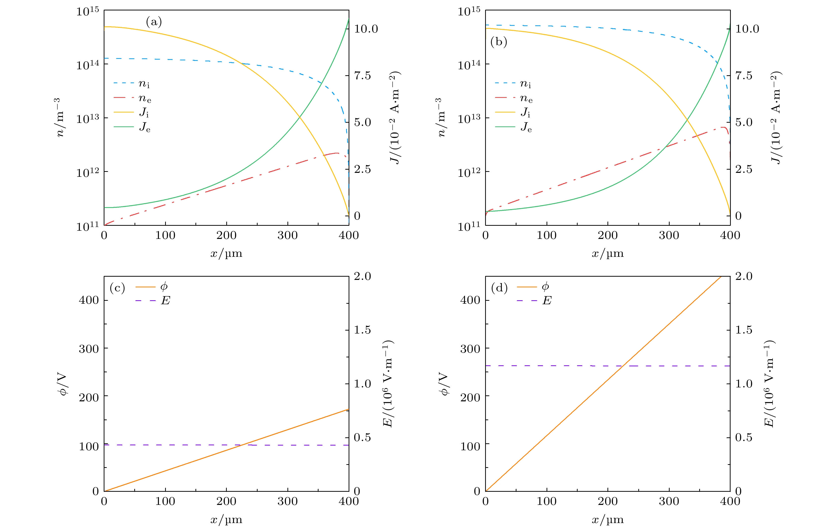 Numerical simulation has become an indispensable tool in the study of gas discharge. However, it is typically used to reveal microscopic properties in a discharge under specific conditions. In this work, a unified fluid model for discharge simulation is introduced in detail. The model includes the continuity equation, the energy conservation equation of the species (electrons and heavy particles), and Poisson’s equation. The model takes into account some processes such as cathode electron emission (secondary electron emission and thermionic emission), reaction enthalpy change, gas heating, and cathode heat conduction. The full current-voltage characteristic (CVC) curve covers a range of discharge regimes, such as the Geiger-Müller discharge regime, Townsend discharge regime, subnormal glow discharge regime, normal glow discharge regime, abnormal glow discharge regime, and arc discharge regime. The obtained CVC curve is consistent with the results in the literature, confirming the validity of the unified fluid model. On this basis, the CVC curves are obtained in a wide pressure range of 50–3000 Torr. Simulation studies are carried out focusing on the discharge characteristics for microgap of 400 µm at pressures of 50 Torr and 500 Torr, respectively. The distributions of typical discharge parameters under different pressure conditions are analyzed by comparison. The results indicate that the electric field in the discharge gap is uniform, and that the space charge effect can be ignored in Townsend discharge regime. The cathode fall region and the quasi-neutral region both appear in glow discharge regime, and the space charge effect is significant. In particular, the electric field reversal occurs in abnormal discharge regime due to the heightened particle density gradient. The electron density reaches about 1022m–3in arc discharge regime dominated by thermionic emission and thermal ionization, with the current density increasing. The gas temperature peak is 11850 K when the pressure is 500 Torr, and the cathode surface is heated to nearly 4000 K due to heat conduction. The present model can be used to simulate gas discharge across a wide range of condition parameters, promoting and expanding fluid model applications, and assisting in a more comprehensive investigation of discharge parameter properties.