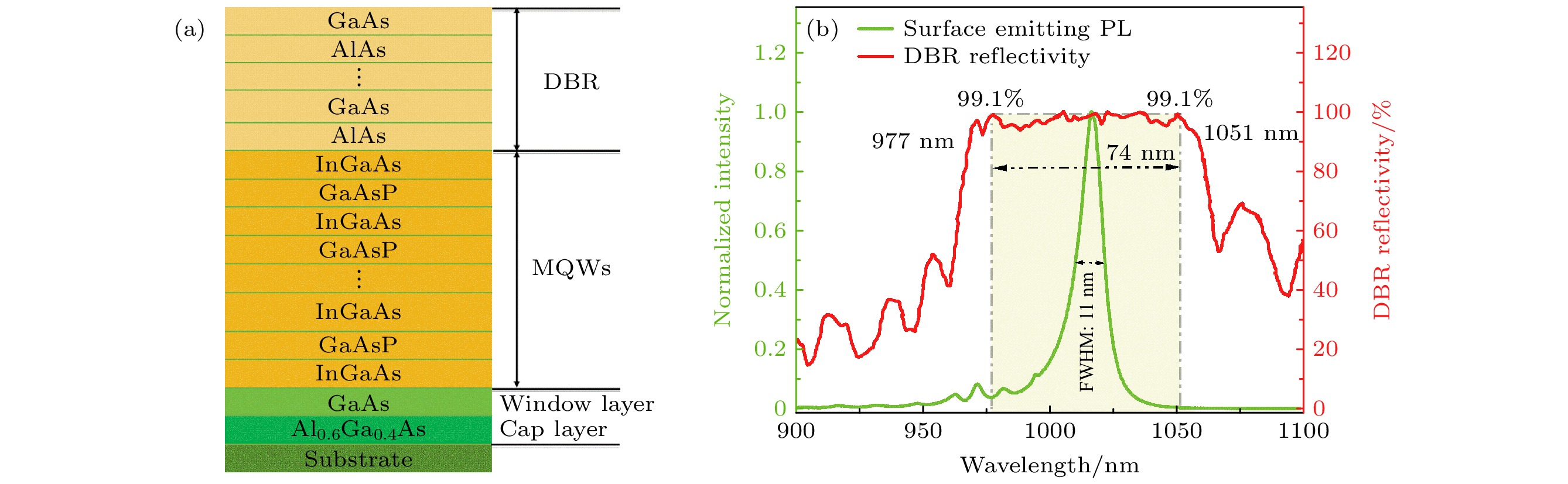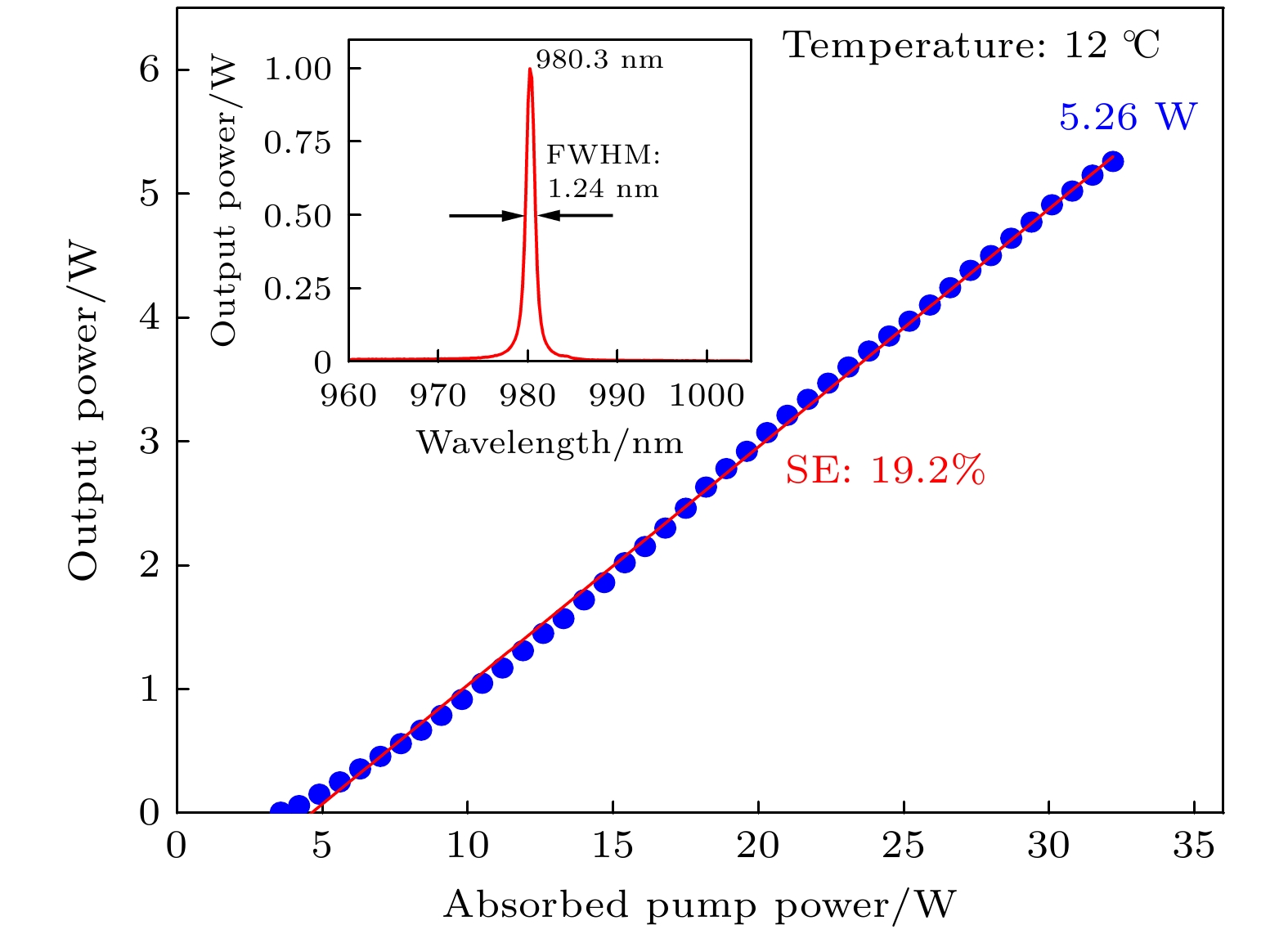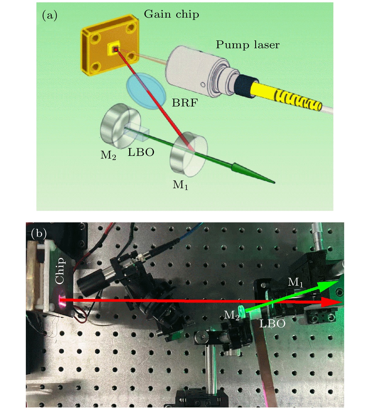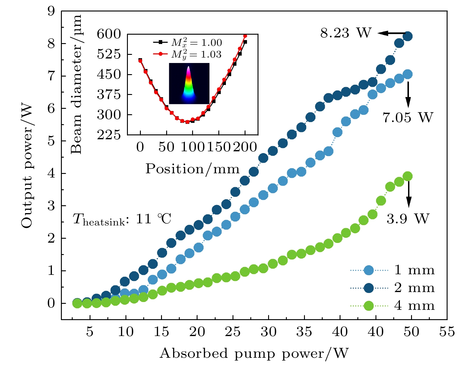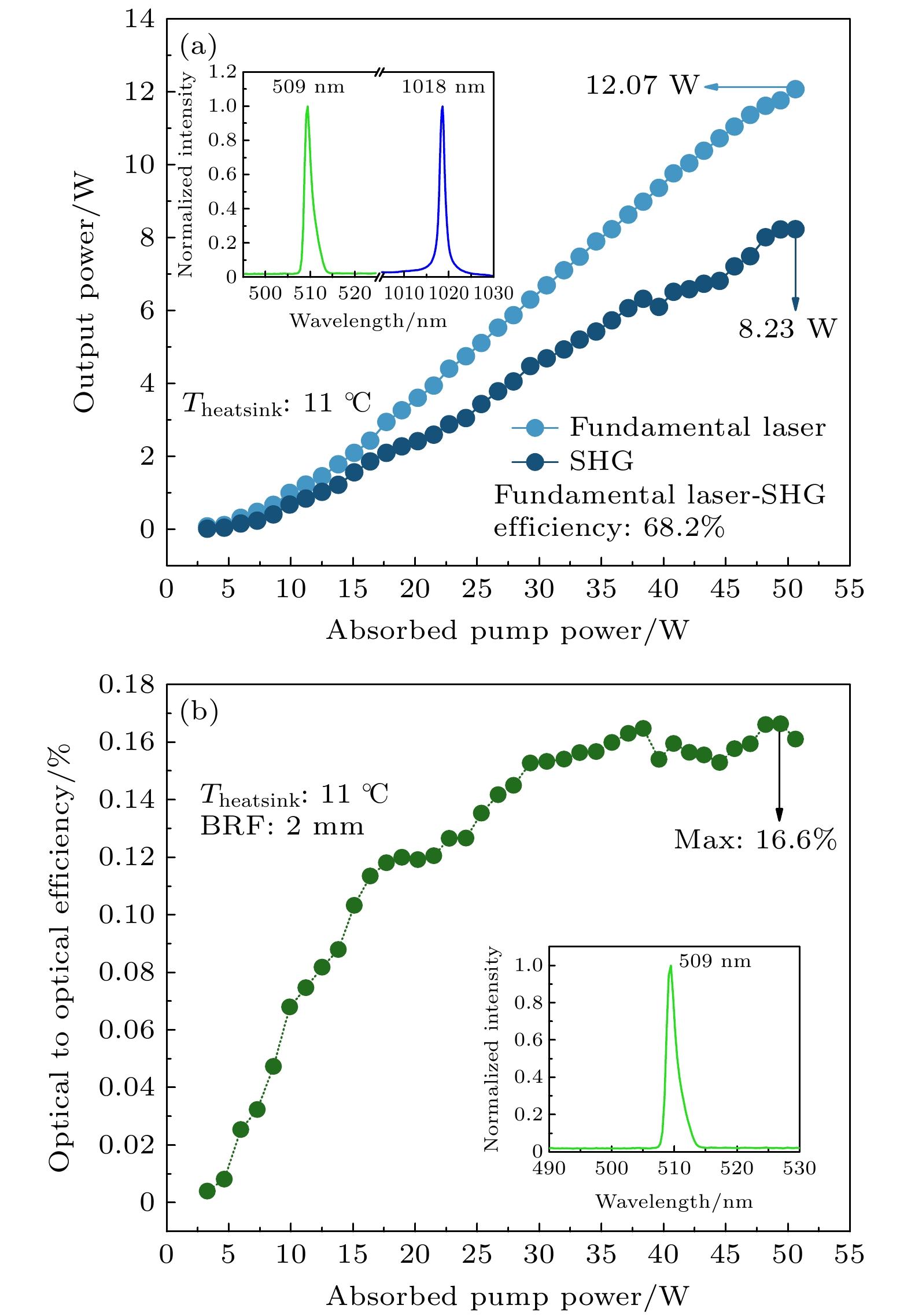High power widely tunable green lasers have potential applications in many fields such as biomedicine, lidar, laser spectroscopy, laser display, underwater wireless optical communication, and fine processing of nonferrous metals. Vertical-external-cavity surface-emitting lasers, also known as semiconductor disk lasers, have the advantages of high power, good beam quality, and wide bandwidth of gain medium. In this work, a gain chip with a reverse-growth epitaxy structure and an emitting wavelength of 1018 nm is designed. In the DBR reflection spectrum, a bandwidth of 74 nm is achieved above a reflectivity of greater than 99.1%, laying a solid foundation for achieving high-power widely tunable output. The laser cavity combines a 1018 nm semiconductor gain chip, a folded mirror, and a plane mirror to construct a compact V-type resonant cavity. A class-I phase-matched LBO nonlinear crystal with a length of 10 mm is placed at the beam waist of the cavity to realize an efficient frequency doubling process to produce a 509 nm green laser. To meet the requirement for the polarization during frequency conversion and to tune the oscillating wavelength of the laser, a birefringent filter (BRF) is employed in the laser resonant cavity. When the thickness of the used BRF is 1 mm, the obtained wavelength tuning range of the fundamental laser and the frequency doubled green laser are 47.1 nm and 20.1 nm, respectively, showing a good tuning capability of the laser. The laser’s performance varies with the thickness of the BRF. When using a 2 mm BRF, a maximum power output of the frequency-doubled green laser reaches 8.23 W during continuous tuning, indicating an ideal compatibility of wide tuning characteristics with a high power output. Meanwhile, its beam qualityM2factors are 1.00 and 1.03 in thex- andy-direction, respectively, demonstrating a near diffraction-limited excellent beam quality. This green laser also possesses a frequency doubling conversion efficiency of up to 68.2%, which can efficiently converse the fundamental laser into the frequency doubled green laser. The optical-to-optical conversion efficiency from the absorbed pump light to the frequency-doubled green light also reaches 16.6%. Meanwhile, from the spectral linewidths of the green lasers under different thickness values of BRFs it is found that the thicker the BRF, the narrower the laser line width is, which is consistent with the theoretical result.