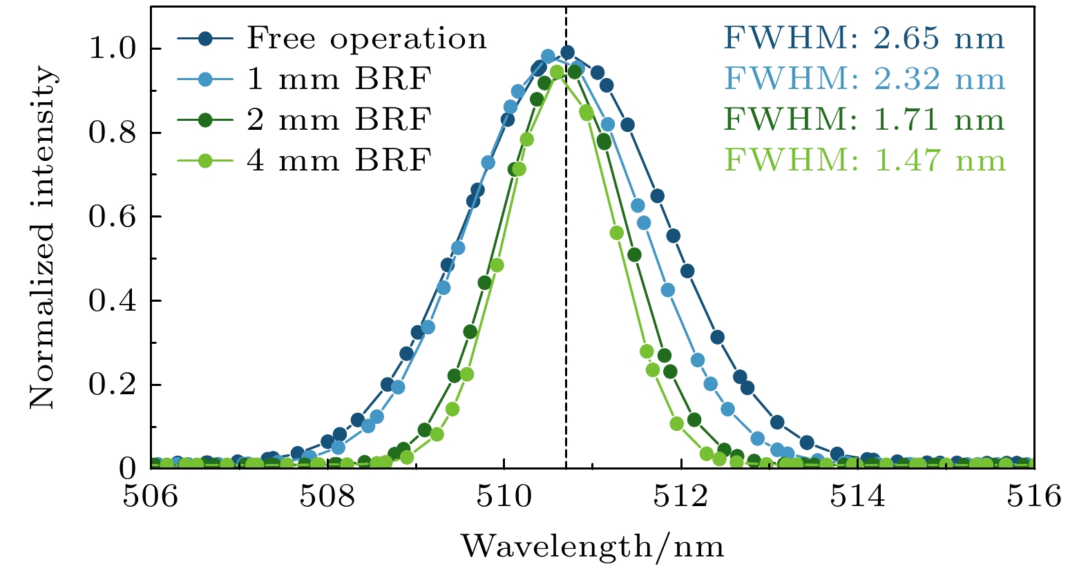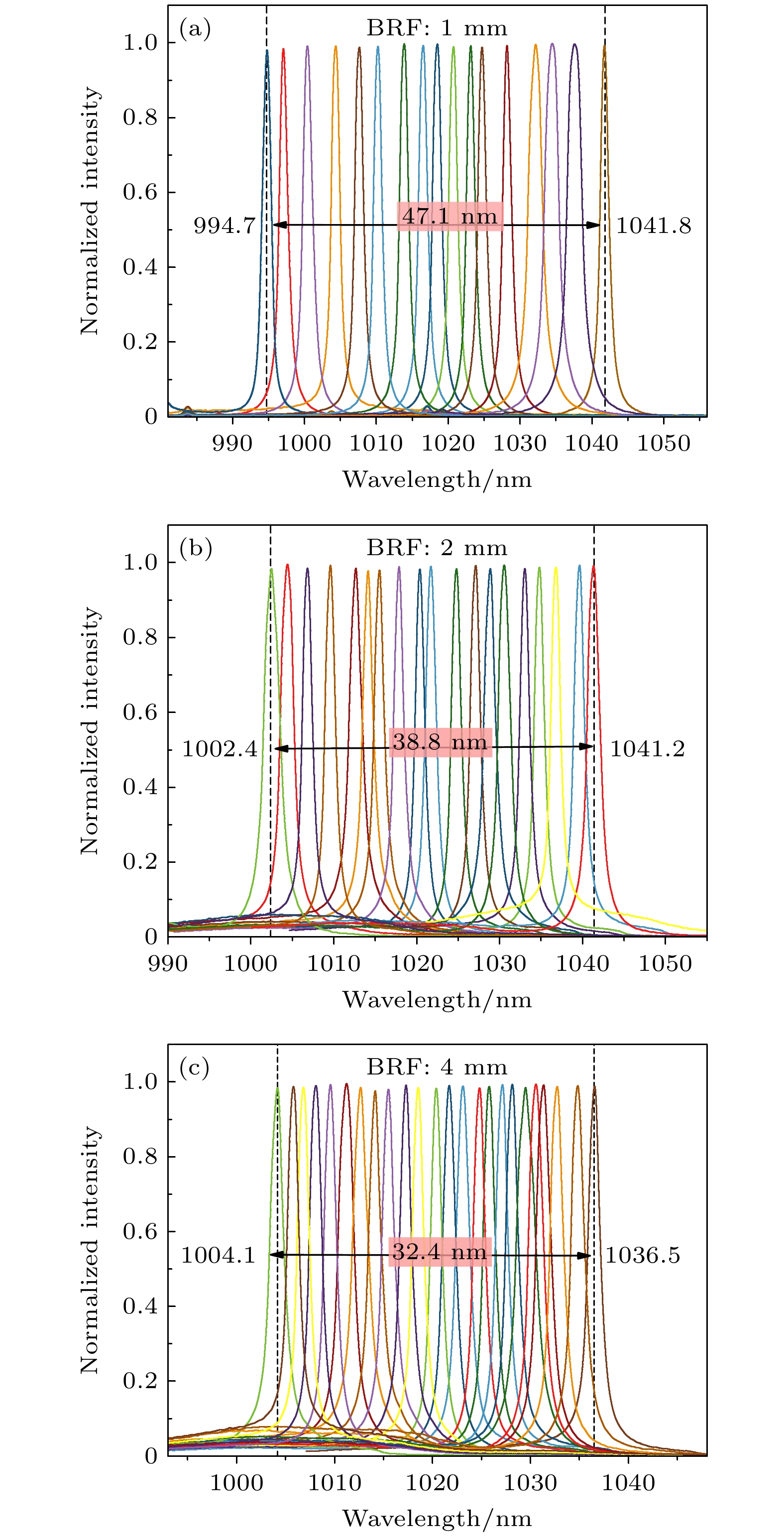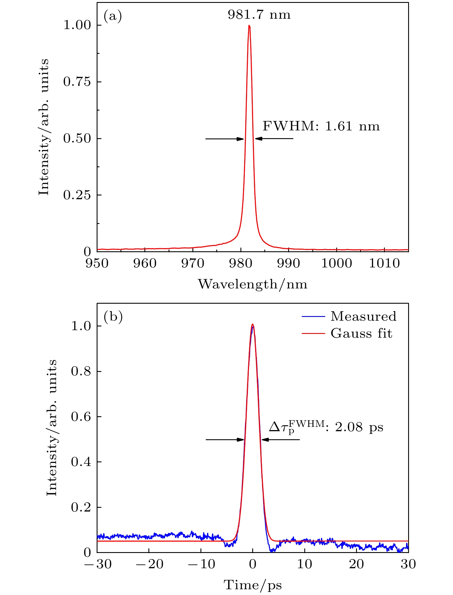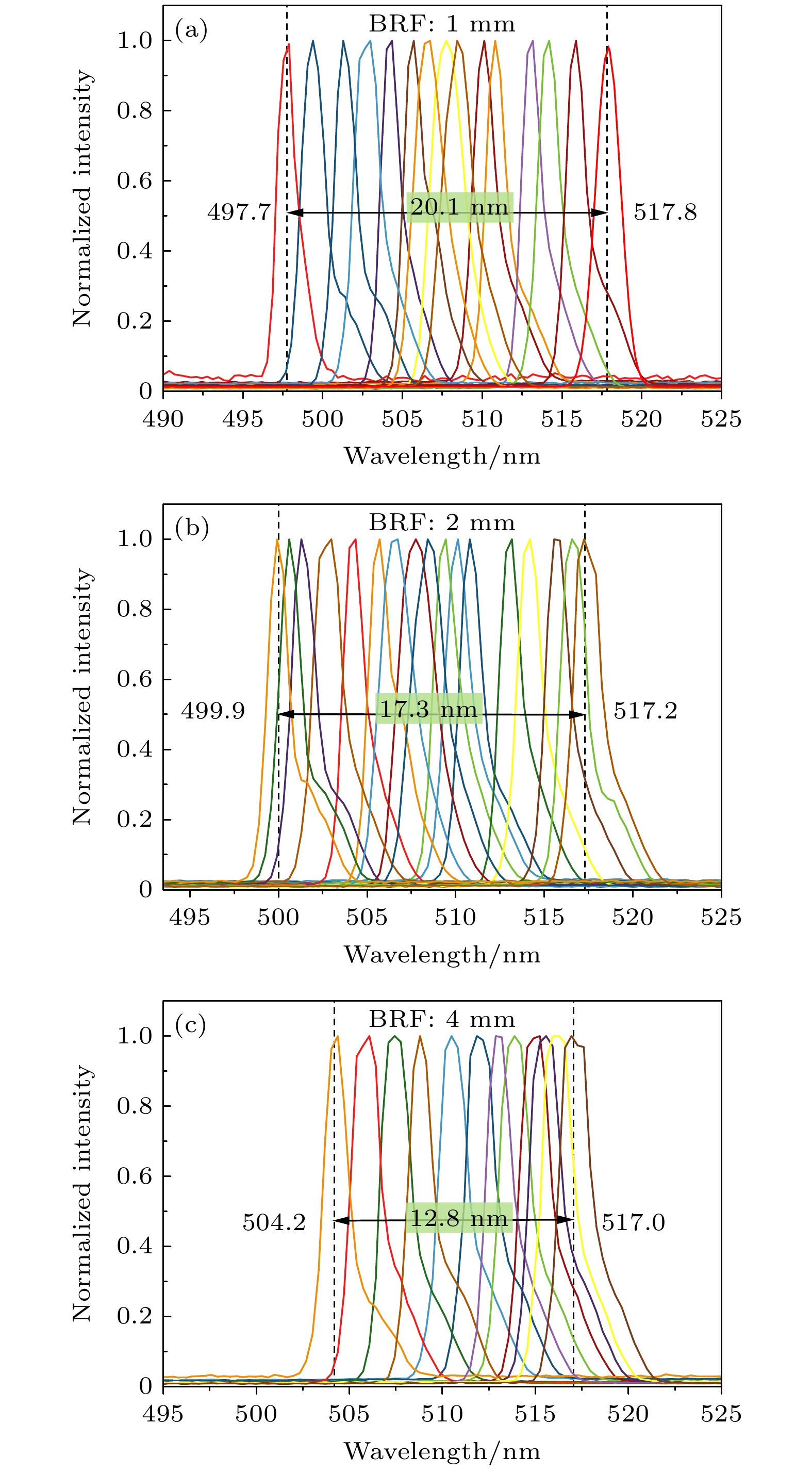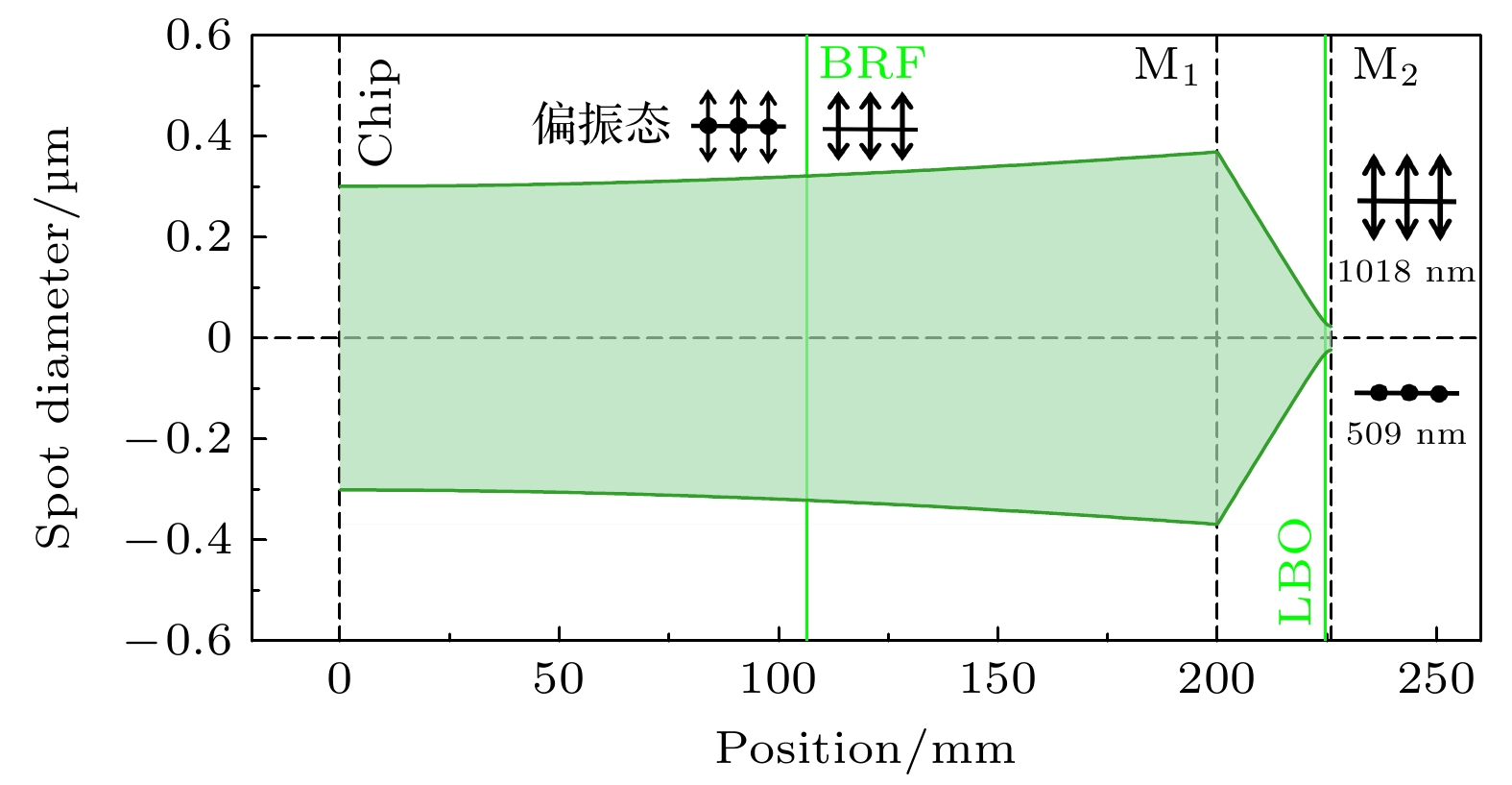 High power widely tunable green lasers have potential applications in many fields such as biomedicine, lidar, laser spectroscopy, laser display, underwater wireless optical communication, and fine processing of nonferrous metals. Vertical-external-cavity surface-emitting lasers, also known as semiconductor disk lasers, have the advantages of high power, good beam quality, and wide bandwidth of gain medium. In this work, a gain chip with a reverse-growth epitaxy structure and an emitting wavelength of 1018 nm is designed. In the DBR reflection spectrum, a bandwidth of 74 nm is achieved above a reflectivity of greater than 99.1%, laying a solid foundation for achieving high-power widely tunable output. The laser cavity combines a 1018 nm semiconductor gain chip, a folded mirror, and a plane mirror to construct a compact V-type resonant cavity. A class-I phase-matched LBO nonlinear crystal with a length of 10 mm is placed at the beam waist of the cavity to realize an efficient frequency doubling process to produce a 509 nm green laser. To meet the requirement for the polarization during frequency conversion and to tune the oscillating wavelength of the laser, a birefringent filter (BRF) is employed in the laser resonant cavity. When the thickness of the used BRF is 1 mm, the obtained wavelength tuning range of the fundamental laser and the frequency doubled green laser are 47.1 nm and 20.1 nm, respectively, showing a good tuning capability of the laser. The laser’s performance varies with the thickness of the BRF. When using a 2 mm BRF, a maximum power output of the frequency-doubled green laser reaches 8.23 W during continuous tuning, indicating an ideal compatibility of wide tuning characteristics with a high power output. Meanwhile, its beam qualityM2factors are 1.00 and 1.03 in thex- andy-direction, respectively, demonstrating a near diffraction-limited excellent beam quality. This green laser also possesses a frequency doubling conversion efficiency of up to 68.2%, which can efficiently converse the fundamental laser into the frequency doubled green laser. The optical-to-optical conversion efficiency from the absorbed pump light to the frequency-doubled green light also reaches 16.6%. Meanwhile, from the spectral linewidths of the green lasers under different thickness values of BRFs it is found that the thicker the BRF, the narrower the laser line width is, which is consistent with the theoretical result.